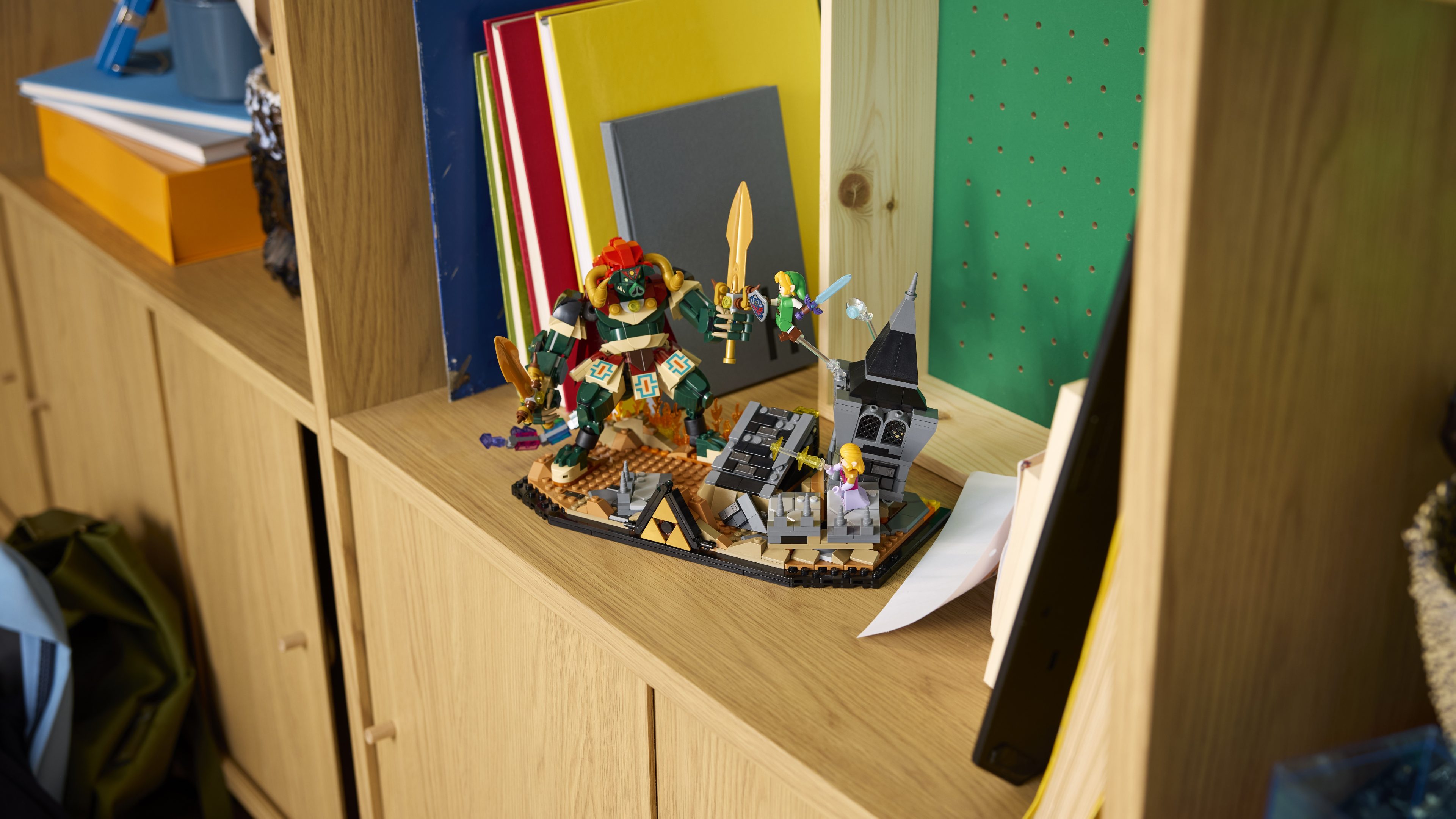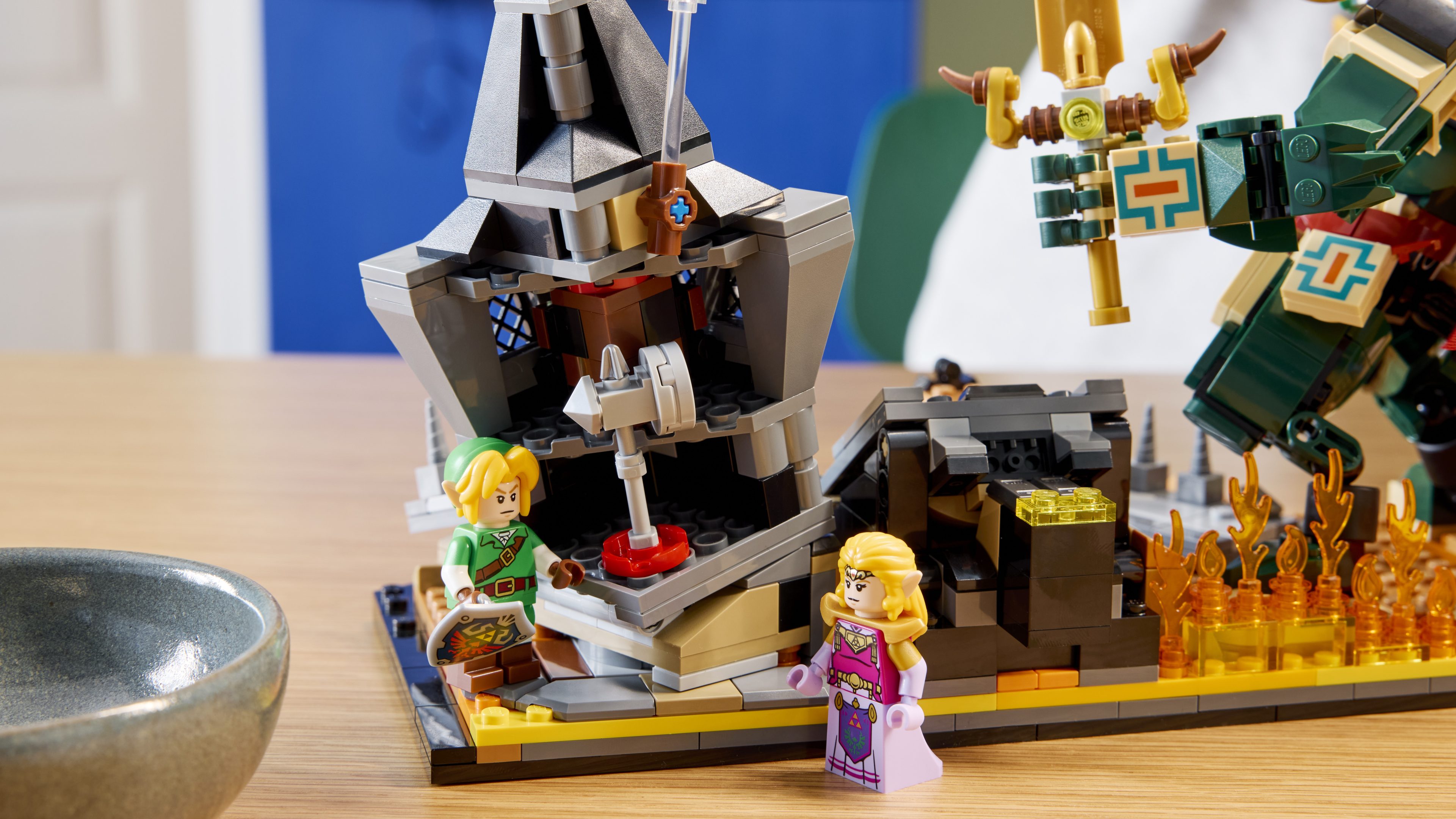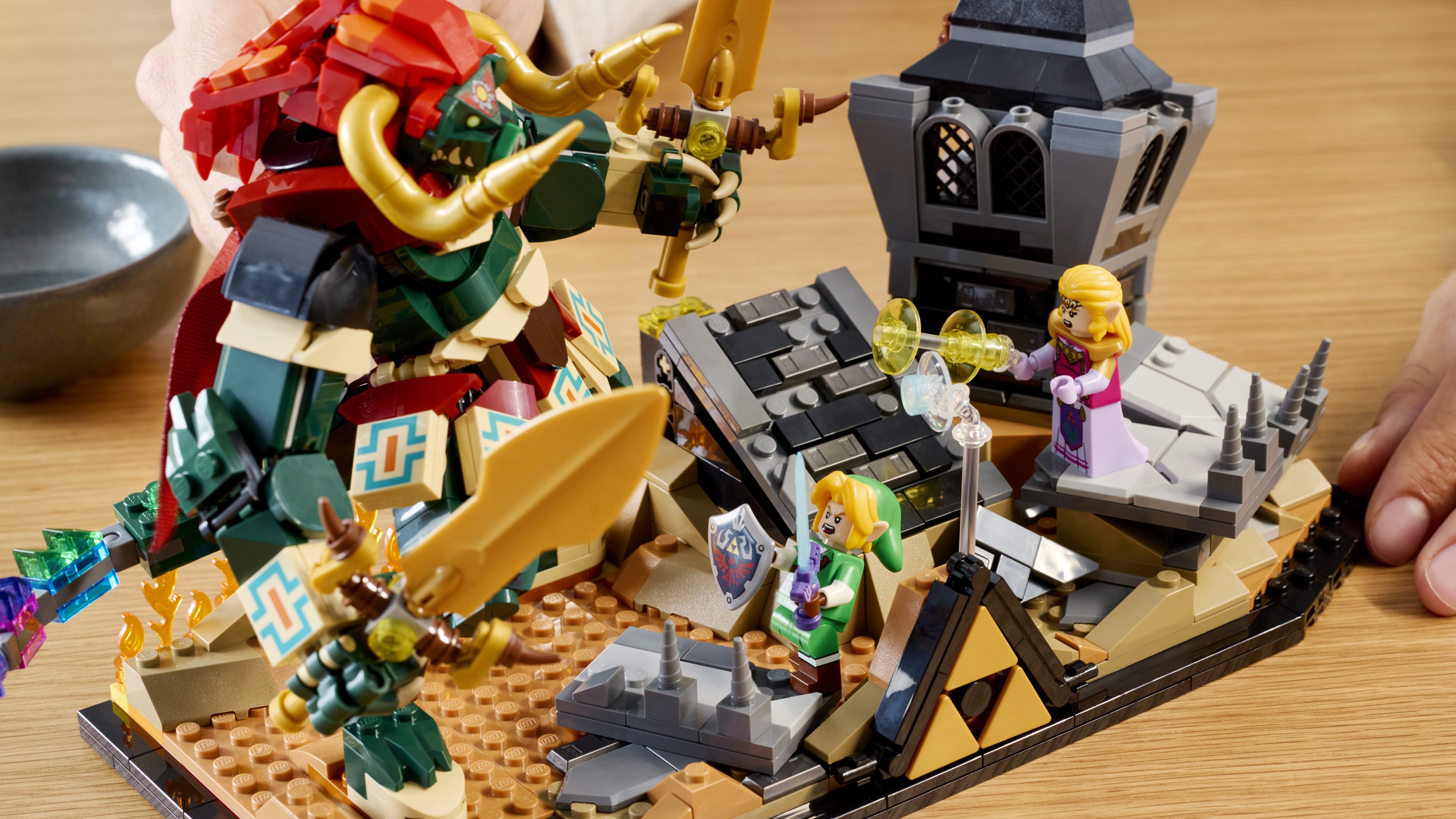 « Composé de 1 003 pièces, le set capture toute l’intensité dramatique de l’affrontement final, avec une tour du château en ruines et des débris dissimulant trois cœurs de vie. En appuyant sur un bouton, les ruines éclatent, le couvercle s’ouvre et Ganondorf sort des débris, prêt à combattre ! »