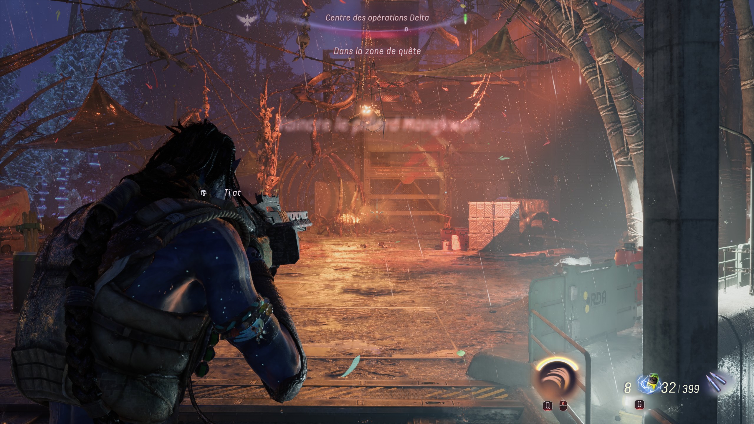 On se rassurera donc comme on peut avec notamment sa direction artistique, plus sombre et surprenante dans le bon sens. Effectivement, la forêt colorée et paisible de Pandora se transforme en un vrai brasier grisâtre et cendreux par le passage des Mangwan et de la RDA. Le contraste entre le jeu de base et cette extension est globalement rafraichissant. Le rouge est aussi ultra présent dans les teintes des décors, voulant certainement montrer la menace Mangkwan omniprésente. Concrètement, si le terrain de jeu est relativement peu inspiré car il reprend grossièrement la grande carte ouverte du jeu d’origine, le changement d’ambiance graphique donne une légère bouffée d’air frais, et on prend avec plaisir.