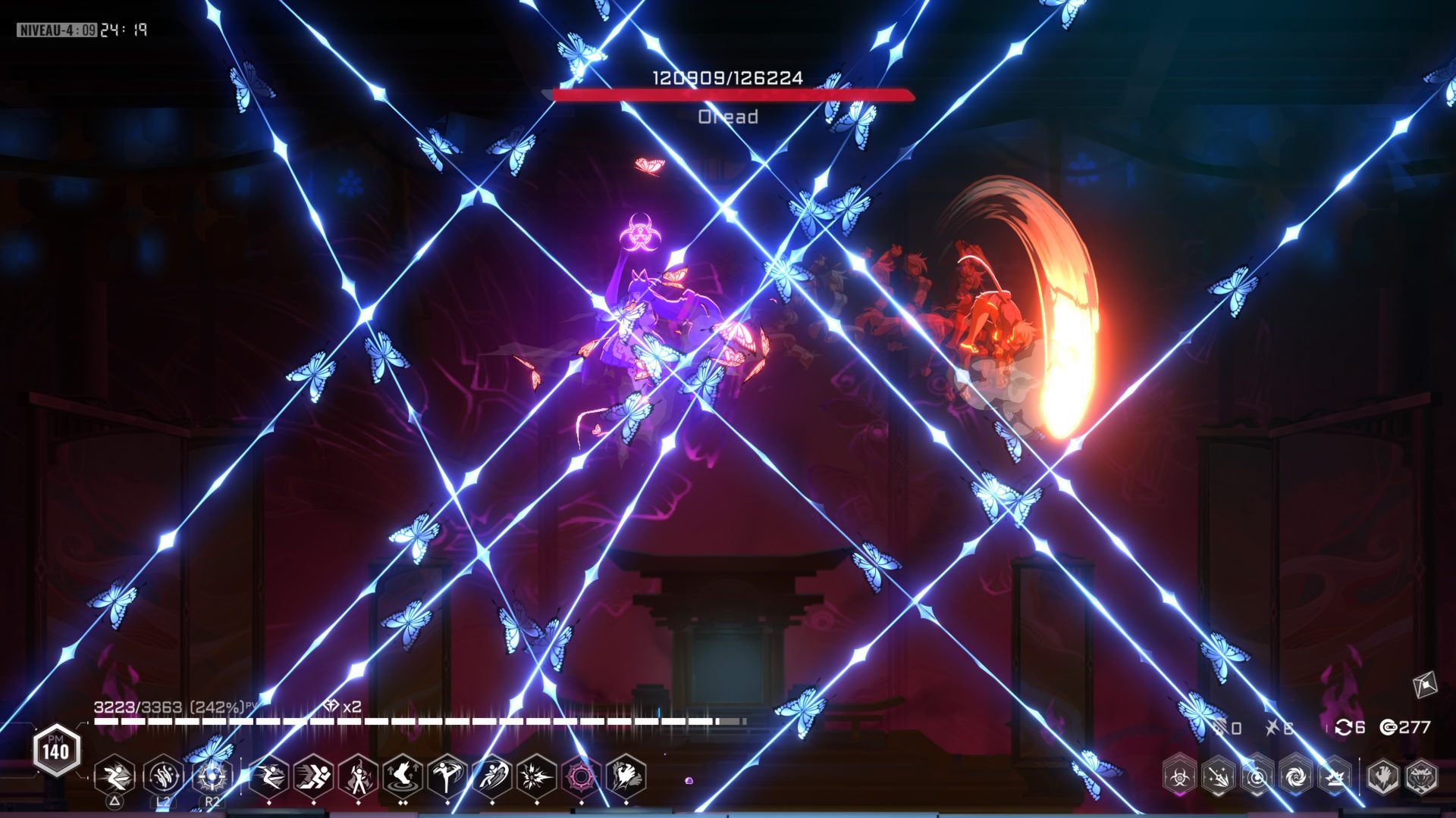 Au moins, BlazBlue Entropy Effect X reste amusant et prenant. Perdre n’est jamais vraiment frustrant, même lorsque la lisibilité devient critique à l’écran. Elle le sera souvent, trop souvent. C’est l’entropie qui se manifeste également en jeu avec l’écran surchargé et notre personnage impossible à déceler. Nous sommes loin de pouvoir réagir avec la minutie et la précision d’un jeu de combat BlazBlue. Heureusement que bourriner machinalement permet, via des malentendus, de s’en sortir la tête haute. Paradoxalement, ce chaos, cette entropie, apporte son lot de jouissance visuelle comme nous le mentionnions brièvement plus tôt. Au prix de toute compréhension de ce qui peut se dérouler sous nos yeux, cela va sans dire.