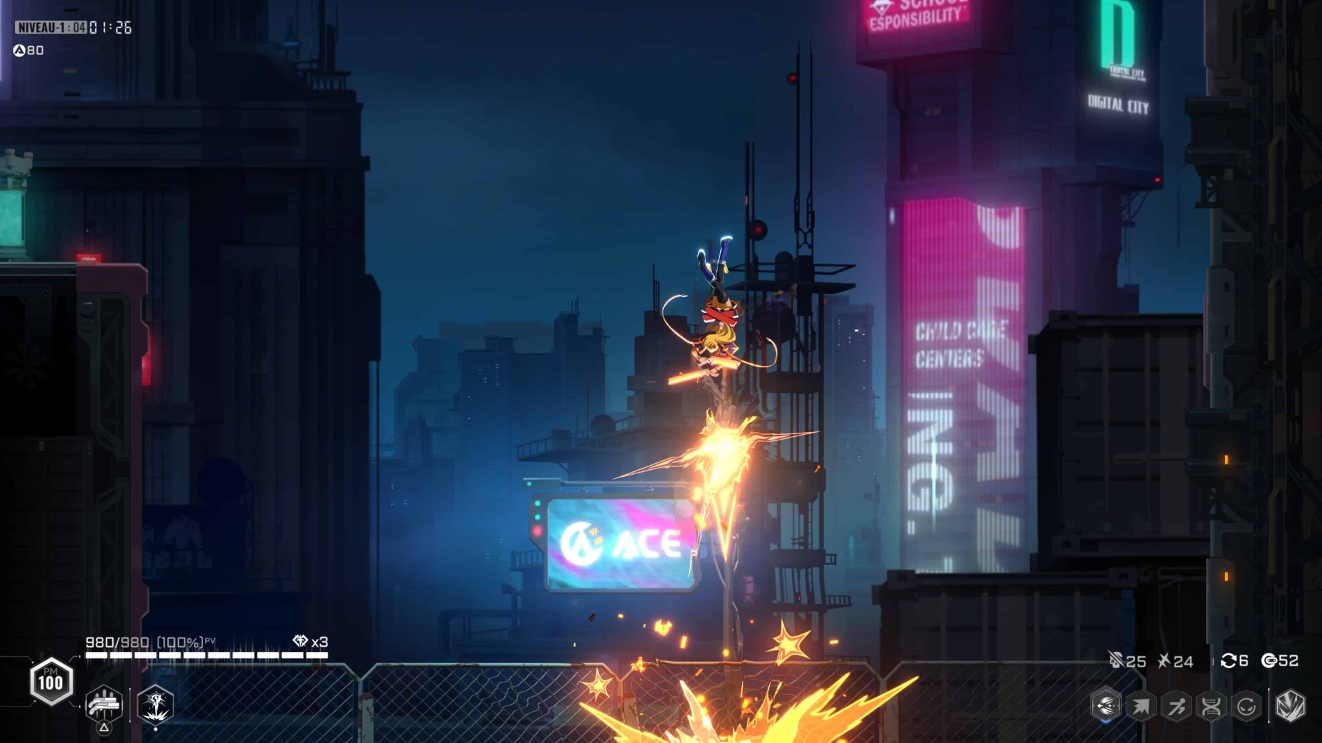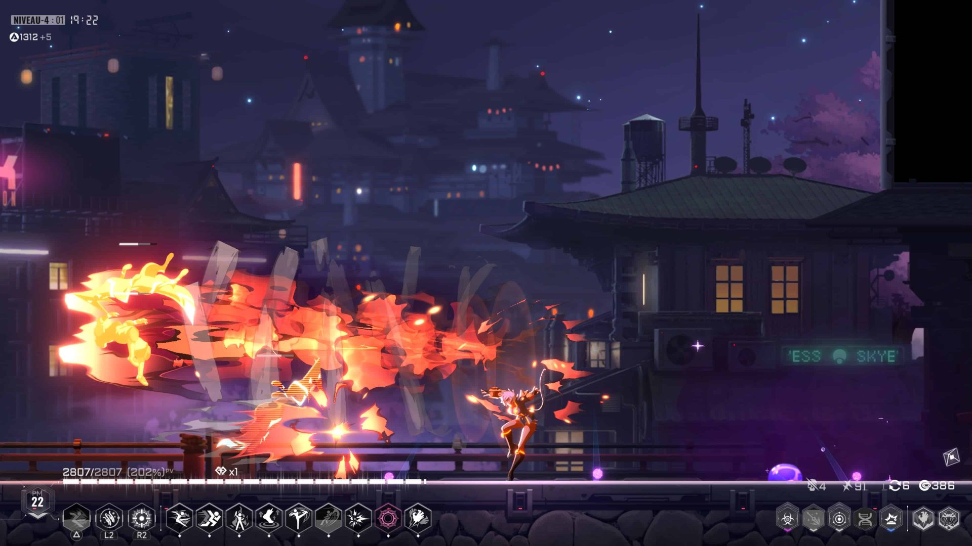 Autant de combattants, c’est autant de manières différentes de jouer. Changer de personnages, c’est convoquer d’autres sensations comme sait si bien le faire Arc System Works dans ces jeux, même si, cette fois, la réussite du game design est due au studio 91Act. Le gameplay va se développer et s’enrichir au fil des parties. On débloquera des coups supplémentaires, des effets élémentaires et autres compétences pour nous aider à venir à bout des niveaux. Il faut jouer, encore et encore, afin de réaliser des combos toujours plus impressionnants et dévastateurs. Car, au début, notre panoplie de coups sera restreinte.