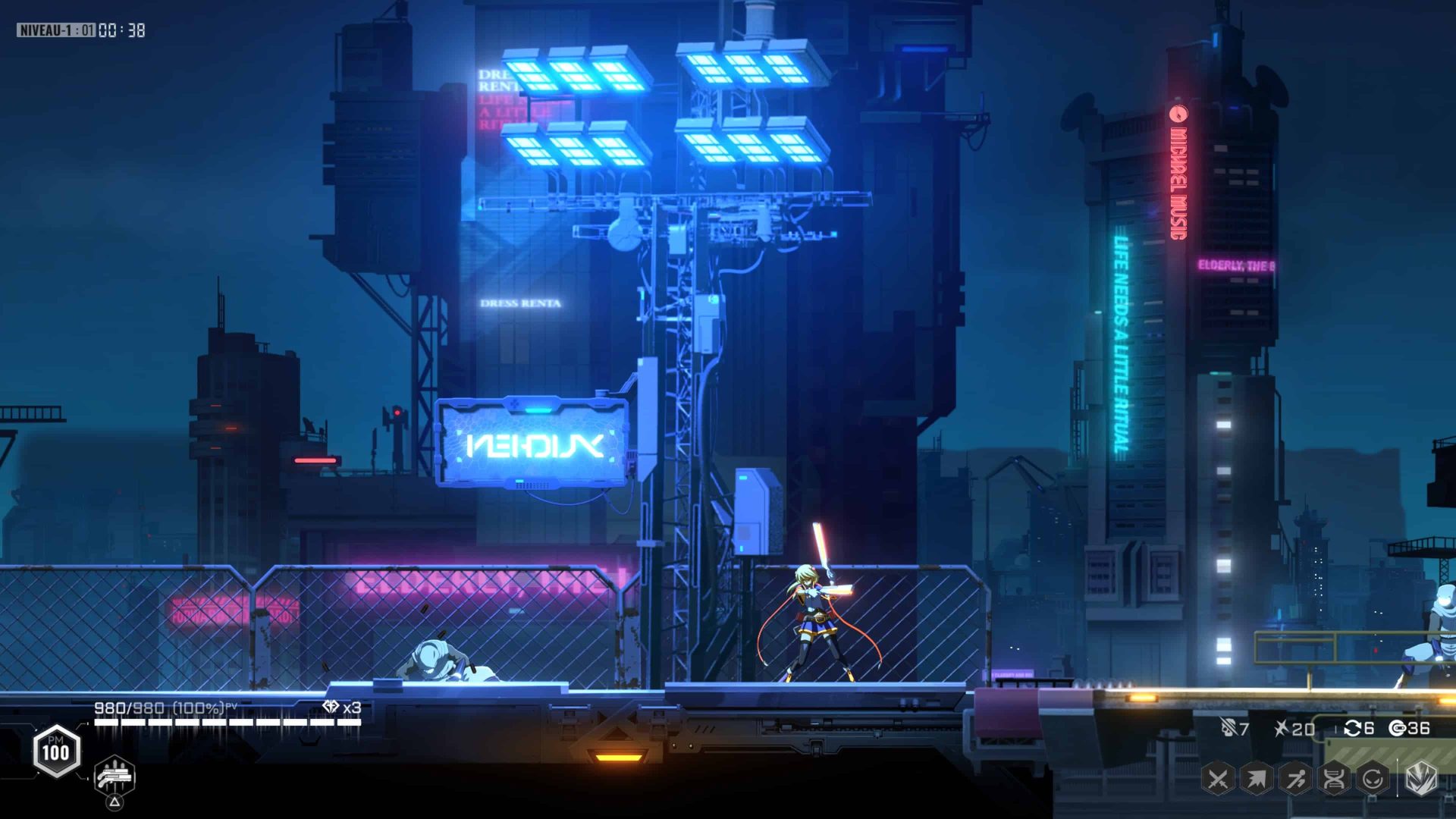 Mais ce n’était probablement pas l’objectif du studio, ni d’Arc System Works si l’on se réfère aux décisions prises sur ses licences de jeux de combat, témoignage d’une accessibilité plus prononcée. En revanche, malgré de beaux visuels, le jeu manque d’inspiration pour son level design et sa partie esthétique. L’ambiance futuriste et urbaine colle à la licence BlazBlue et la bande-son très électronique garantit cette cohérence. Une bande-son vraiment réussie d’ailleurs. Seulement voilà, les environnements peinent à se renouveler. Un écueil qui vaut aussi pour le bestiaire trop limité pour ne pas, là encore, accentuer davantage la redondance déjà désagréable, bien qu’évitable, ressenti au fil des partie qui se multiplient. Tout le monde ne s’en offusquera pas, et à raison. Néanmoins, pour nous, c’est des heures en moins à dépenser dans BlazBlue Entropy Effect X.