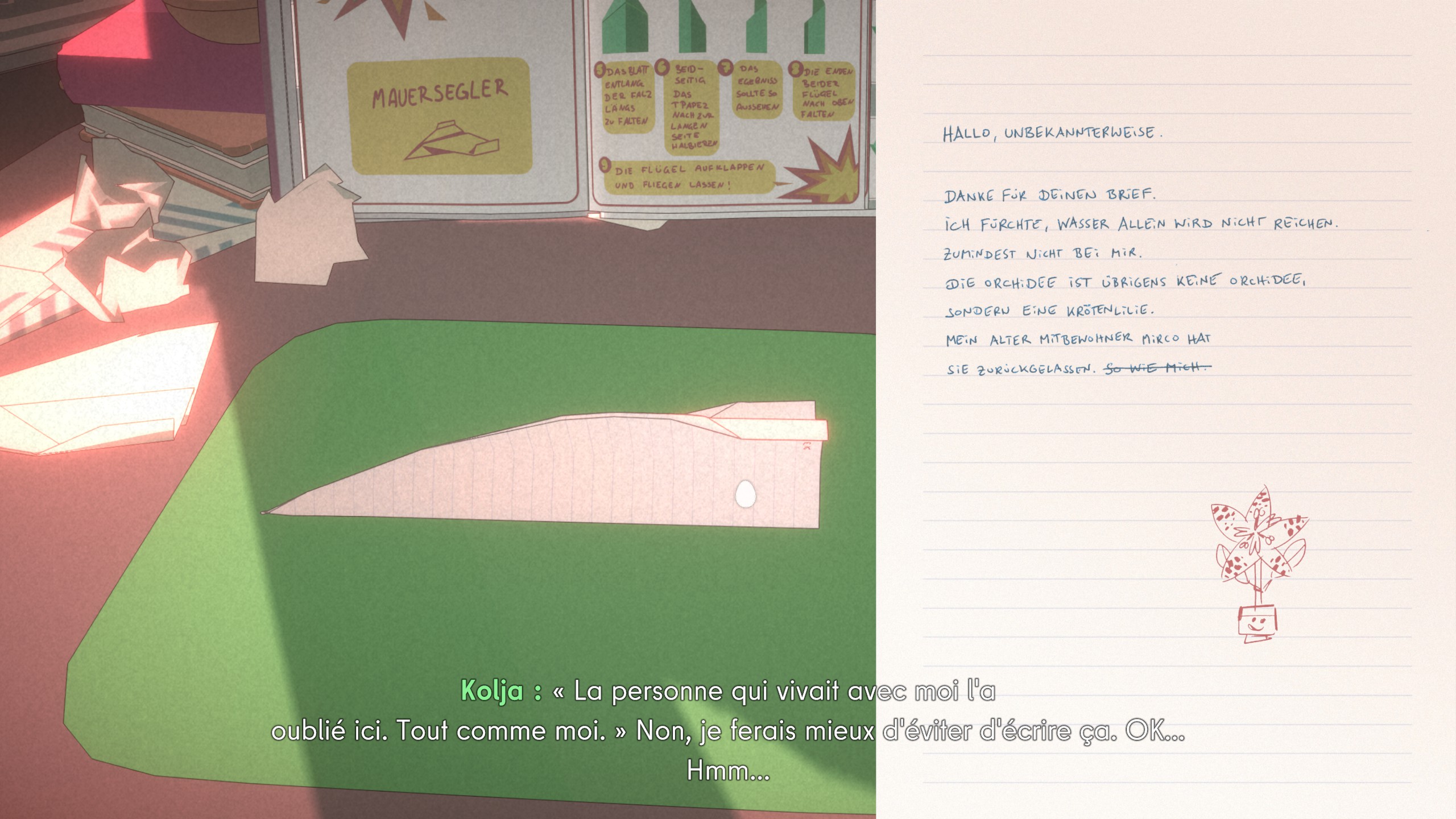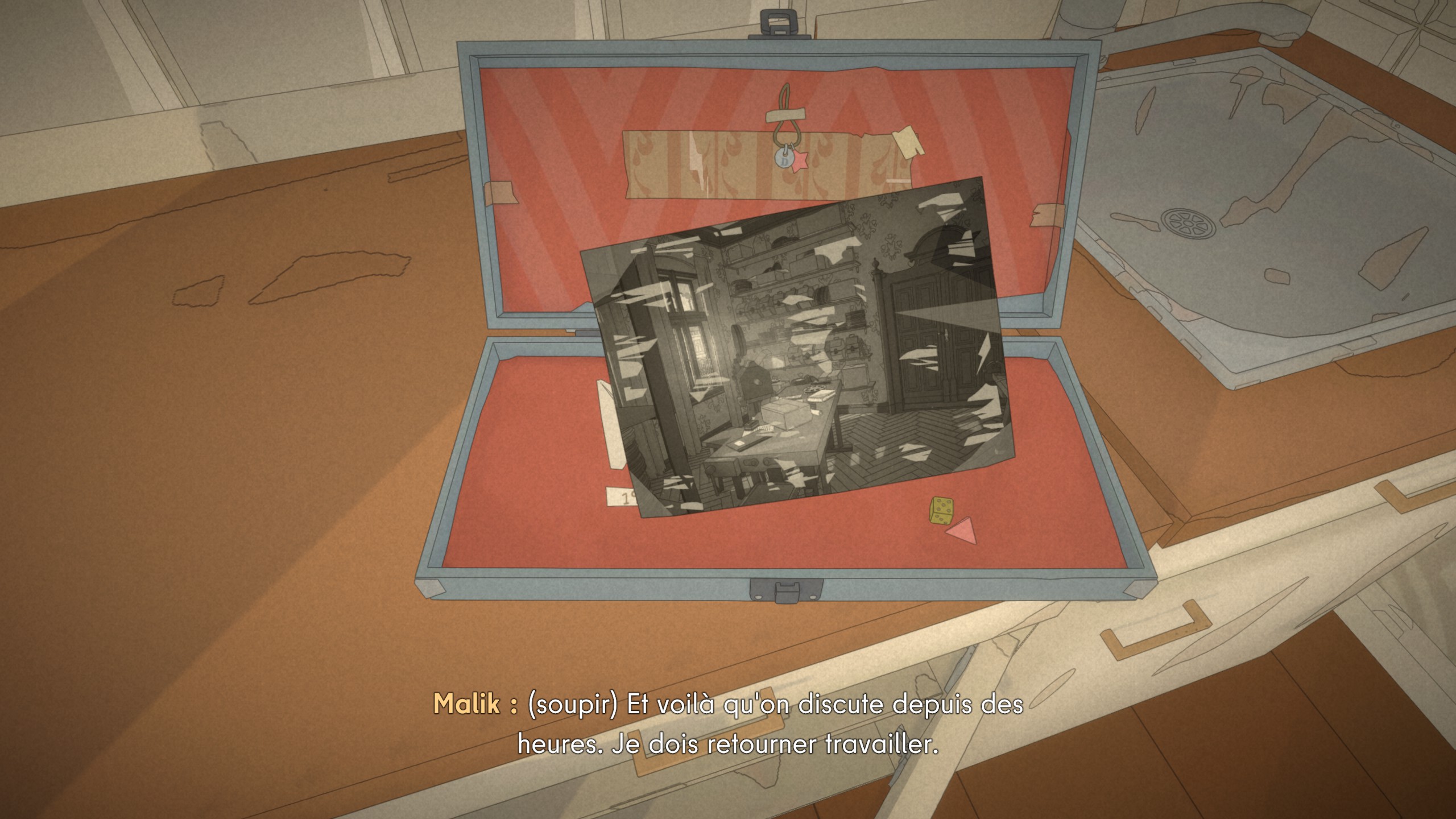 Pour le gameplay pur, vous l’aurez compris, vous allez donc prendre littéralement le contrôle de quatre personnages, cinq si l’on compte Dilara dans le présent. Sans grosse surprise, on retrouve une maniabilité plutôt classique. On se balade grossièrement dans l’appartement, tout en examinant quelques objets ou lettres, et en effectuant quelques tâches en accord avec ce que dit le protagoniste sur le moment. En somme, The Berlin Apartment n’est guère surprenant sur sa jouabilité, allant même proposer des semi-QTE à faire à la souris pour effectuer des actions spécifiques. Au départ amusants, notamment pour plier des avions en papier sur la première histoire, ces derniers deviennent vite redondants, et peu inventifs.