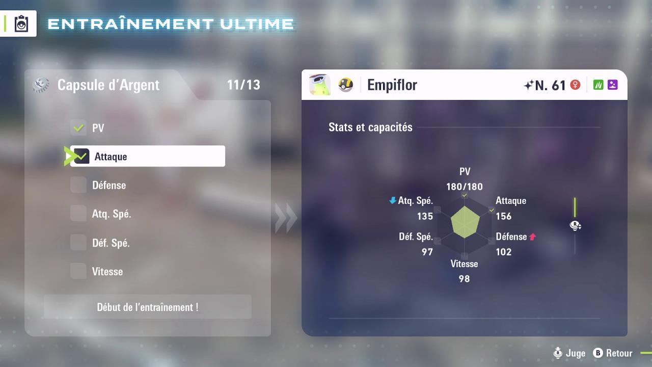 Chaque statistique (PV, Attaque, Défense, Att. Spé, Déf. Spé, Vitesse) sera notée selon une échelle allant de “Médiocre” à “Exceptionnel”. Ce système visuel facilite grandement le choix des Pokémon à améliorer via Capsules. Bien que l’Hyper Training soit disponible avant la fin du jeu, la fonction Juge permet de cibler précisément les statistiques à perfectionner, ce qui chaque Capsule utilisée beaucoup plus rentable.