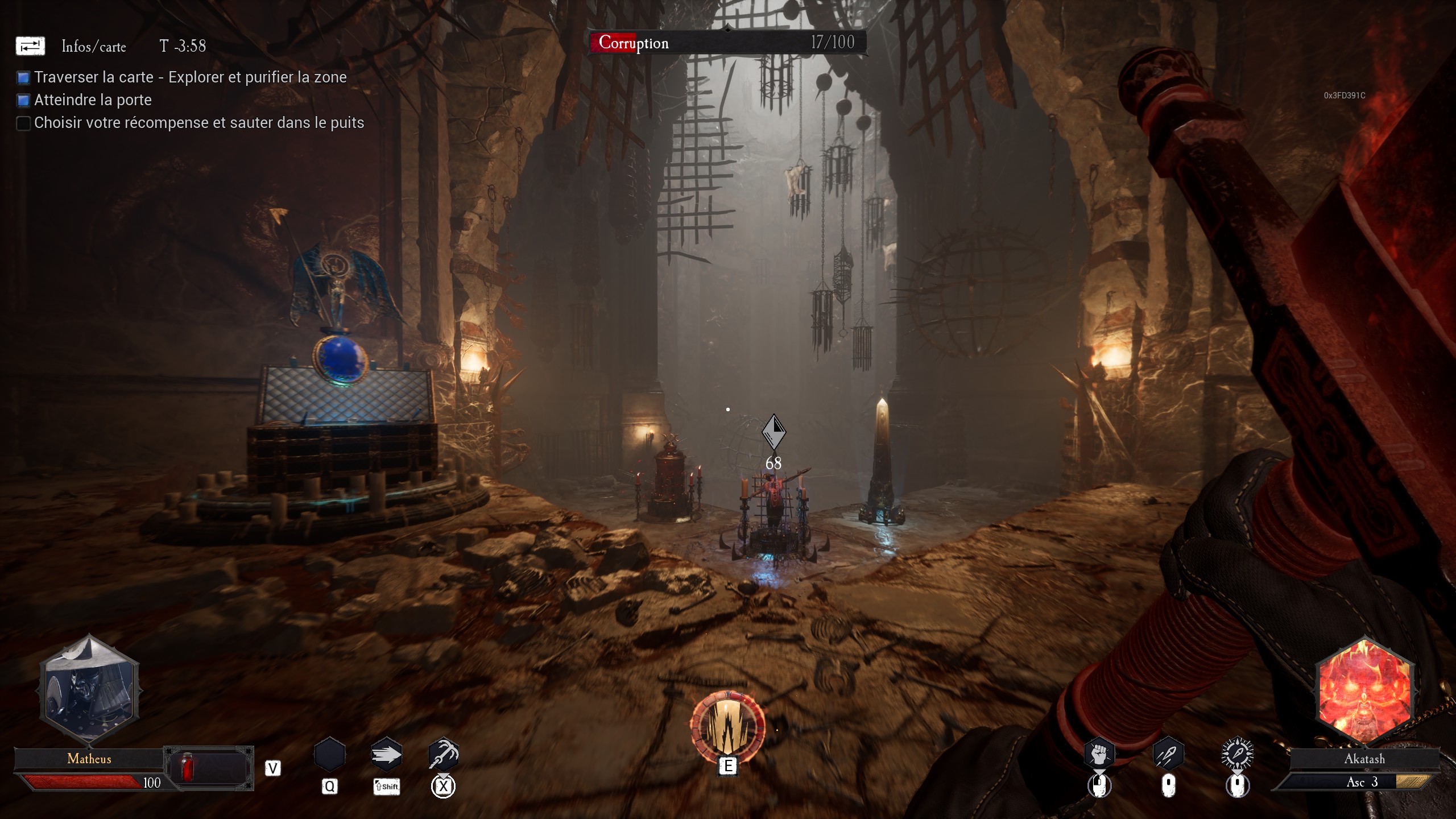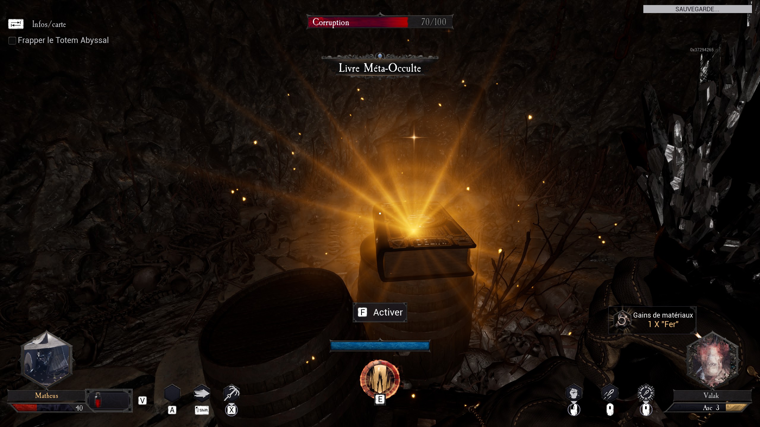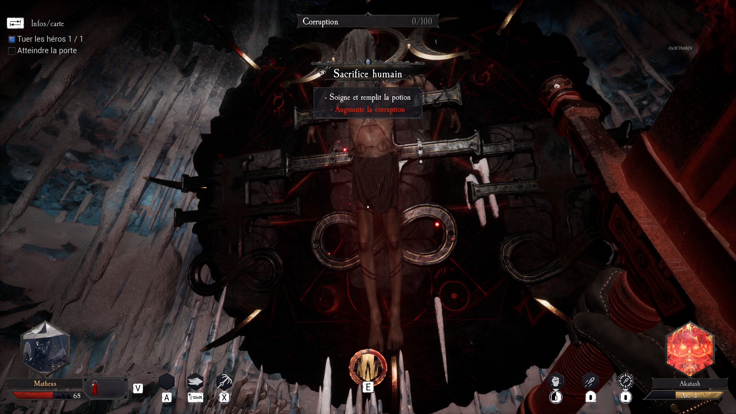 Un petit aspect dérangeant qui fait parfois rager comme les imprécisions dans les sauts ou dans l’utilisation du grappin, qui se doit d’être amélioré. Reste que l’idée originale du soft réside dans le système de santé et de réanimation. A chaque fois que vous tombez au combat, vous allez avoir une jauge de corruption qui va augmenter. Si vous atteignez les 100% à force de mourir, c’est une fin de partie et vous perdez une partie du butin accumulé. Cette idée est géniale, autant que le côté organique des cartes que l’on parcoure. Que ce soit dans l’obtention des ressources, du butin avec les coffres ou encore via des éléments démoniaques pour augmenter ou faire baisser la corruption, le système de jeu est bien ficelé dans l’ensemble.