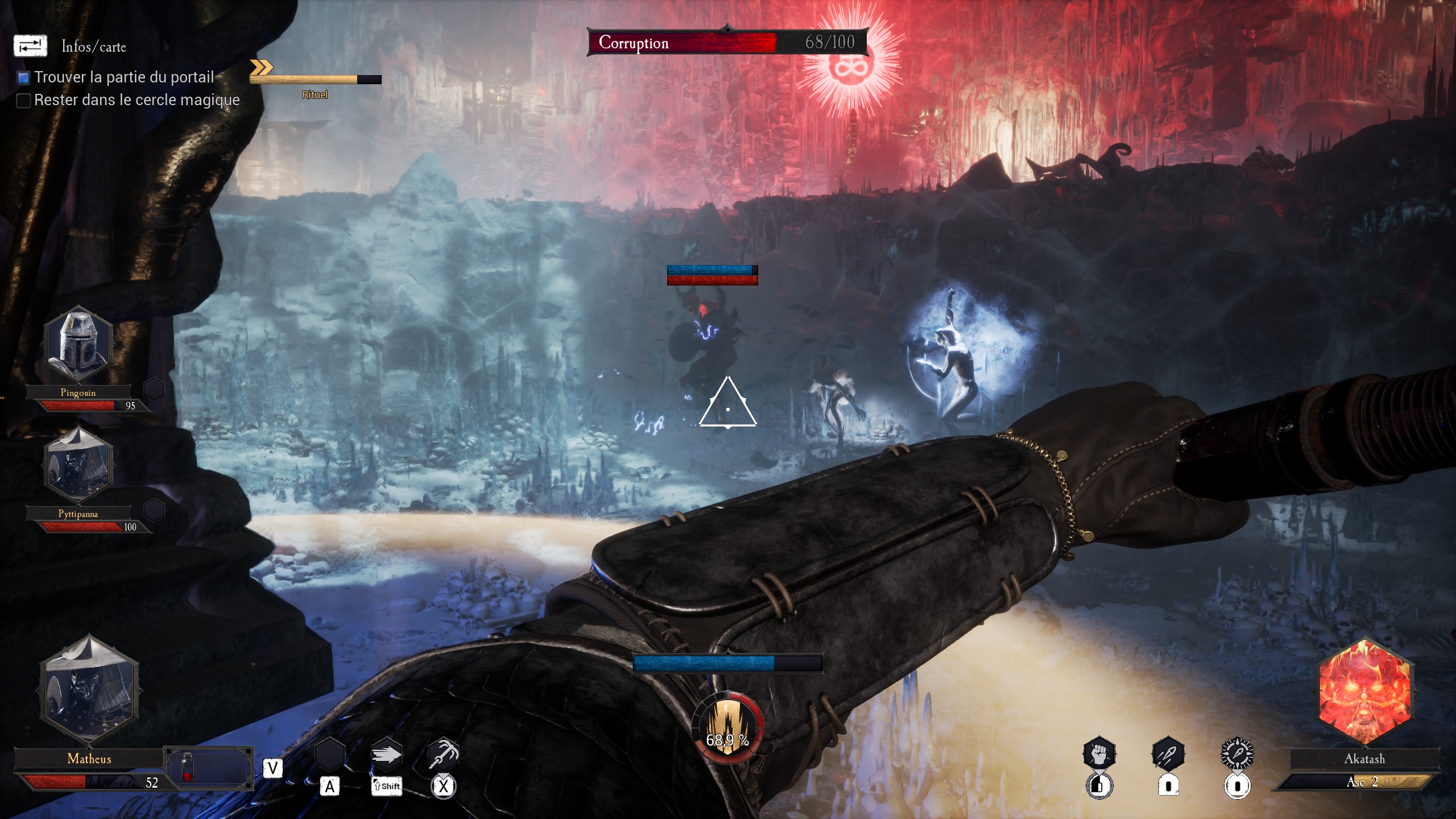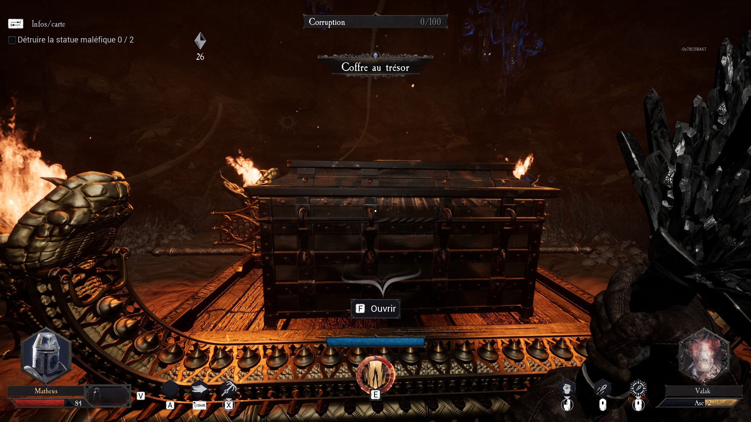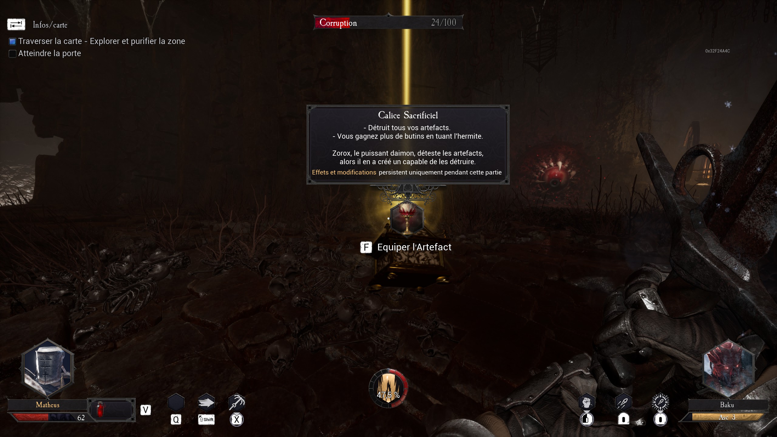 Un petit aspect dérangeant qui fait parfois rager comme les imprécisions dans les sauts ou dans l’utilisation du grappin, qui se doit d’être amélioré. Reste que l’idée originale du soft réside dans le système de santé et de réanimation. A chaque fois que vous tombez au combat, vous allez avoir une jauge de corruption qui va augmenter. Si vous atteignez les 100% à force de mourir, c’est une fin de partie et vous perdez une partie du butin accumulé. Cette idée est géniale, autant que le côté organique des cartes que l’on parcoure. Que ce soit dans l’obtention des ressources, du butin avec les coffres ou encore via des éléments démoniaques pour augmenter ou faire baisser la corruption, le système de jeu est bien ficelé dans l’ensemble.