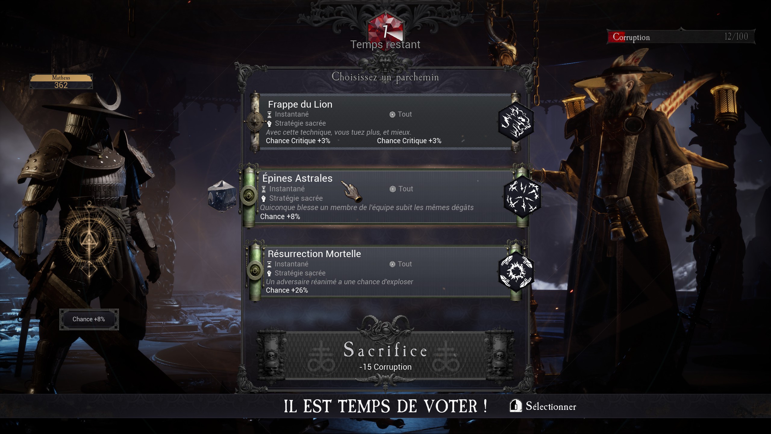 Au moins, Daimon Blades a le mérite de se doter de quelques boss intéressants, et d’un bestiaire varié. Effectivement, les boss à combattre ne sont pas déplaisants, car ils offrent un véritable challenge, du moins au début. Vous affronterez toujours les mêmes à force de réussir vos expéditions, bien qu’il y en ait par la suite de nouveaux. On espère que dans sa version finale, le jeu nous autorisera à affronter des boss un peu plus diversifiés car pour le moment, après plusieurs heures, la redondance est de mise. Les « phases de stratégie », prenant place après un combat de boss font également partie des idées sous-exploitées. Vous serez, dans ces phases, sommé de choisir un parchemin tout comme l’Hermite, ce qui vous donnera respectivement un bonus, et un malus. Cela est relativement intéressant sur le papier, mais ces phases sont trop courtes et peu approfondies, comme certaines mécaniques de ce Daimon Blades.