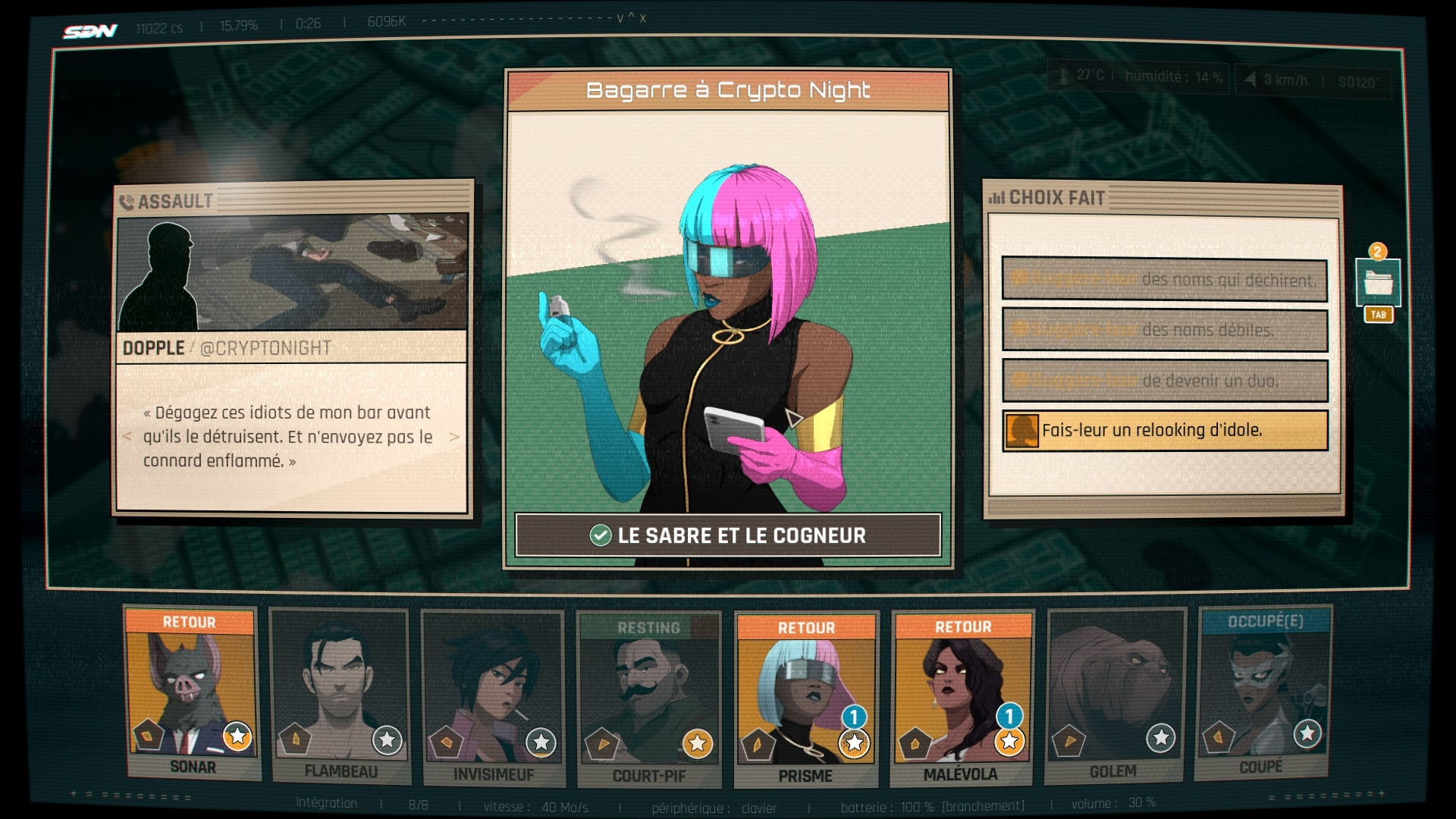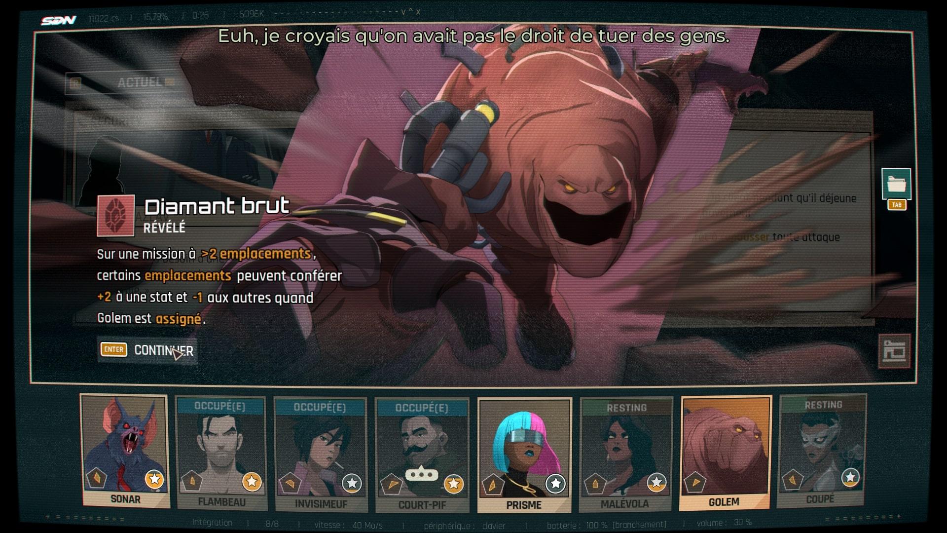 Alors, qu’est-ce qui change ? Eh bien, hormis l’aspect visuel saisissant du jeu, son gameplay. Dispatch ne nous donne pleinement les commandes que lorsque Robert effectue son travail. Cela se traduit par une partie gestion dans laquelle vous devez assigner vos super-losers au bon endroit, selon les forces et faiblesses de chacun.