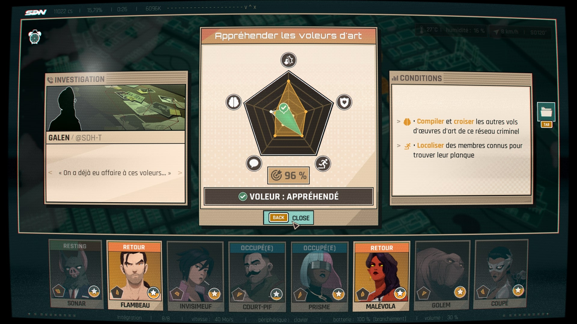 Un principe simple, qui se complexifie assez vite. Choisir les bonnes personnes n’est pas toujours évident, dans la mesure où le jeu fait preuve d’un peu de subtilité par rapport aux tâches demandées. Vous devrez parfois envoyer plusieurs agents pour compléter les forces de chacun, mais ça, c’est si vous le pouvez. En dehors des problèmes d’emploi du temps, certains agents refuseront occasionnellement de participer aux missions, ou pourront la mettre en péril. Car même si vous n’êtes que devant un écran de gestion sobre au possible, l’histoire continue et les dialogues fusent durant cette partie.