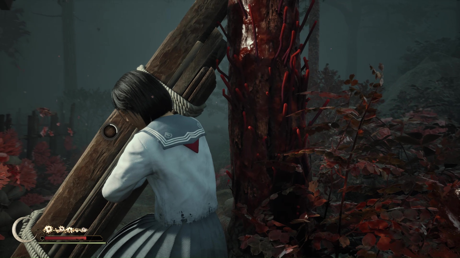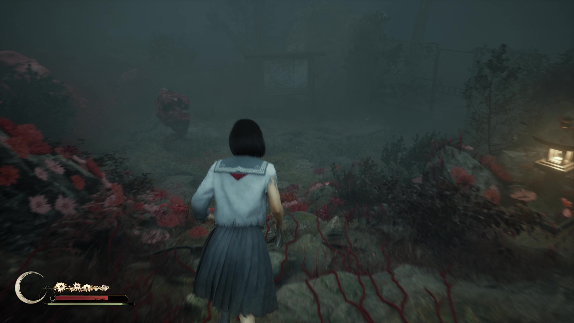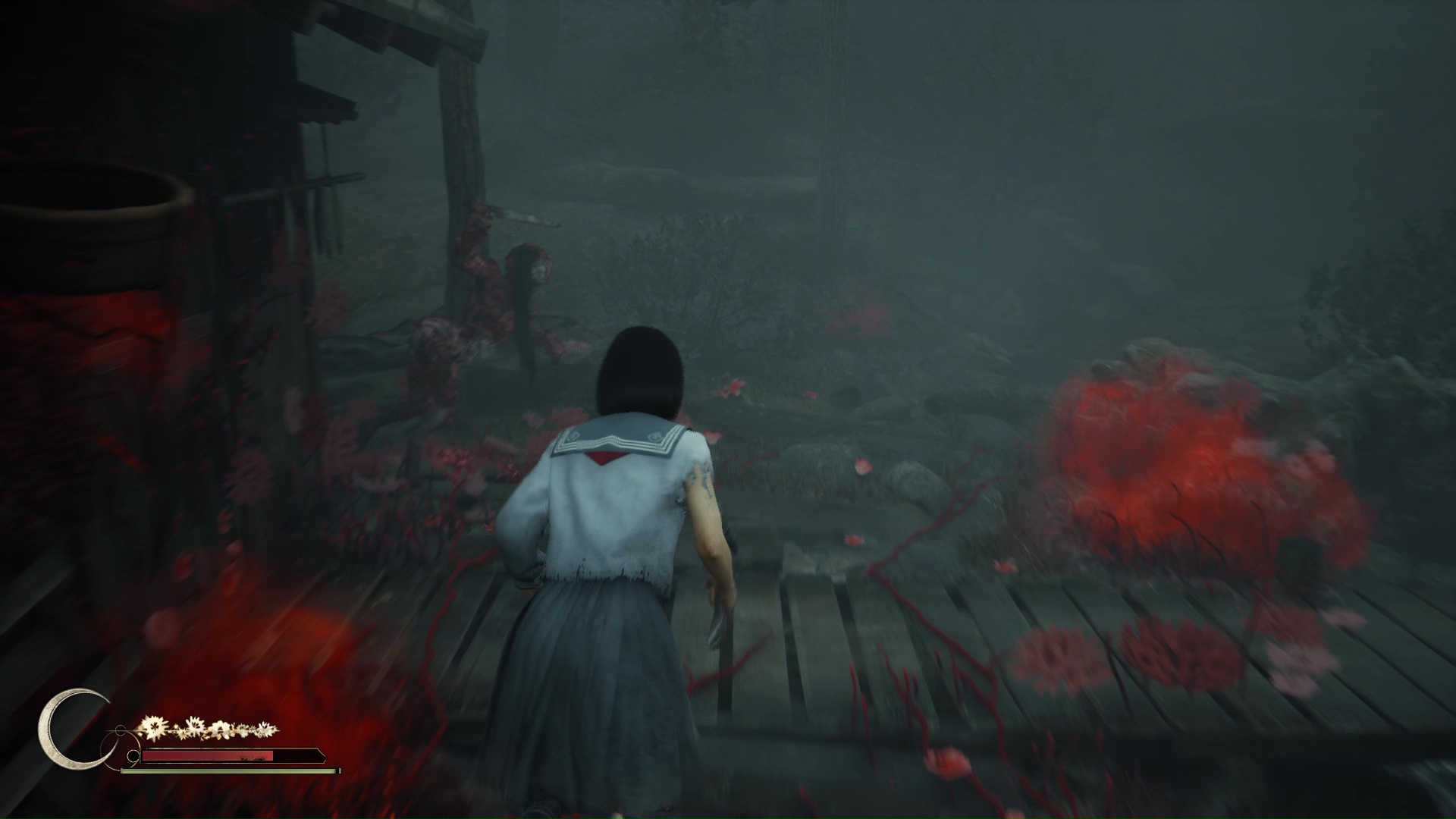 Une seconde phase de course-poursuite démarre après une petite pause. Passez outre le passage fermé par des planches à soulever juste après une cabane puis continuez sous un tronc d’arbre avant de tourner à droite et monter une pente sur laquelle vous attendent marionnettes et lianes rouges au sol. Si la cinématique se déclenche, terminant la course-poursuite puisque vous voilà protégée par une porte Torii, vous débloquez le trophée et pourrez d’ailleurs sauvegarder juste après.