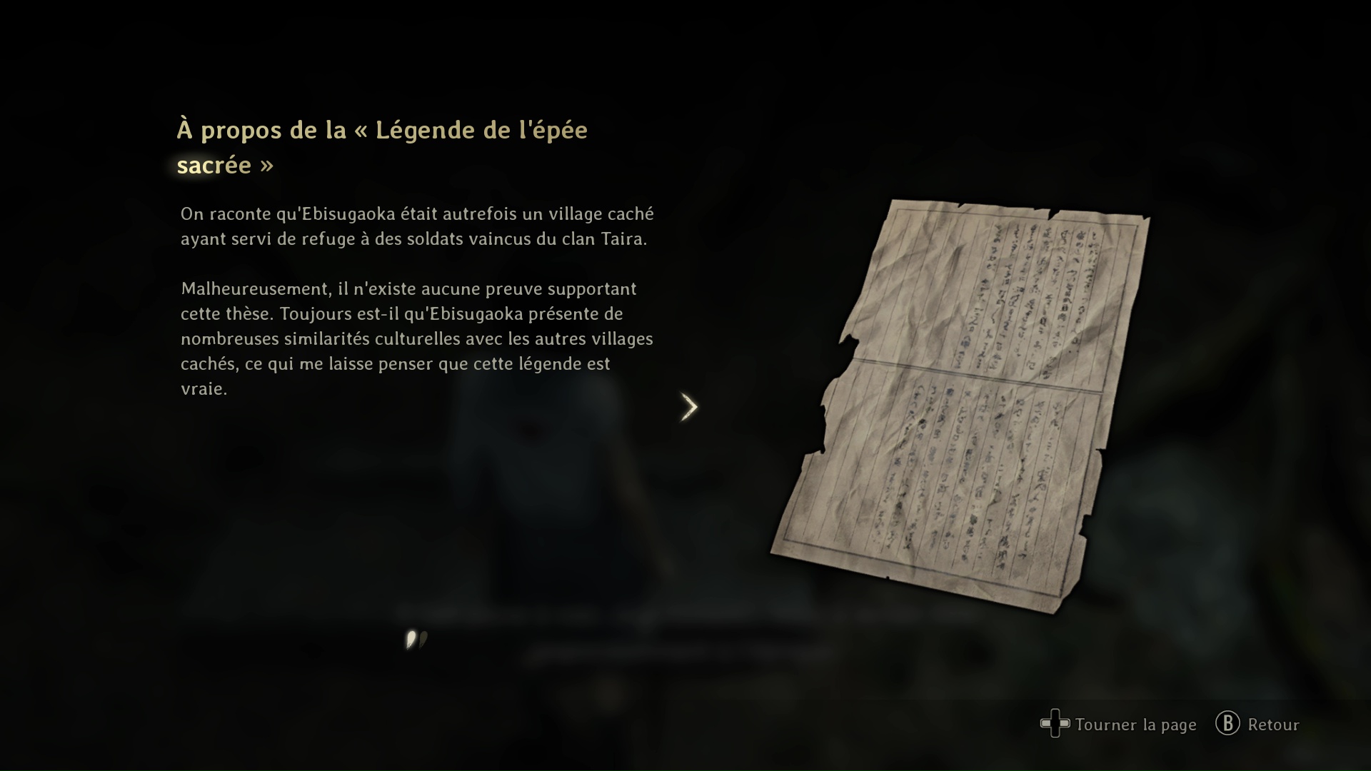 Après la course-poursuite avec le monstre de brouillard dans les montagnes sur le chemin de la maison de Shu, grimpez l’escalier à gauche du Hokora (point de départ signalé sur notre carte ci-dessous). Continuez de grimper autant que vous pouvez pour trouver l’arbre sacré qui va alors s’offrir à vous. Vous trouverez aussi un document parlant de la Légende de l’épée sacrée… que vous pourrez tenter d’obtenir dès le New Game + pour vous offrir l’une des deux fins en rapport avec celle-ci.
