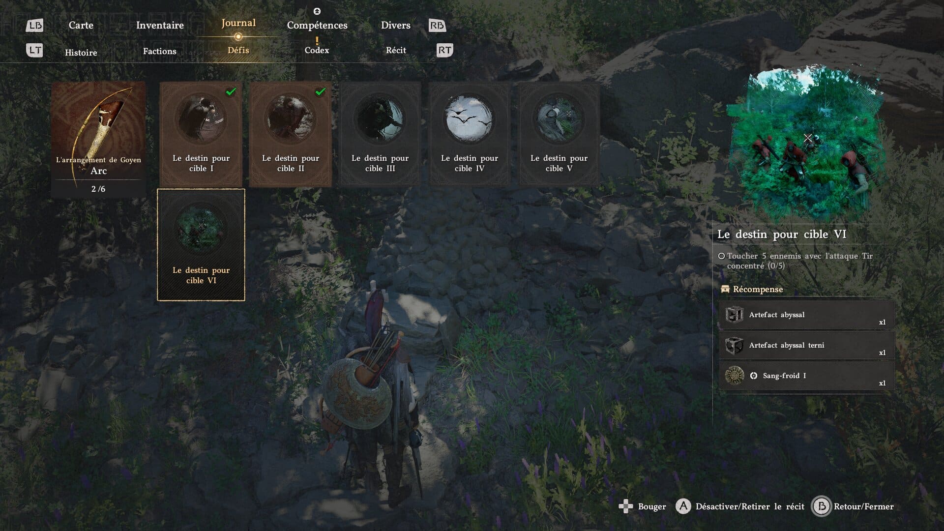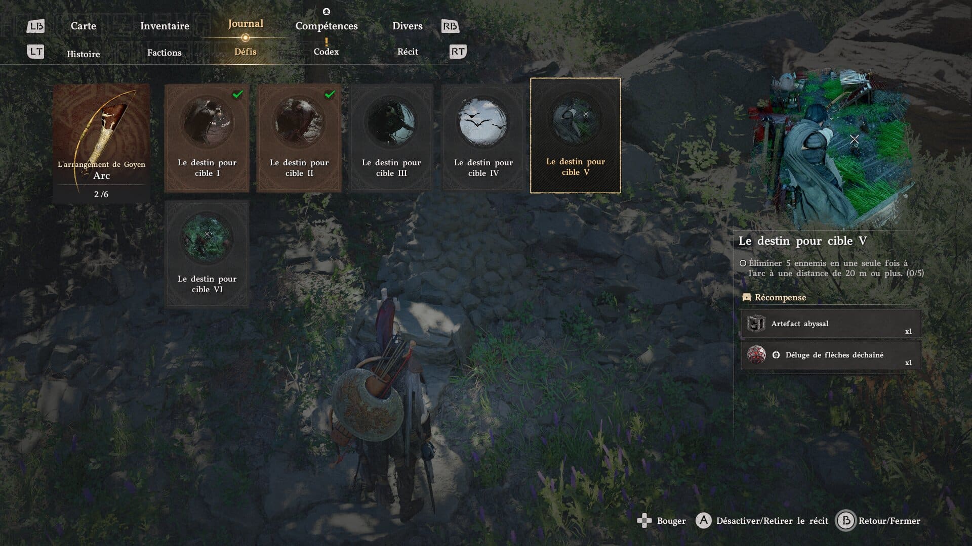 - Défi : éliminer 5 ennemis en 60 secondes à l’arc.