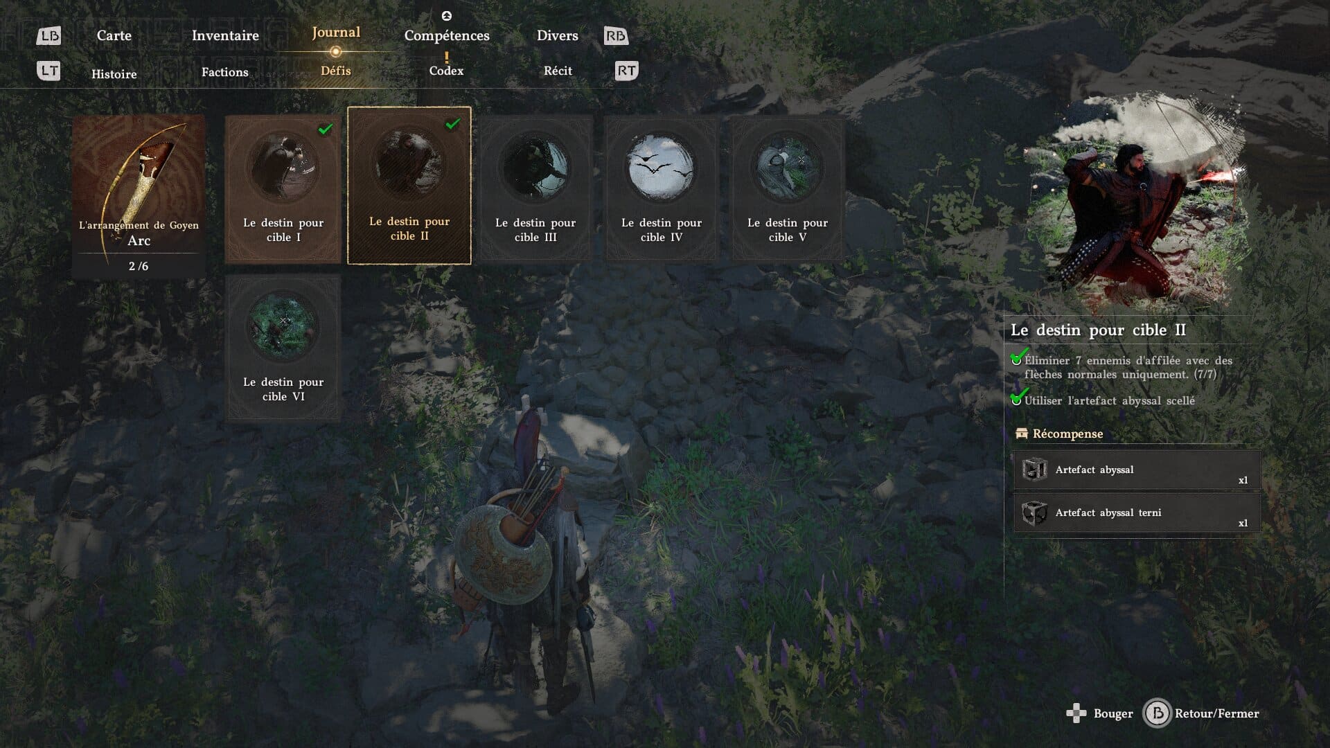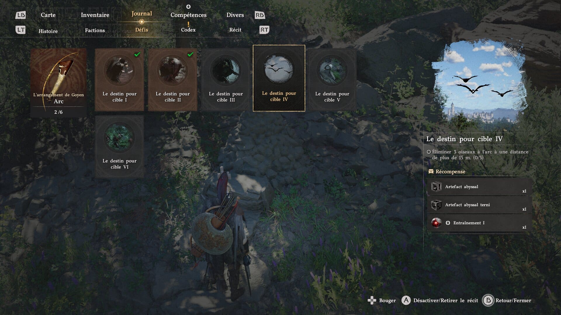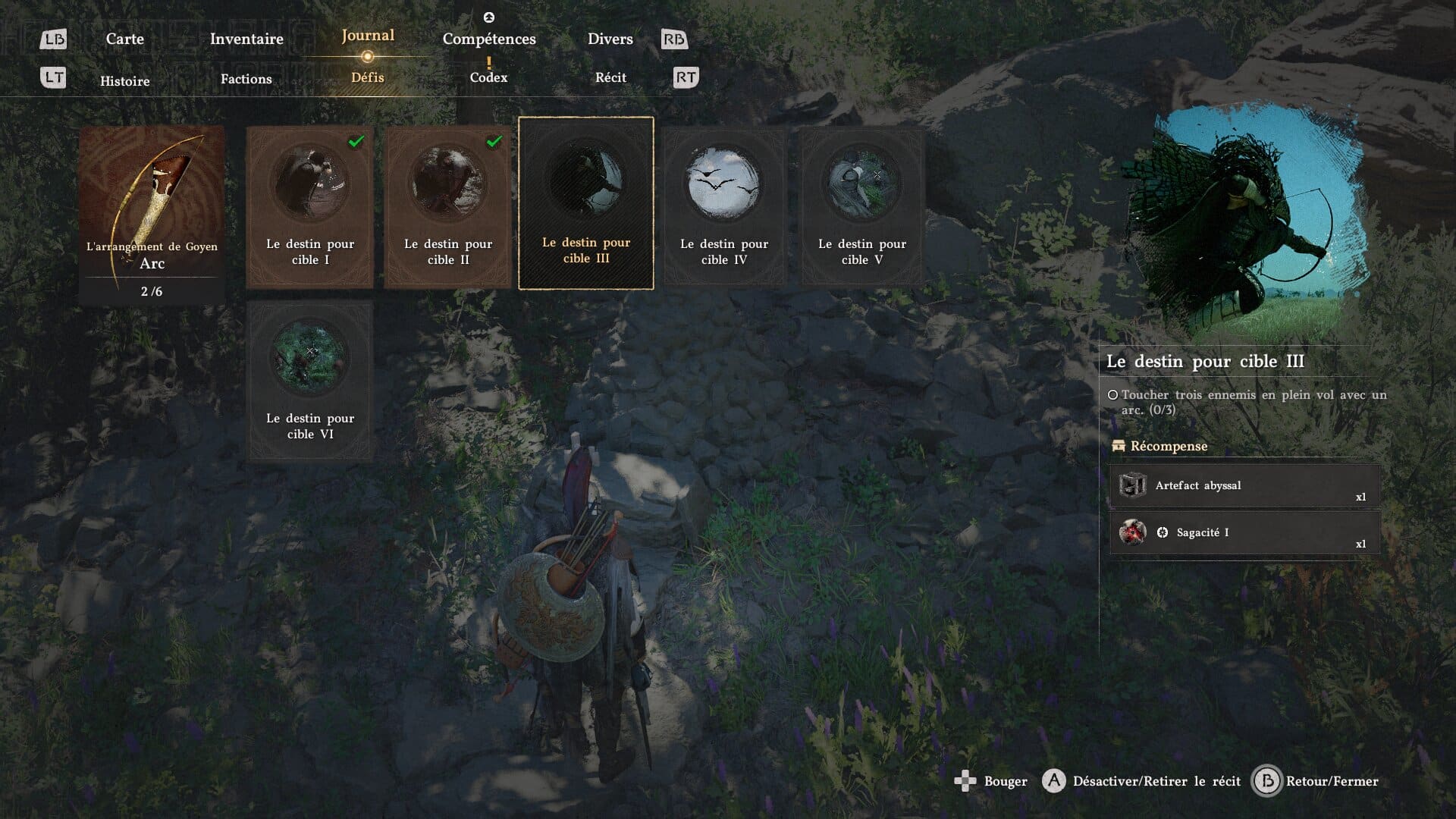 - Défi : toucher trois ennemis en plein vol avec un arc.