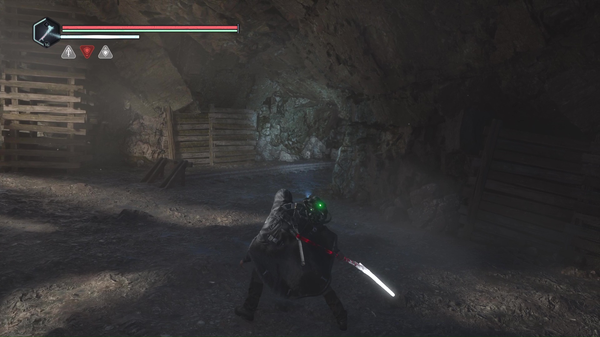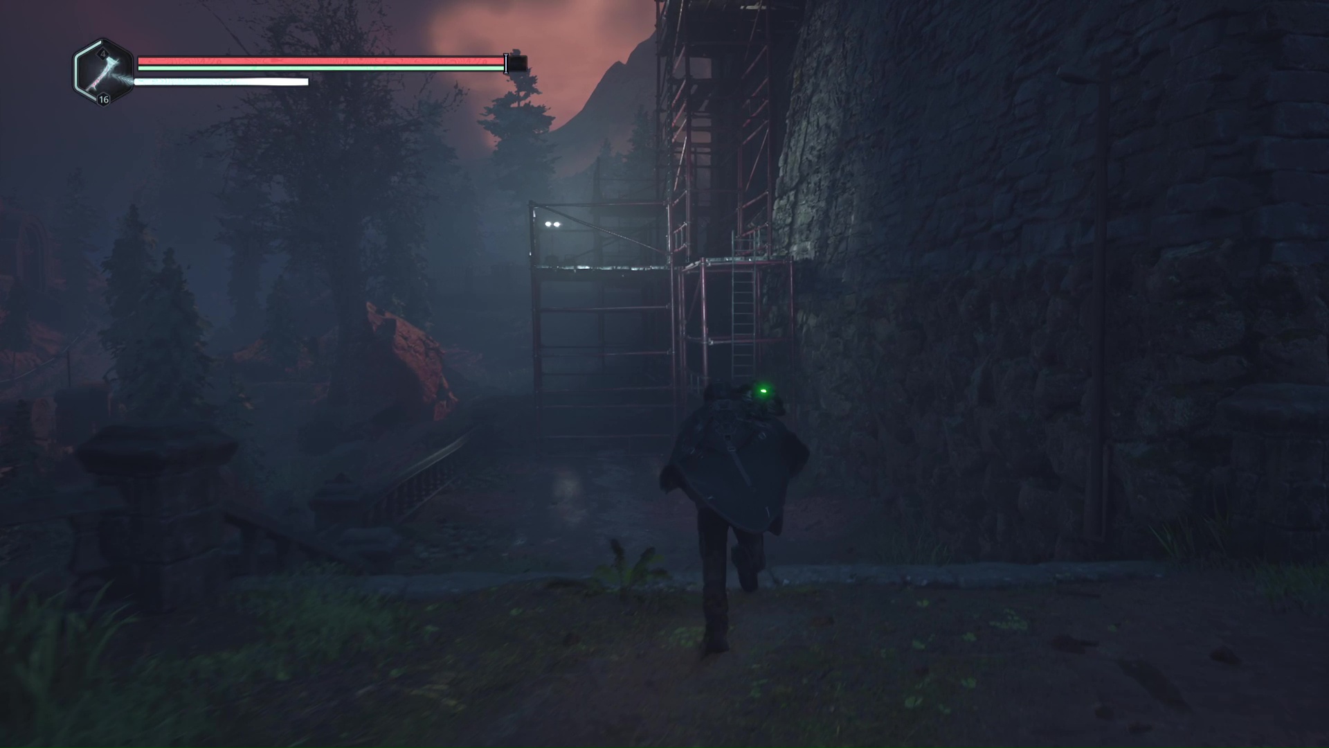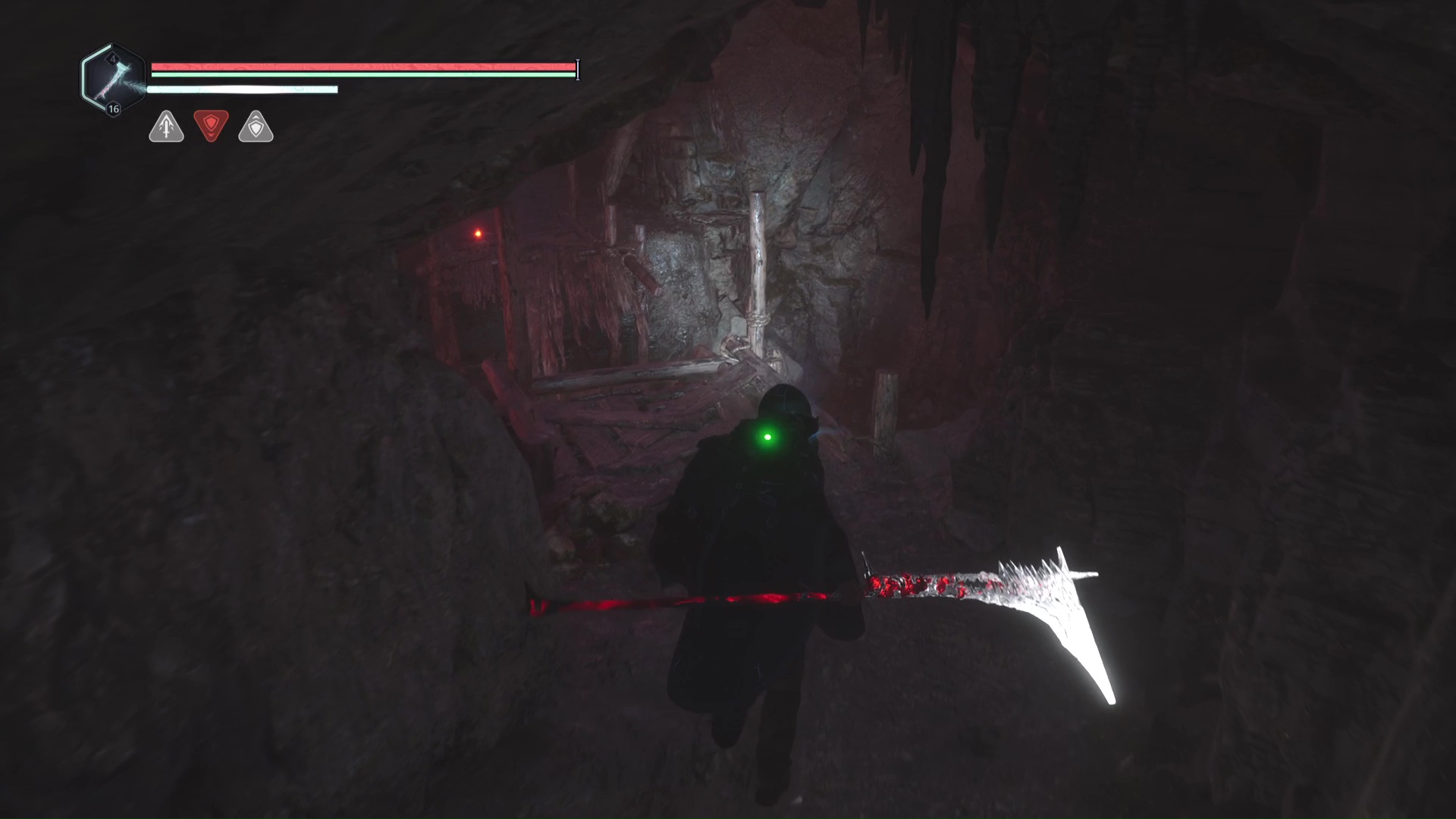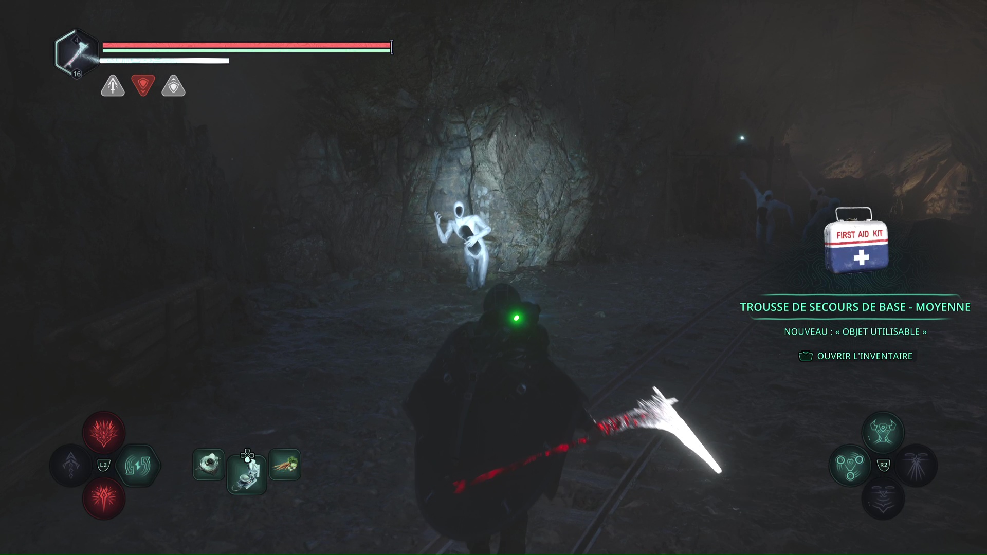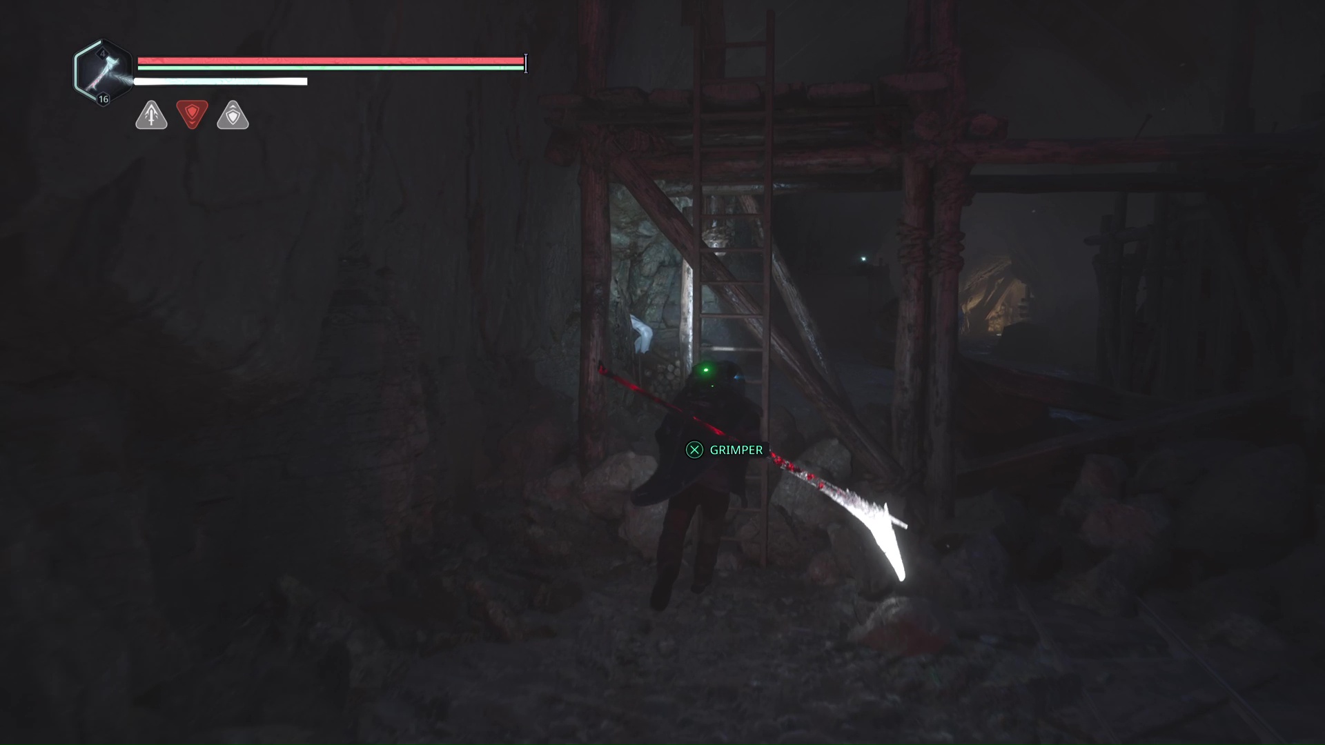 Pénétrez à l’intérieur et suivez le seul chemin possible jusqu’à devoir tomber en contrebas dans une salle éclairée de rouge. Allez ensuite à droite pour monter à une échelle quelques mètres plus loin. De l’autre côté, quelques Hollow Walkers vous attendent.