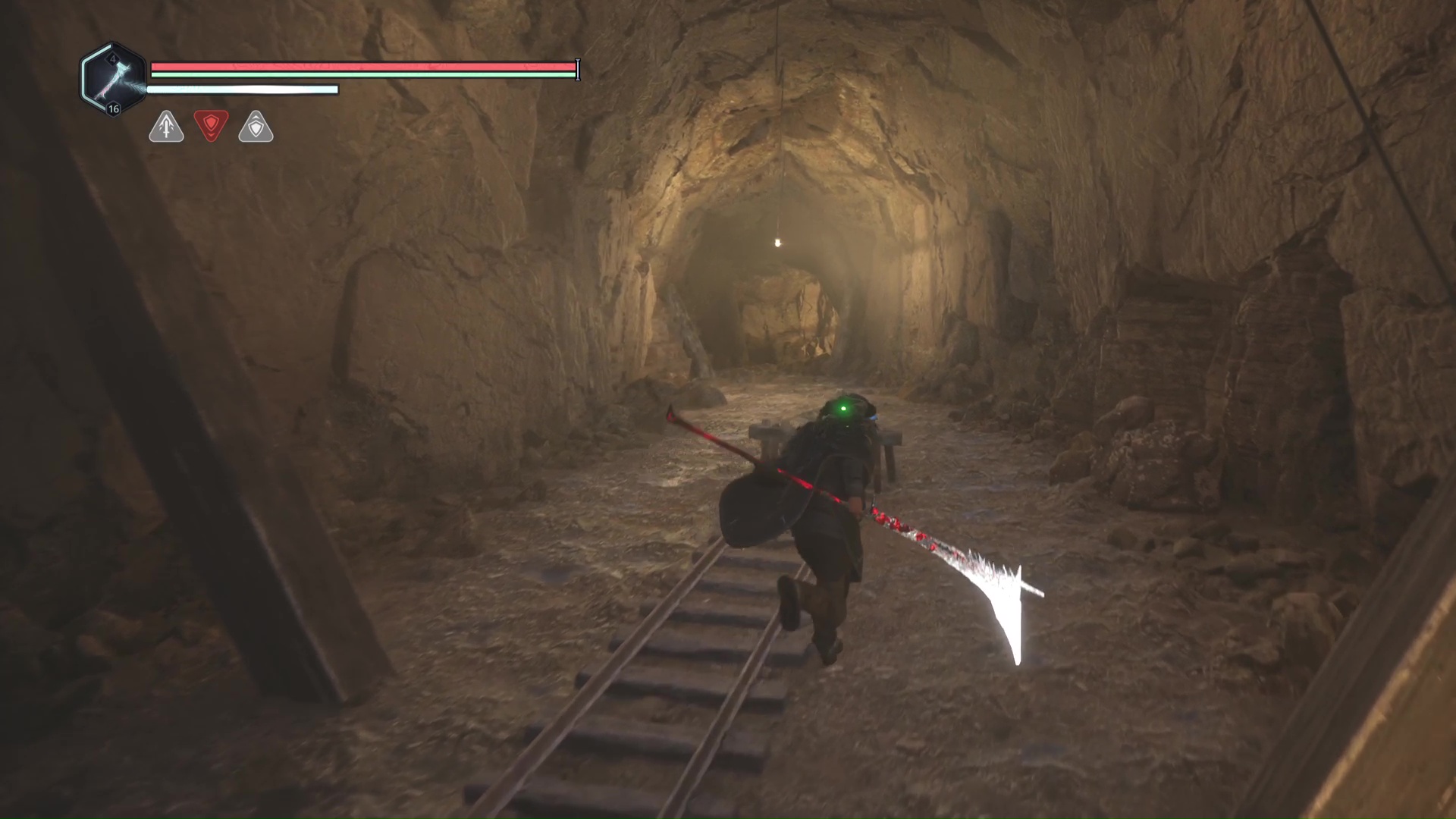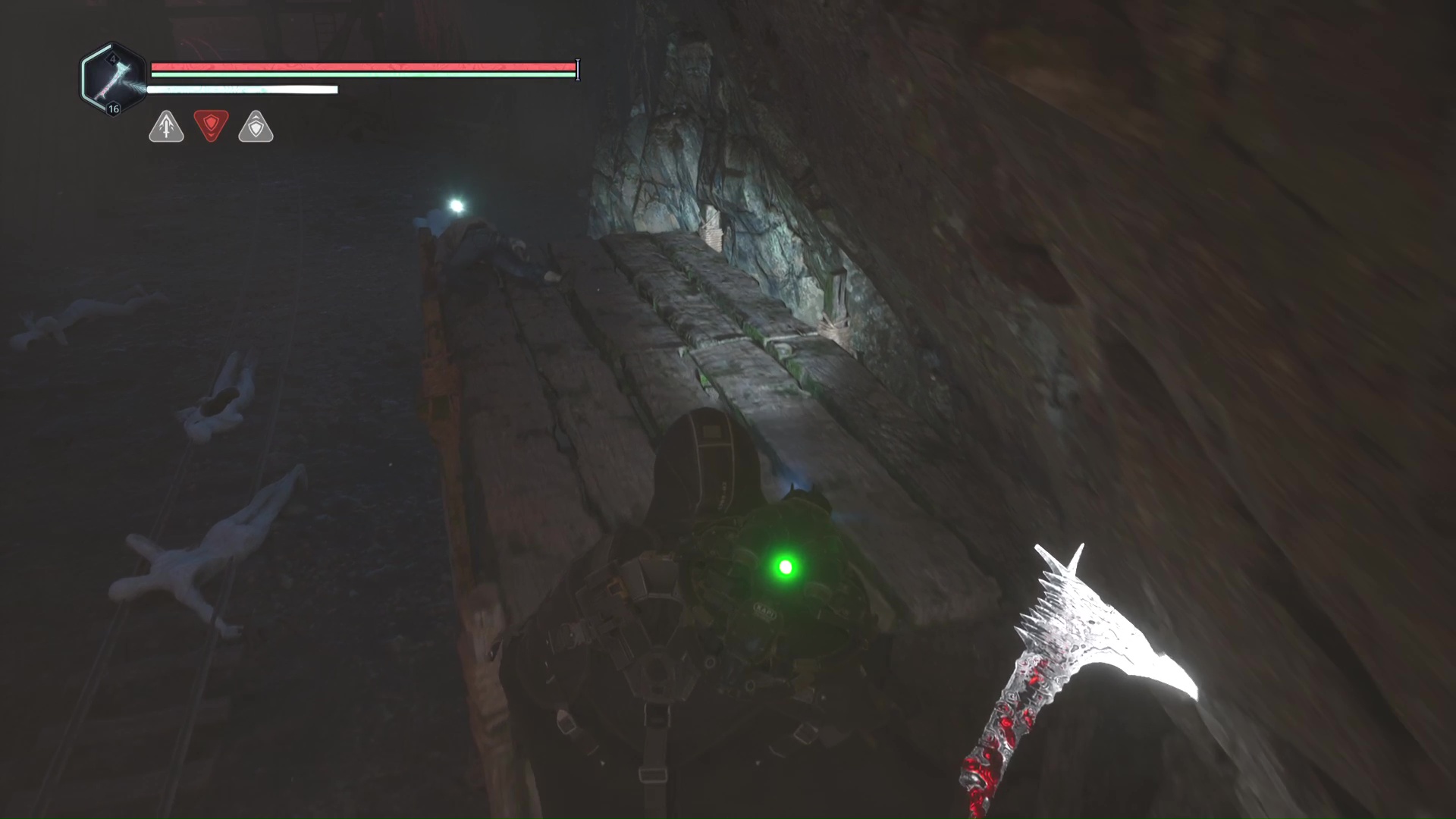 Battez-les et prenez directement le passage à gauche. Au bout de quelques pas, vous aurez le choix entre aller à gauche ou à droite. Prenez à droite et suivez les rails. Progressez jusqu’à vous retrouver sur une plateforme en bois. Au bout de celle-ci gît un cadavre. Ramassez le point blanc brillant sur lui, il s’agit de la Casquette – Chagrin.