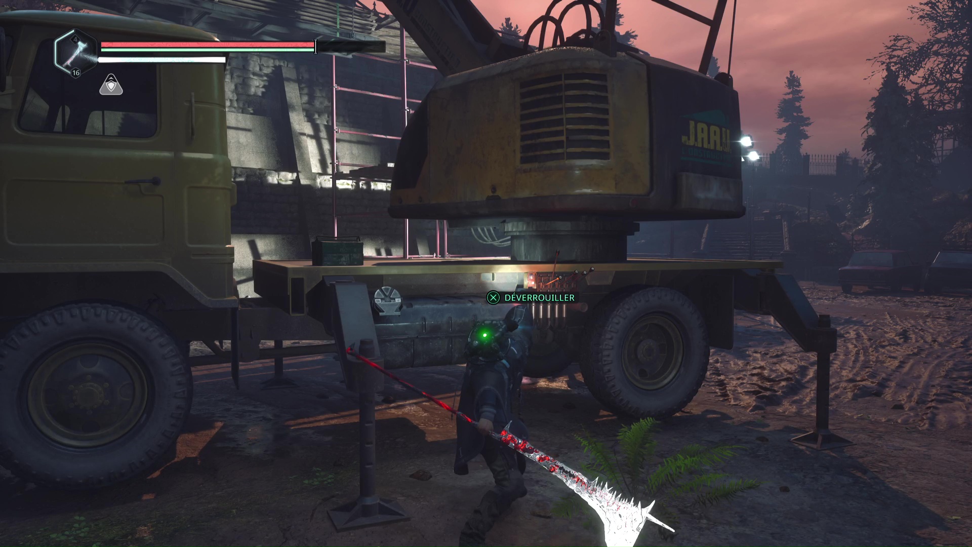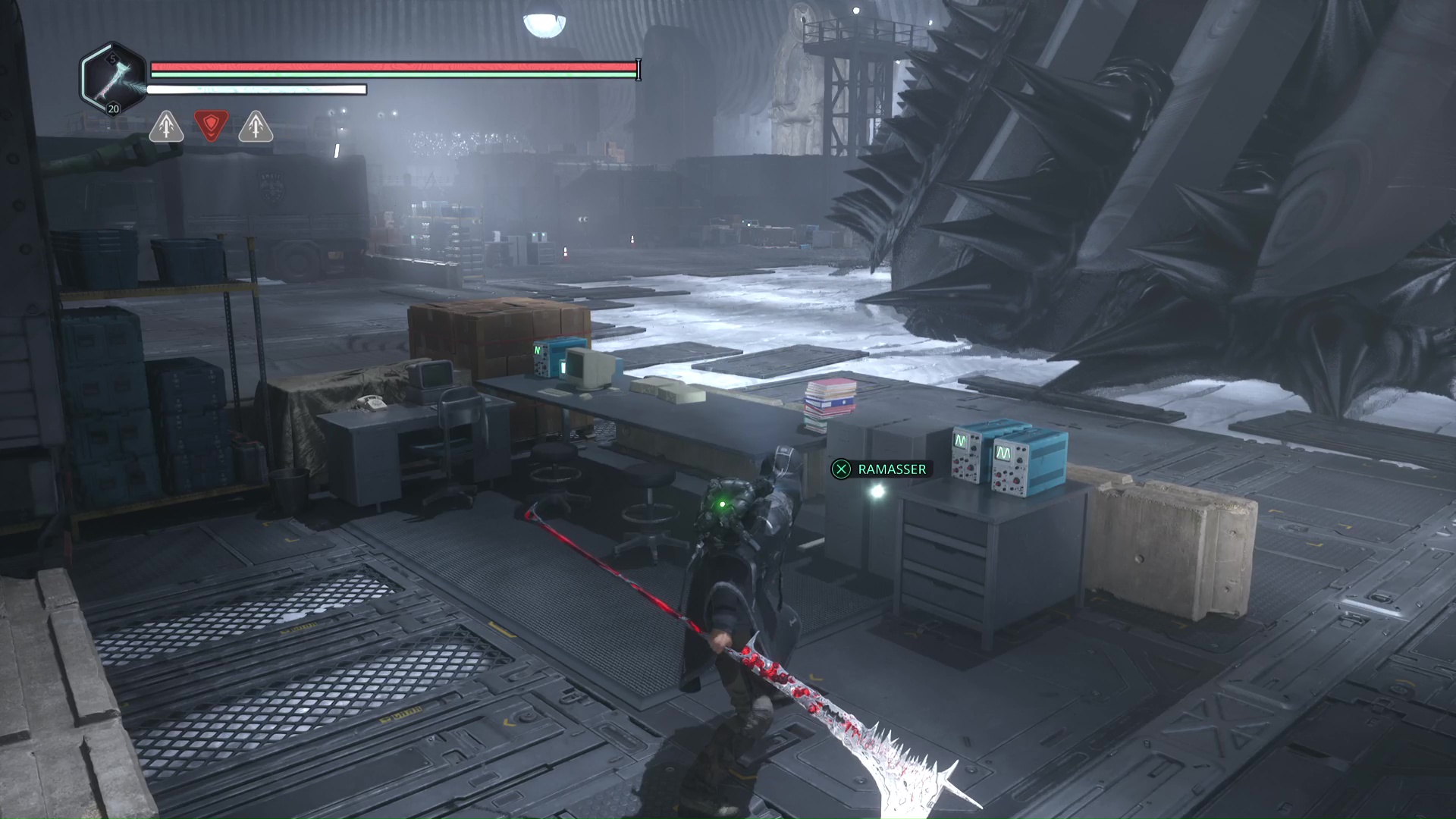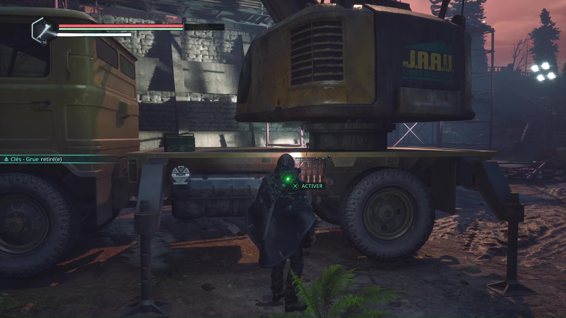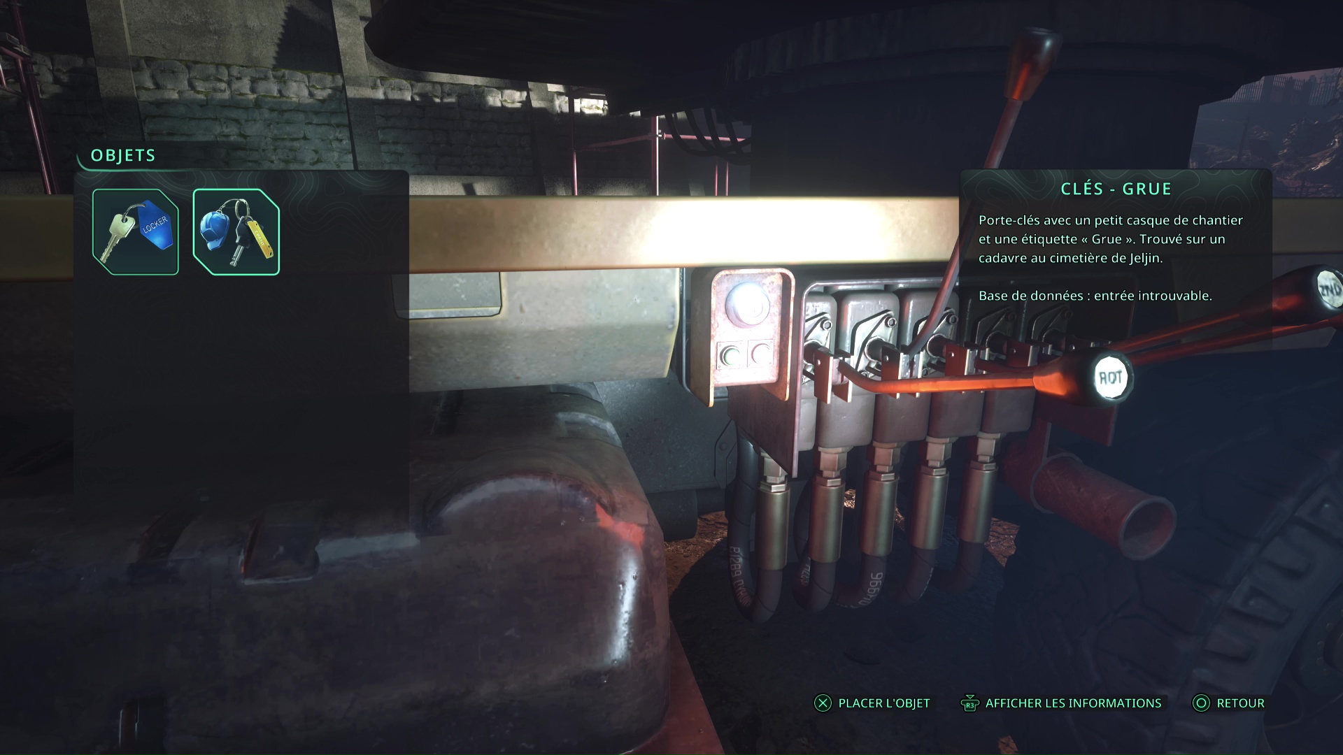 Ensuite, direction la grue du niveau. Un Hollow Walker tire à distance depuis les hauteurs, juste au-dessus, et c’est ici que se trouve la casquette. Pour la rejoindre, il faut activer la grue avec les Clés – Grue. Déverrouillez-la puis tirer le levier pour abaisser la plateforme.