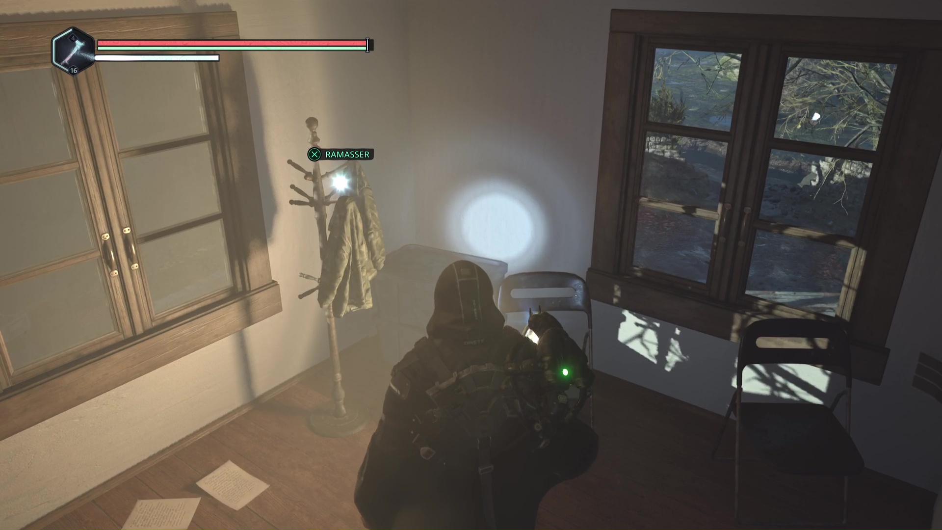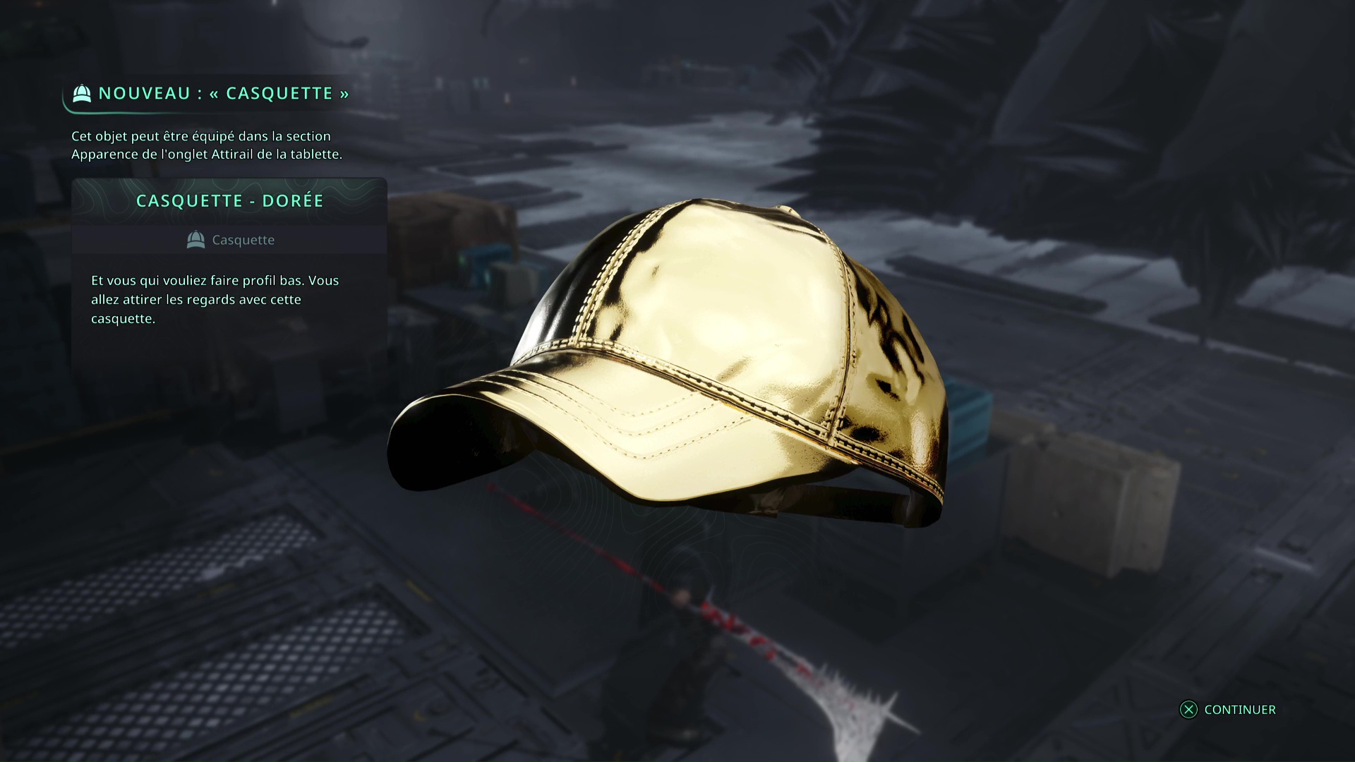 Faites le tour par la droite et fouillez le bureau situé tout près de la boucle. Ramassez le point brillant blanc, il s’agit de la Casquette – Dorée.