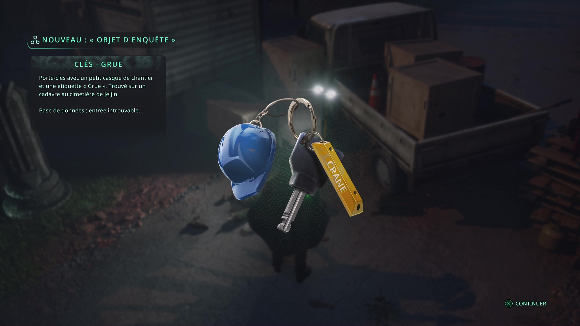 À présent, quittez le bâtiment et revenez au parking. Dans le coin inférieur droit du parking, lorsque vous faites face au bâtiment, il y a une voiture bleue isolée. Approchez du coffre et insérez les Clés – Voiture pour récupérer à l’intérieur la Casquette – Extase.