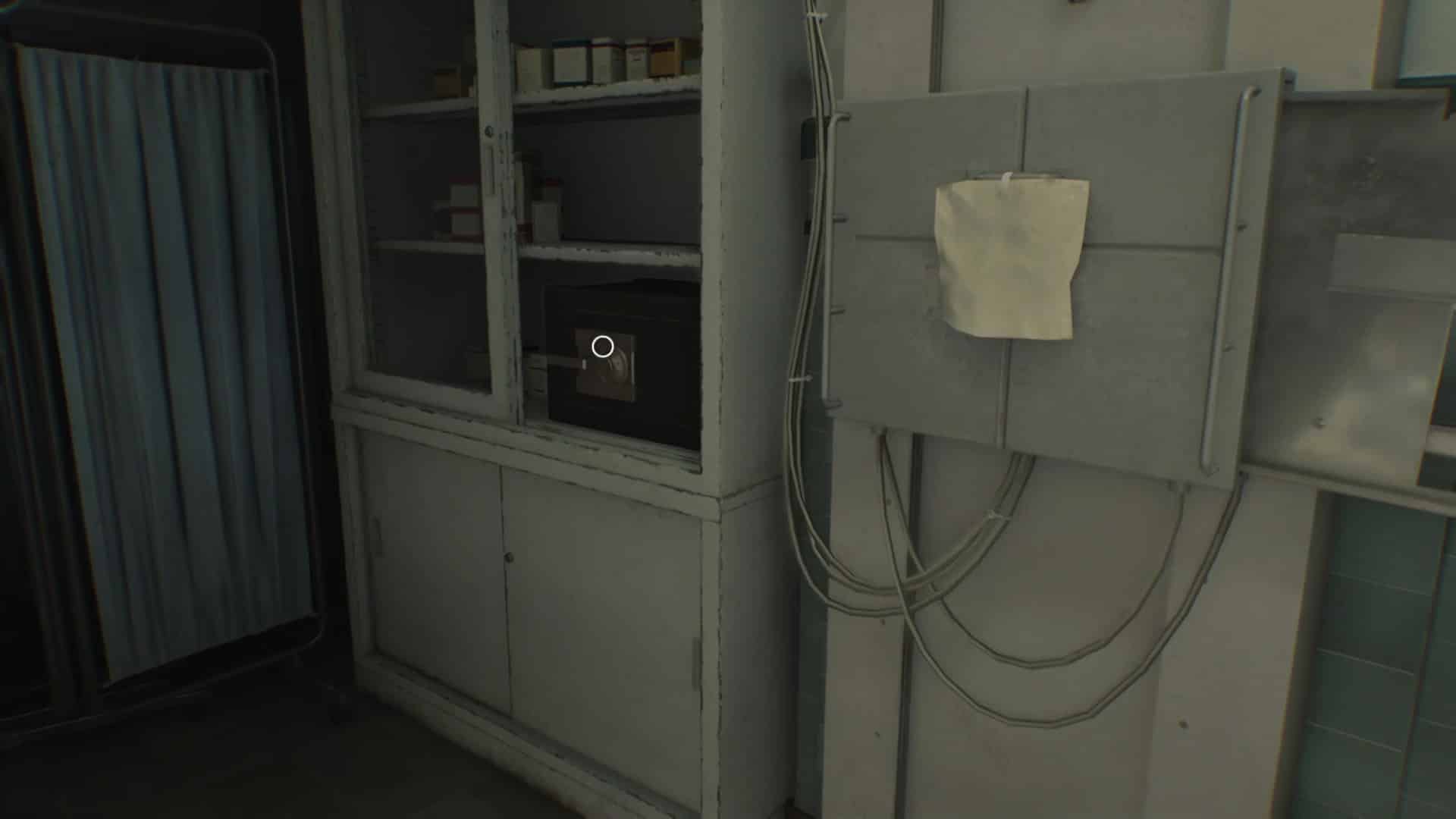 - Emplacement : Le coffre est dans une armoire médicale de la Salle d’examen, dans l’aile est du centre de soins. Près du corps sans organe, le coffre-fort se trouve dans le placard à droite.