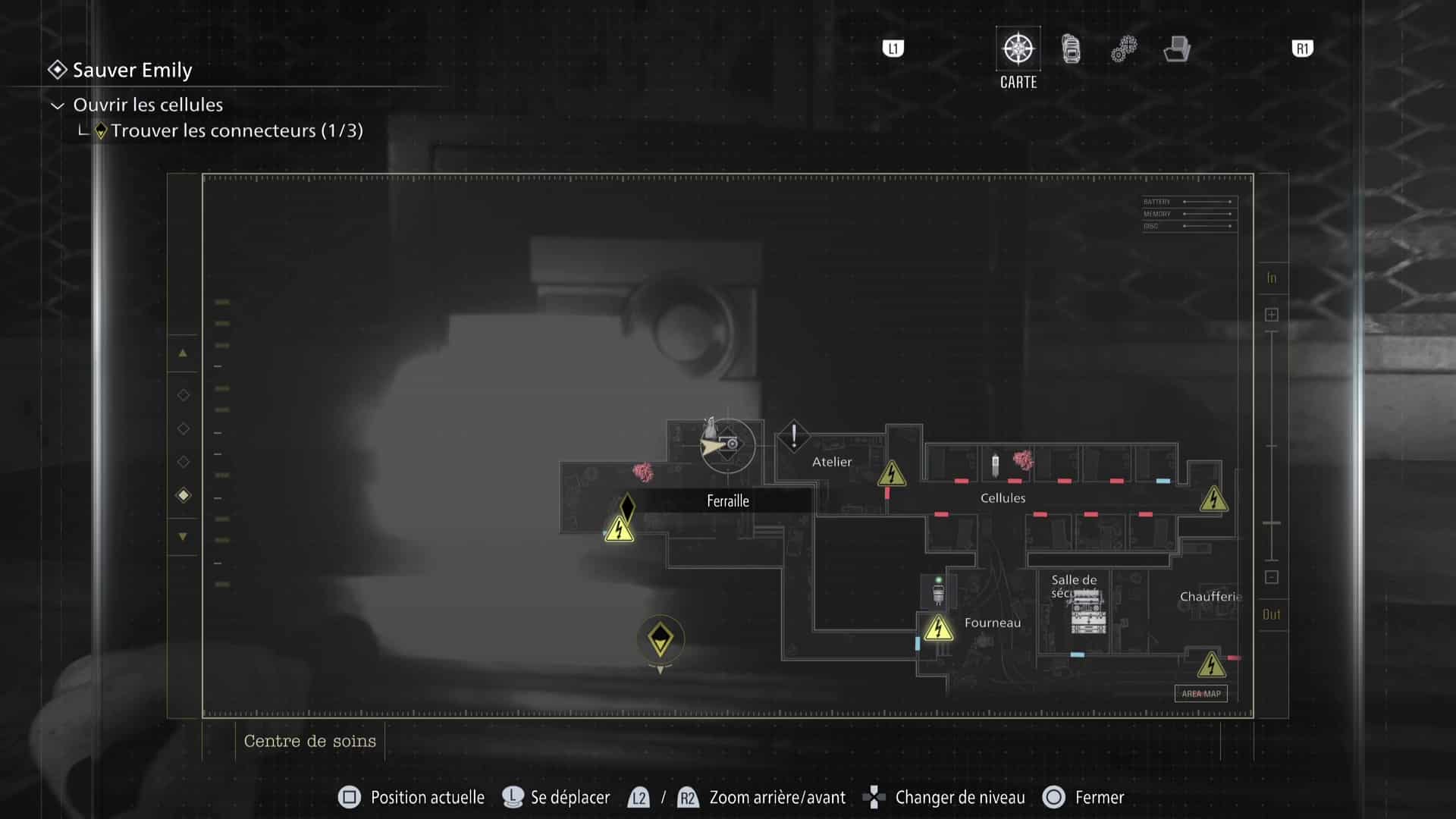 - Emplacement : Le coffre se trouve au sous-sol du centre de soins. Rendez-vous dans la zone accessible depuis le Fourneau nécessitant l’insertion d’un connecteur. Une fois dans la zone, un zombie fait des allers-retours entre un transpalette et un bureau. C’est dans le bureau, sur votre droite en entrant, que vous trouverez le coffre.