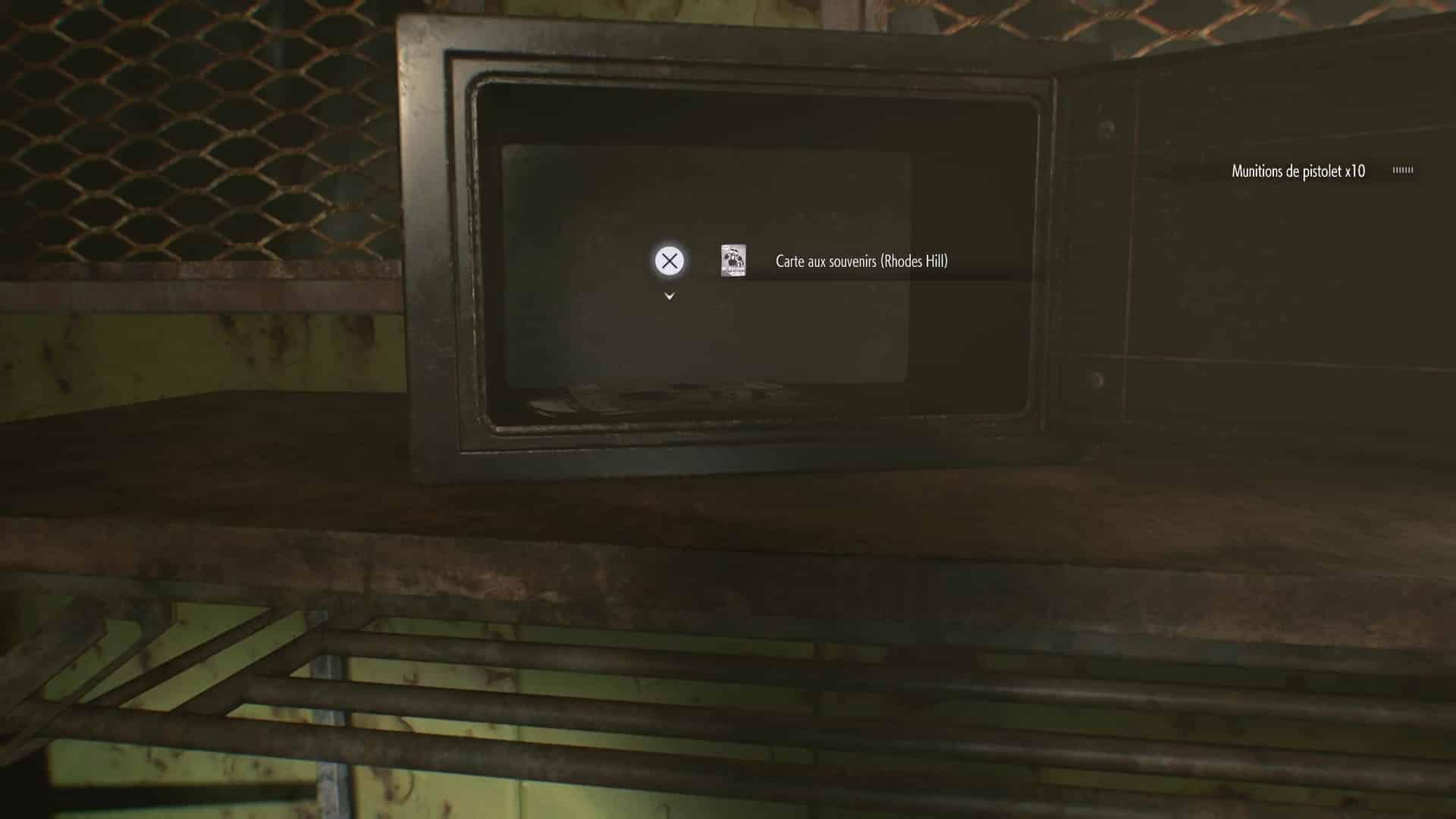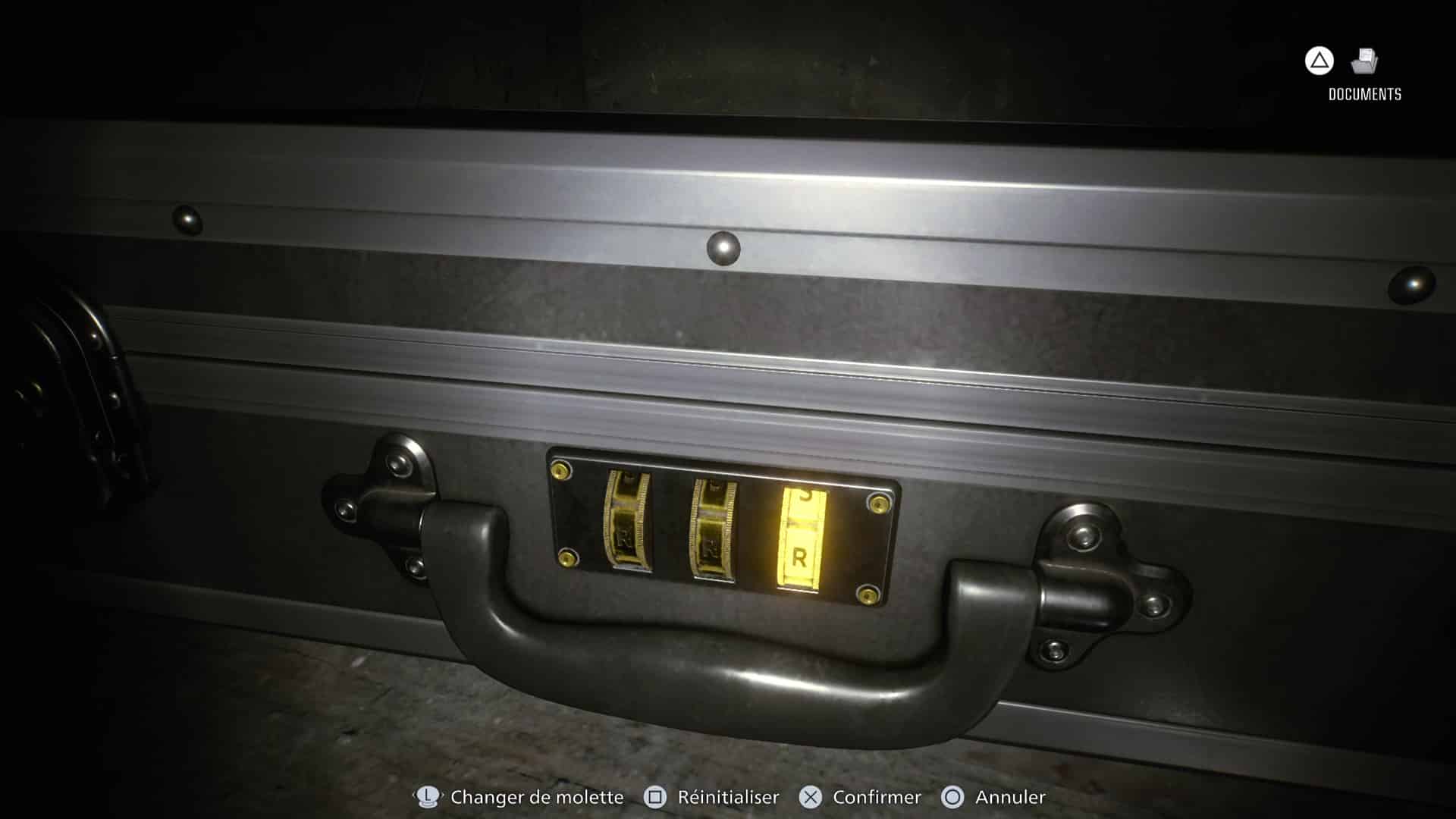 - Emplacement : La mallette se trouve dans le vestiaire du Bureau des S.T.A.R.S., dans le commissariat du R.P.D., au 1ᵉʳ étage accessible depuis l’échelle de la Réception. Plutôt qu’un coffre traditionnel, il s’agit cette fois d’une combinaison à trois lettres.