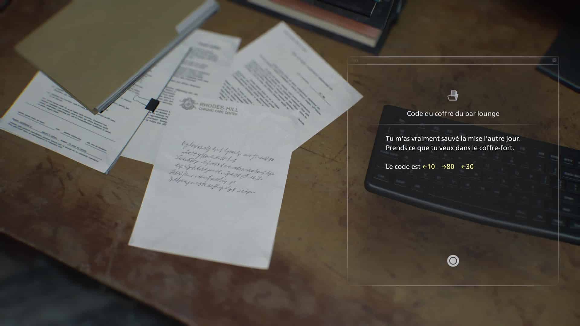 Dans Resident Evil Requiem, la manière d’ouvrir un coffre repose toujours sur le même schéma. Le code est inscrit sur un document à retrouver, et le déverrouillage consiste à tourner un bouton de droite à gauche à droite, ou inversement. Seul un coffre déroge à cette règle, ce que l’on vous détaille un peu plus bas.