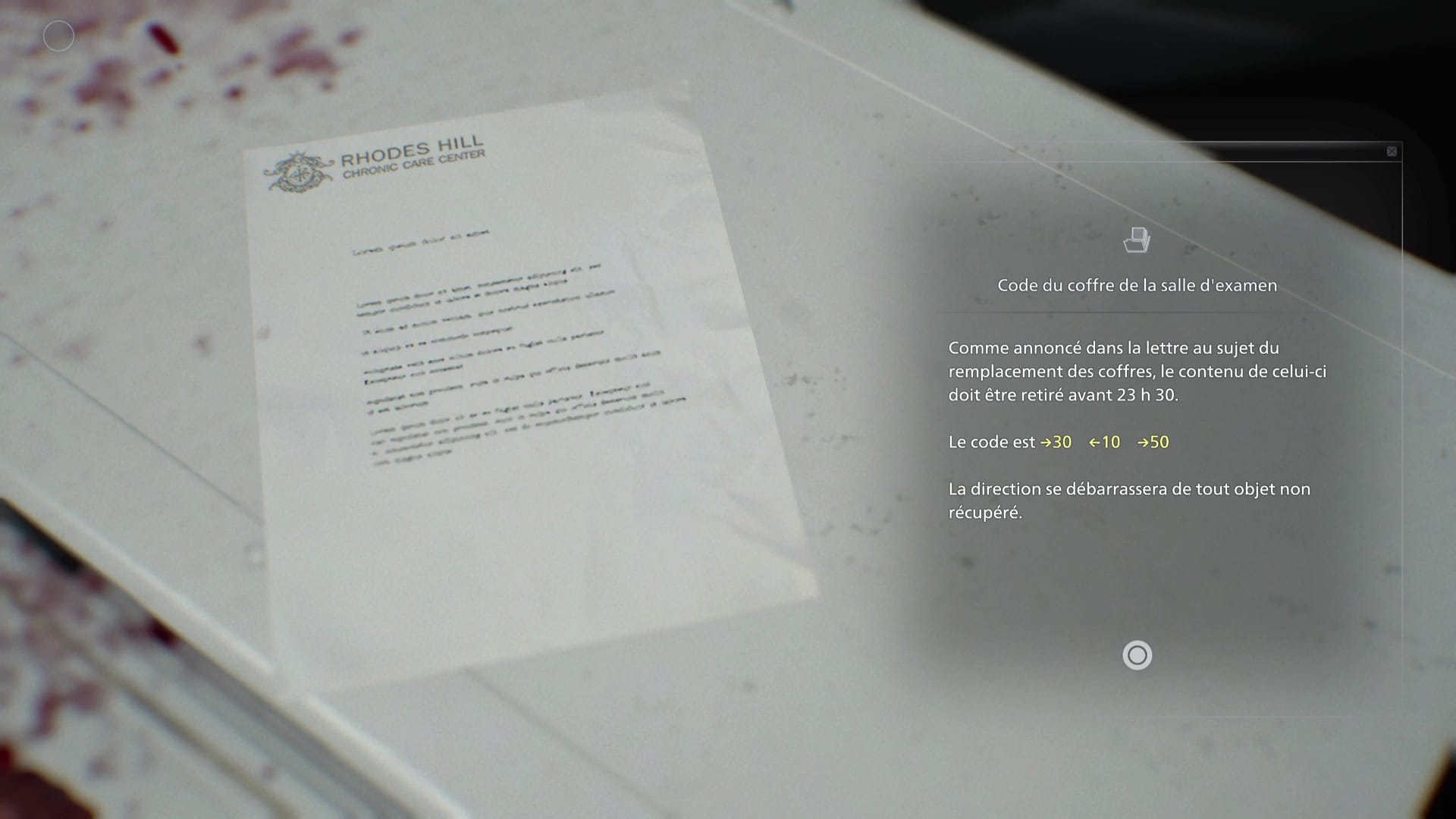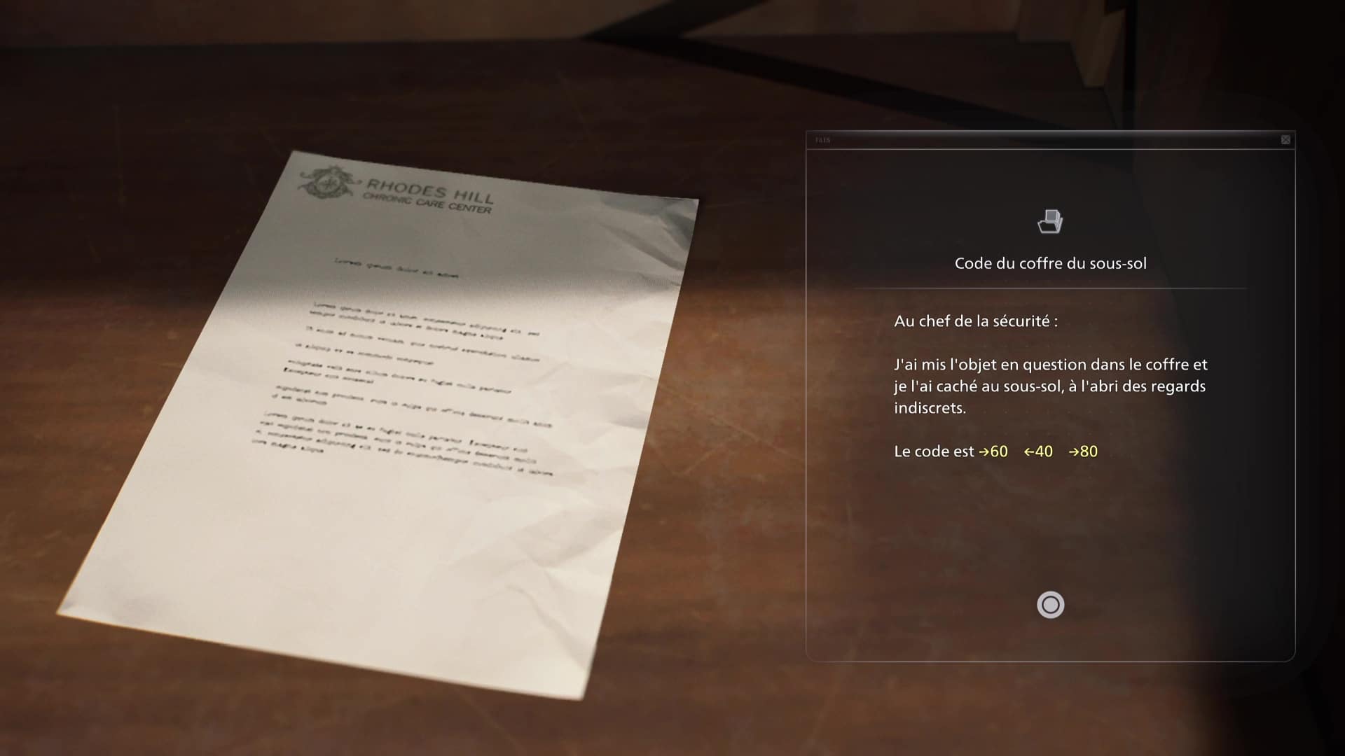 Vous obtiendrez cette information uniquement avec Leon, dès la fin du combat de boss contre le Chunk, dans le grenier. Déverrouillez la porte et, sur votre droite, une armoire attend d’être forcée. Grâce à votre hache, ouvrez-la, et vous pourrez ramasser le document contenant la combinaison. - Code (Mode Démentiel) : La combinaison est Gauche 70 – Droite 50 – Gauche 20.