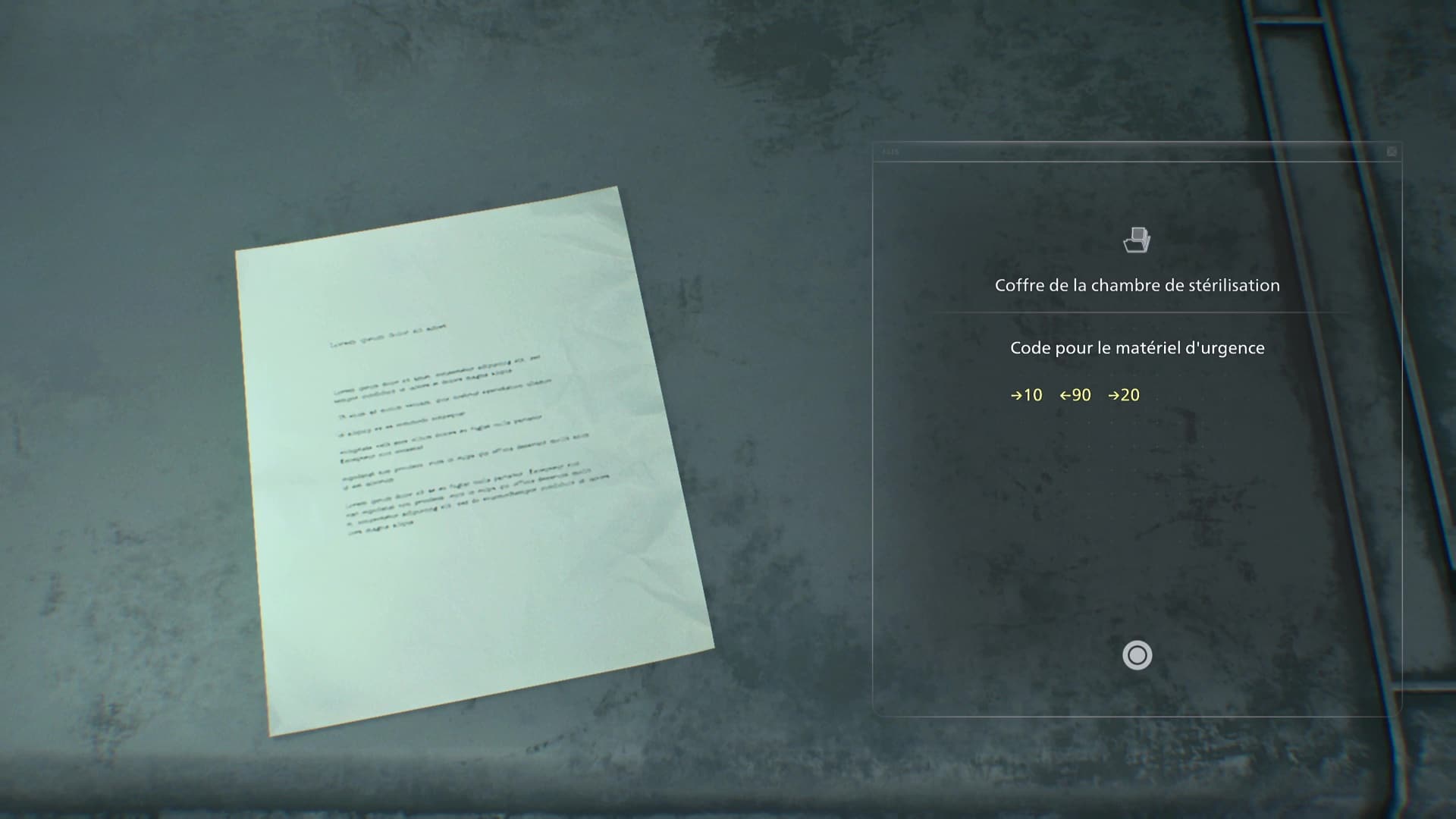 Vous obtiendrez cette information dans la salle Stock d’armes biologiques 05, dans un conteneur situé au milieu de la pièce, celui le plus à droite lorsque vous regardez la carte. - Code (Mode Démentiel) : La combinaison est Droite 20 – Gauche 0 – Droite 70.