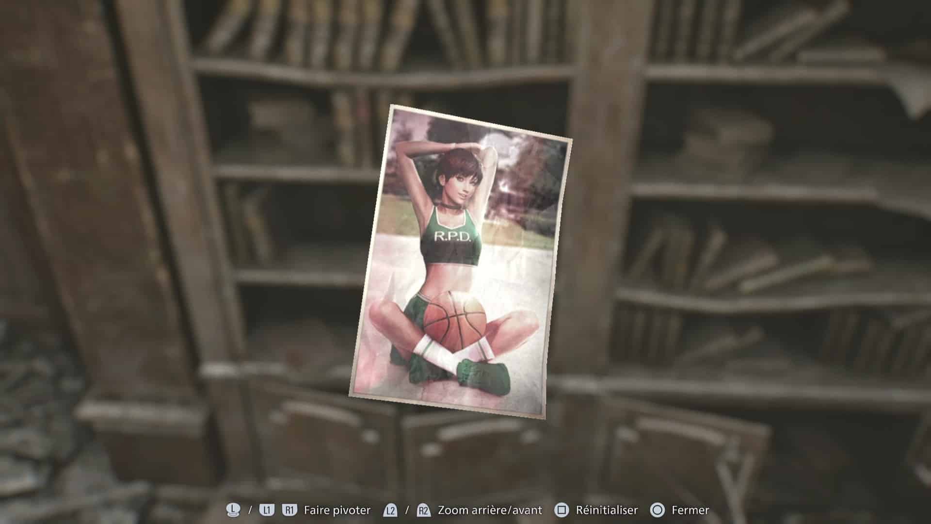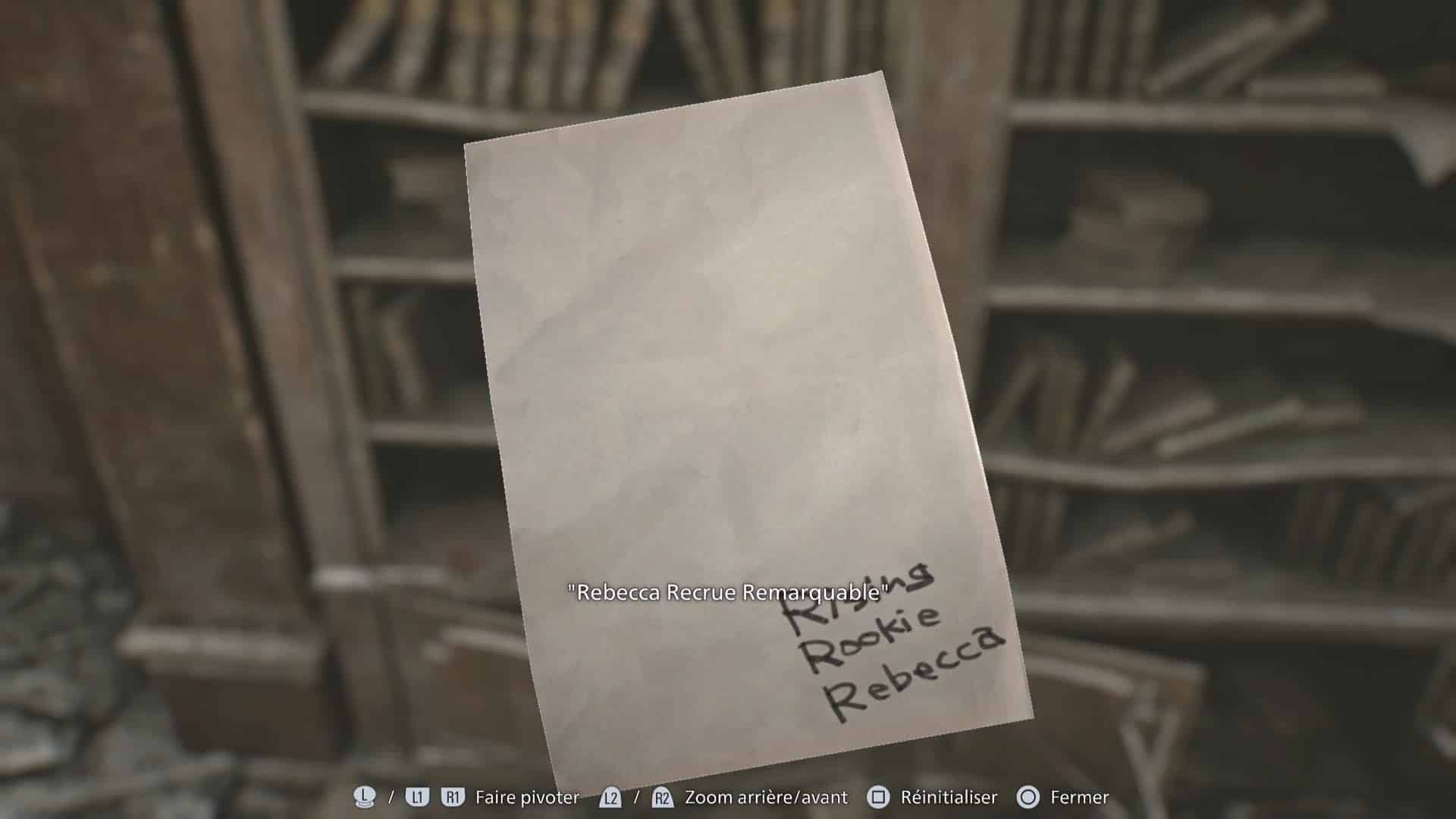 Vous obtiendrez cette information en obtenant deux documents. Récupérez d’abord la Carte de bibliothèque dans le Bureau des S.T.A.R.S. puis allez prendre la Photo dans le livre à l’étage de la Bibliothèque. Au verso de cette photo se trouve l’inscription « Rebecca Recrue Remarquable ». - Récompense : Porte-bonheur Ambition