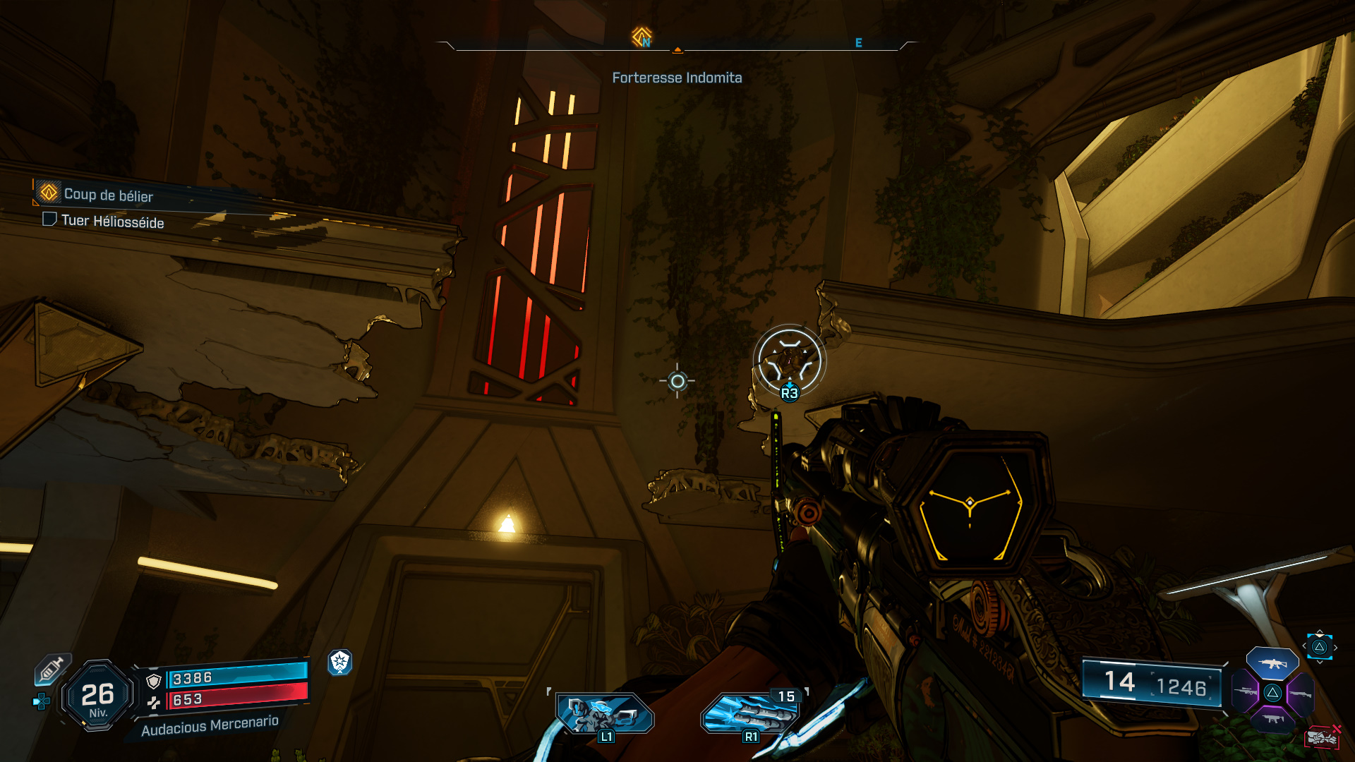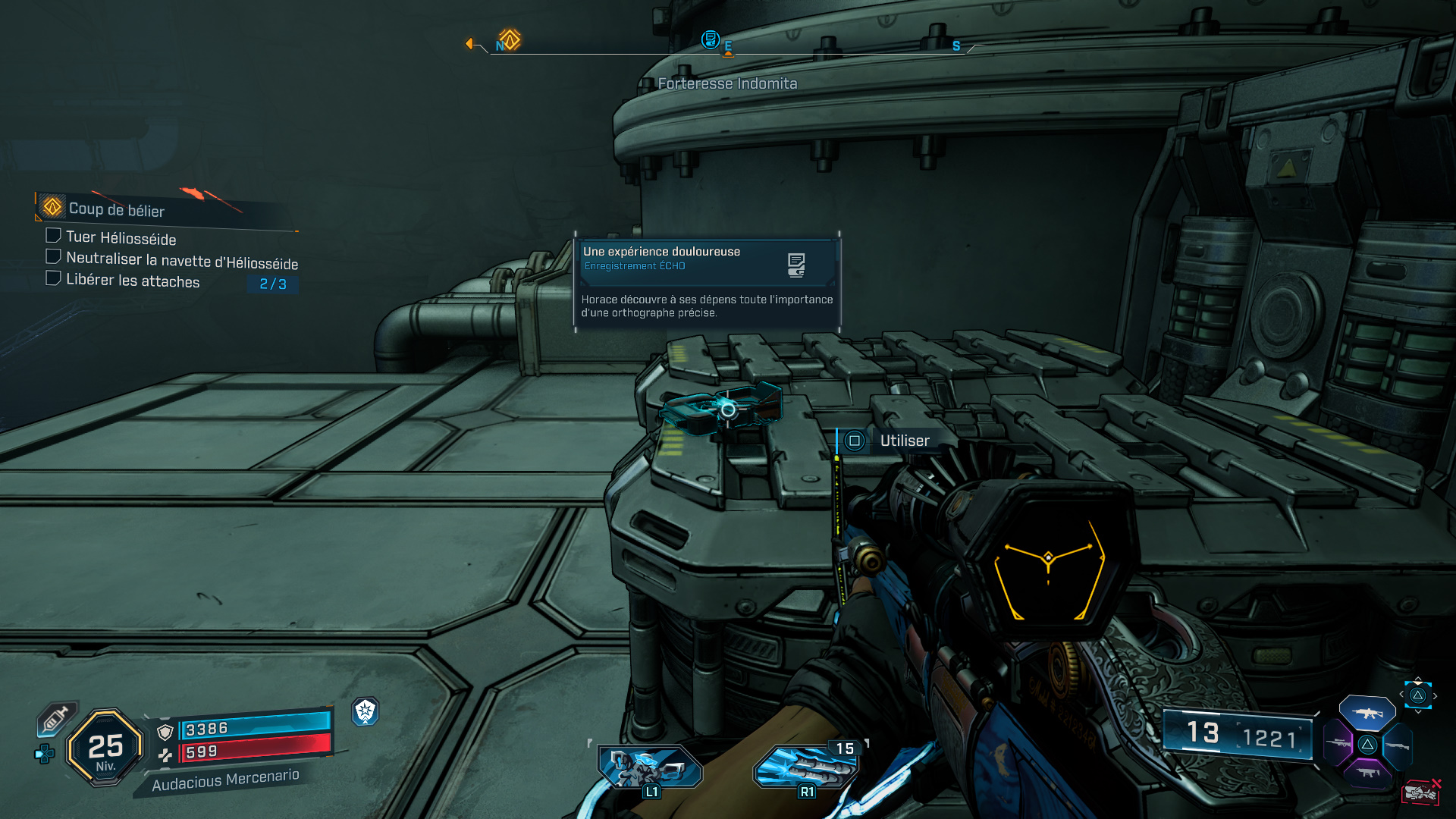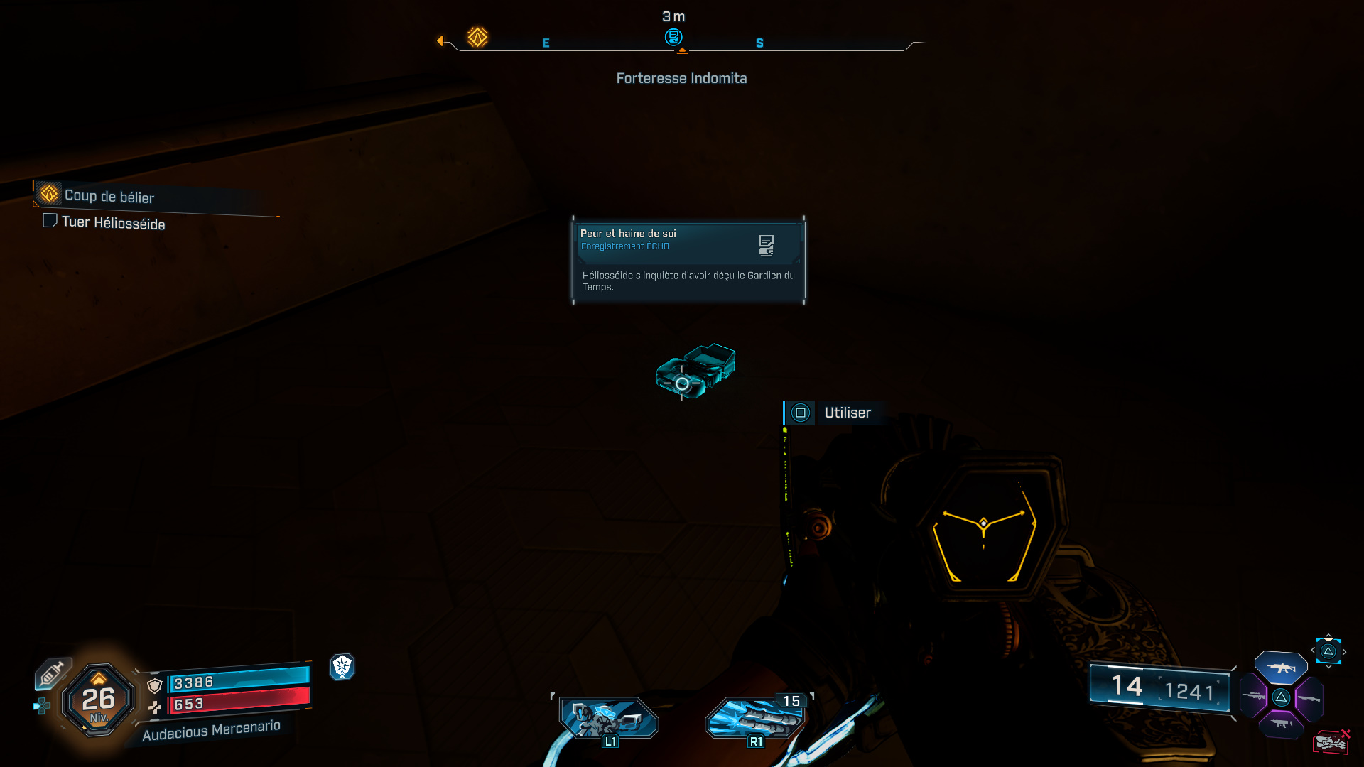 Après avoir activé la plateforme de ravitaillement, montez dessus puis repérez un point d’accroche en hauteur. Pour l’atteindre, faites un double saut et utilisez votre grappin pour ensuite trouver l’enregistrement sur une caisse, un peu plus loin sur votre gauche.