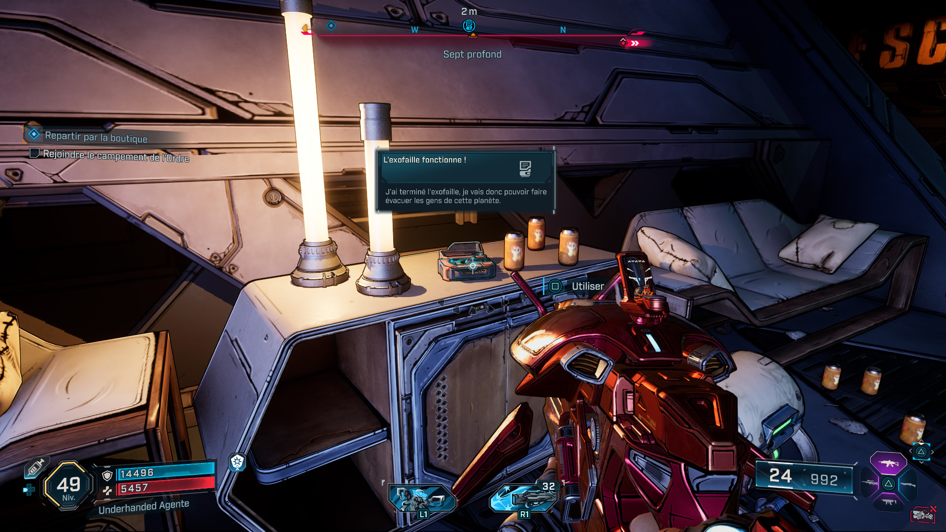 Emplacement : Au nord-ouest de la région, sur une table basse à droite après avoir descendu les escaliers à l’entrée du complexe, près du Silo des Sept Profond. Accessible au cours de la mission secondaire « Repartir par la boutique« .