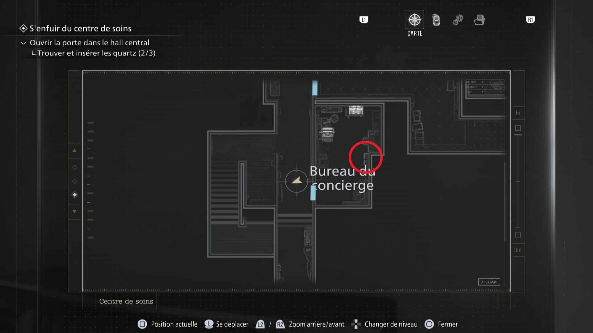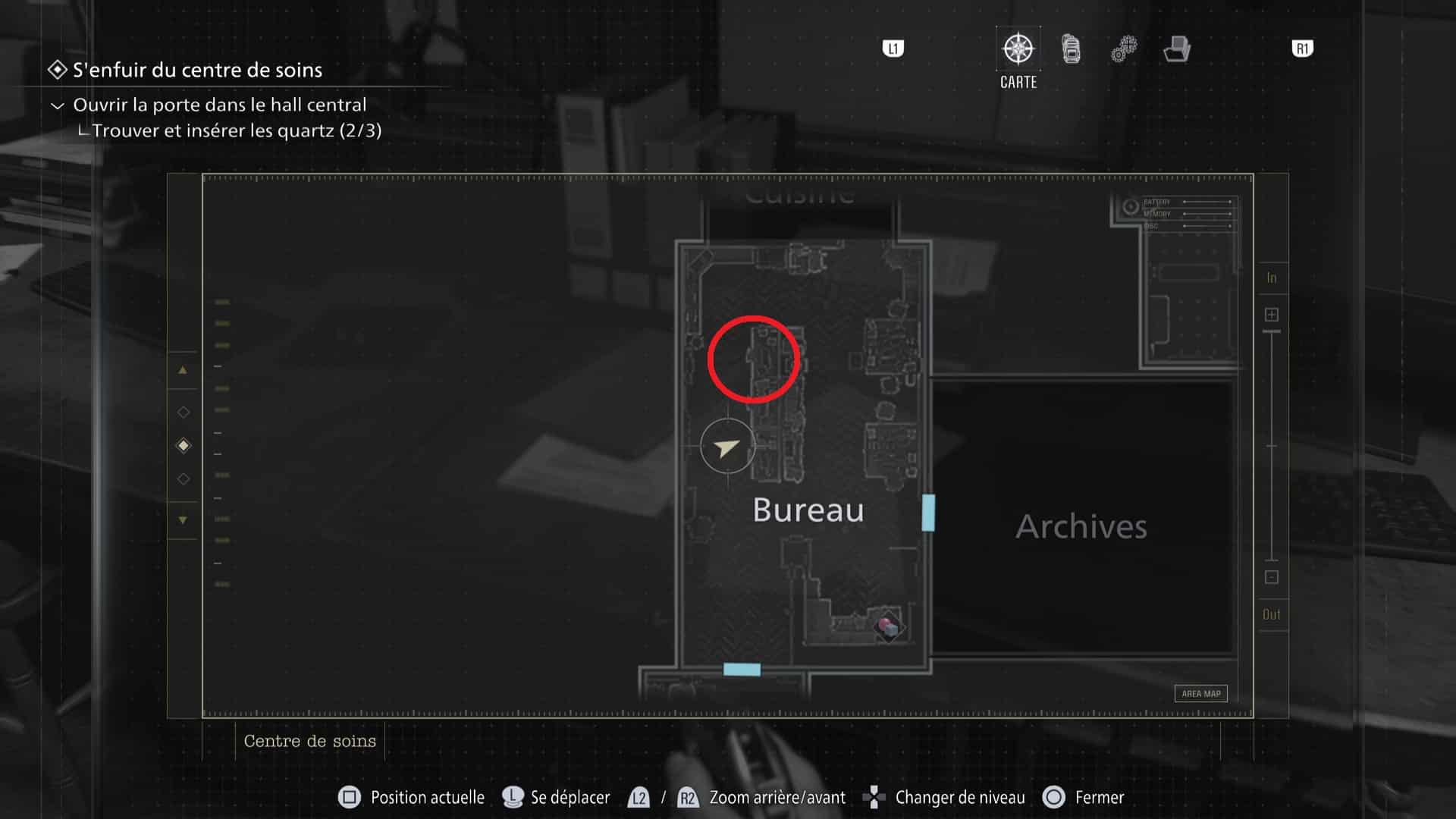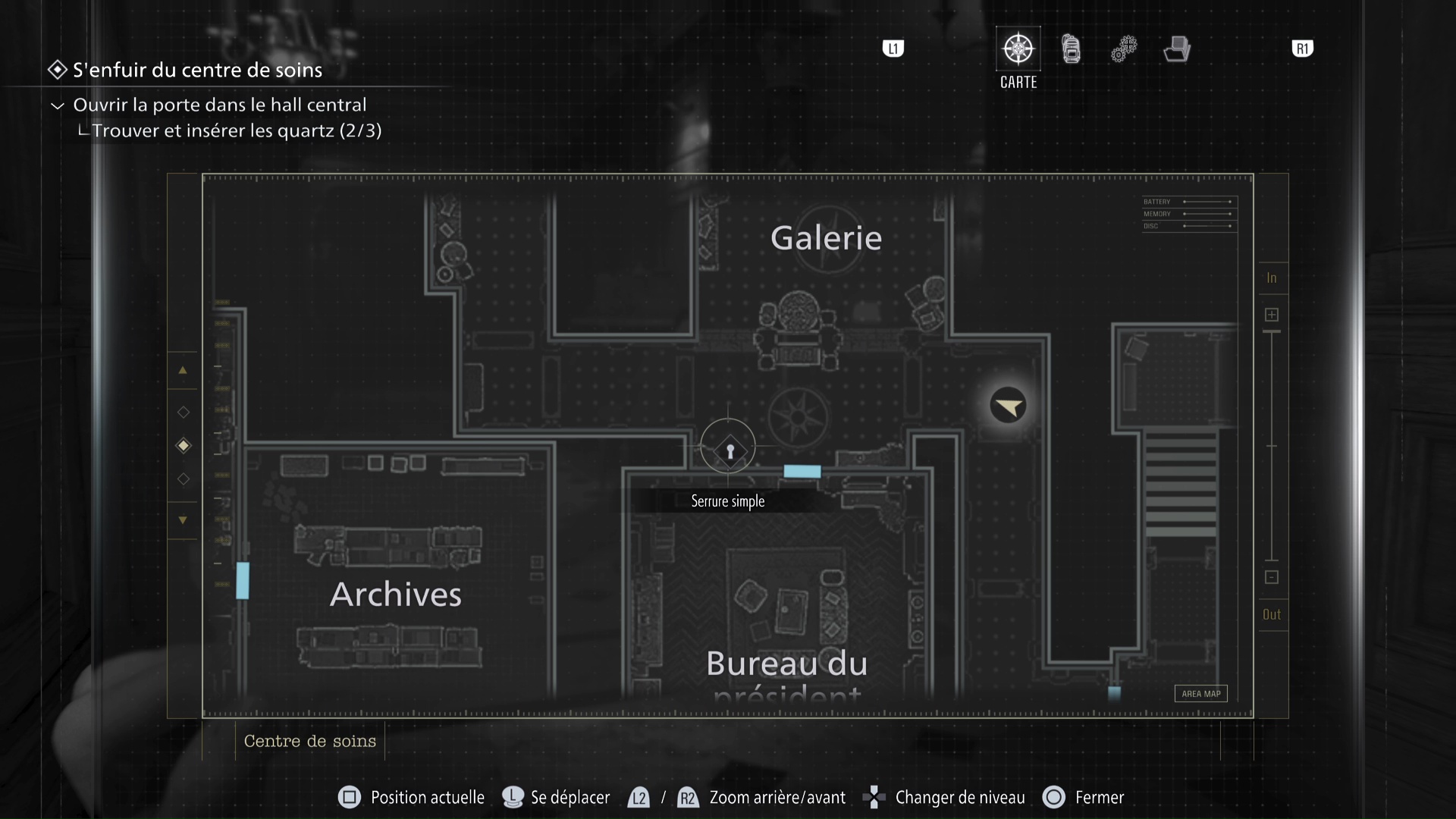 - Emplacement : Un deuxième tiroir à serrure simple se trouve au 1ᵉʳ étage de l’aile ouest du centre de soins, juste à côté de la porte d’entrée du Bureau du président.