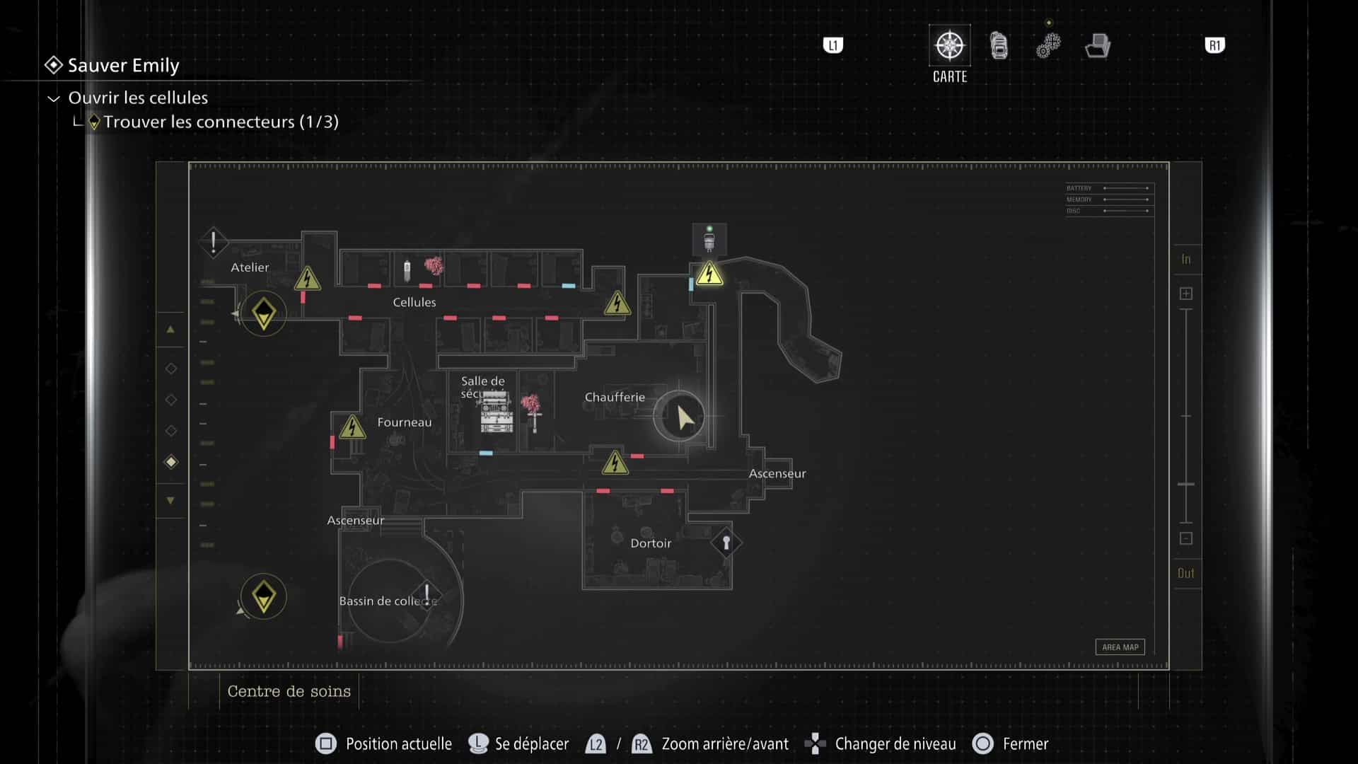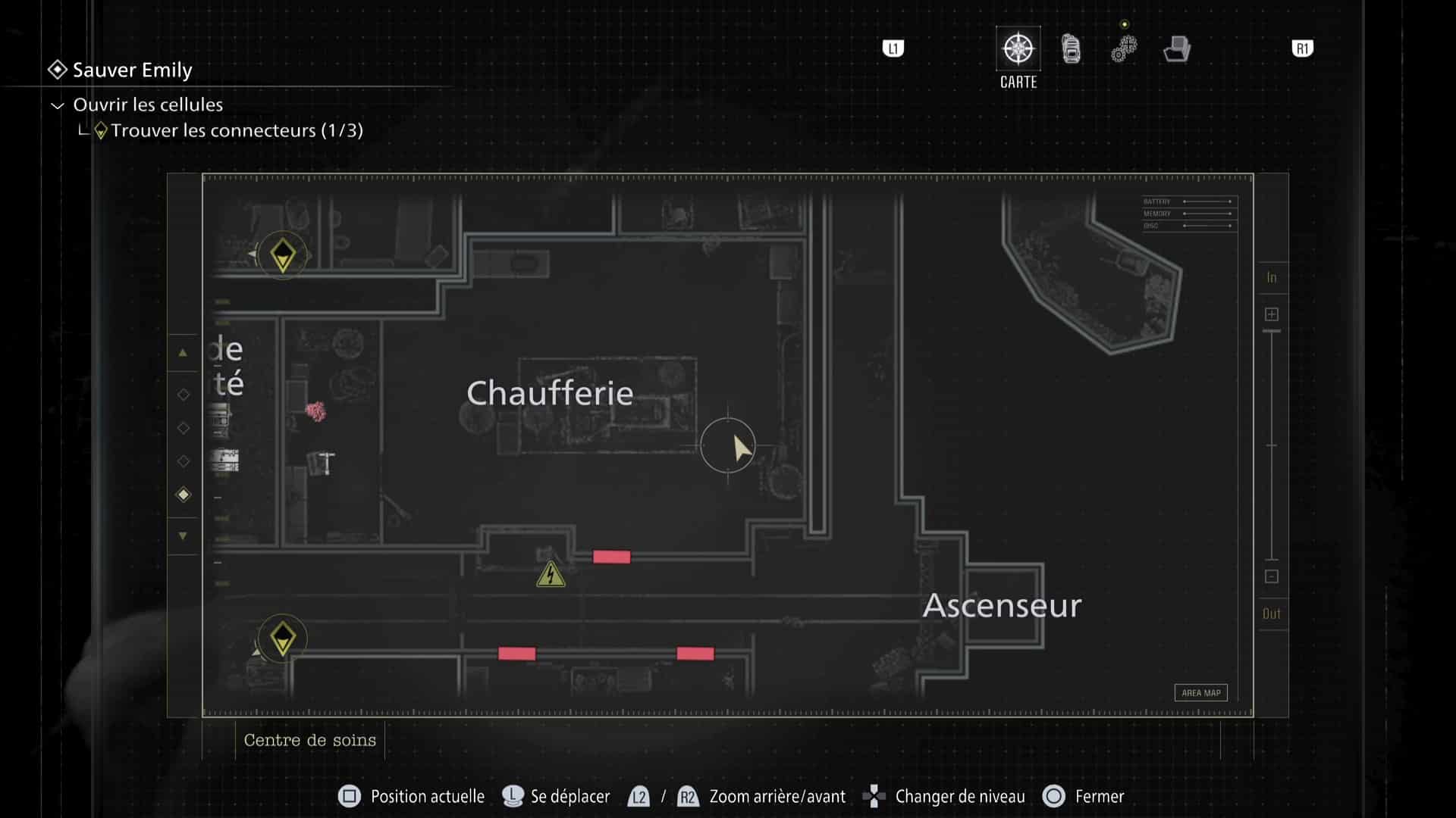 - Emplacement : Rendez-vous cette fois dans le sous-sol du centre de soins de Rhodes Hill. Progressez jusqu’à devoir entrer dans la Chaufferie, où se trouve une boîte à outils et la clé en T. Cette zone est légèrement inondée et vous infligerait un coup de jus si le courant est mal distribué. Il faut donc placer le connecteur près de l’accès à l’arrière de la Chaufferie. Une fois dans cette zone, faites le tour de la structure au milieu pour apercevoir, dans l’eau, le crochet.
