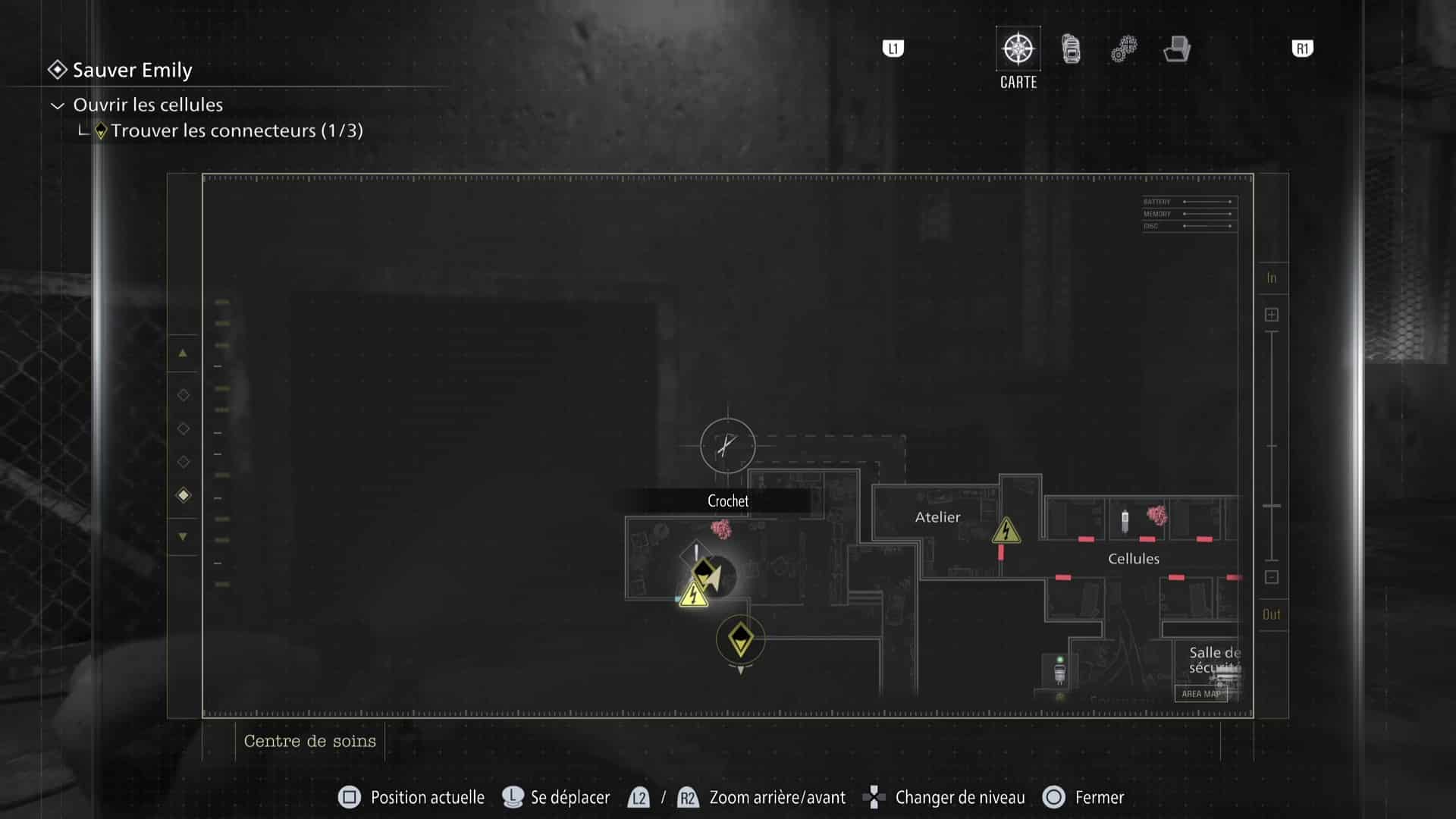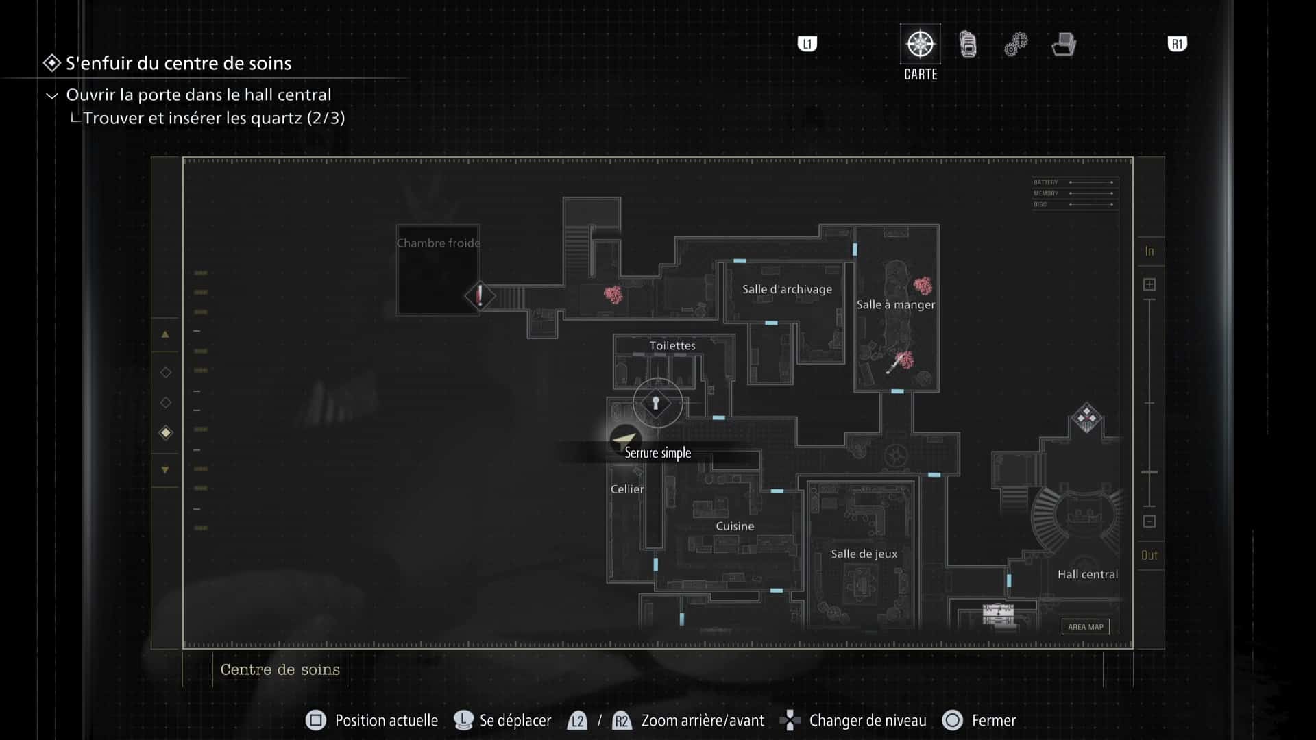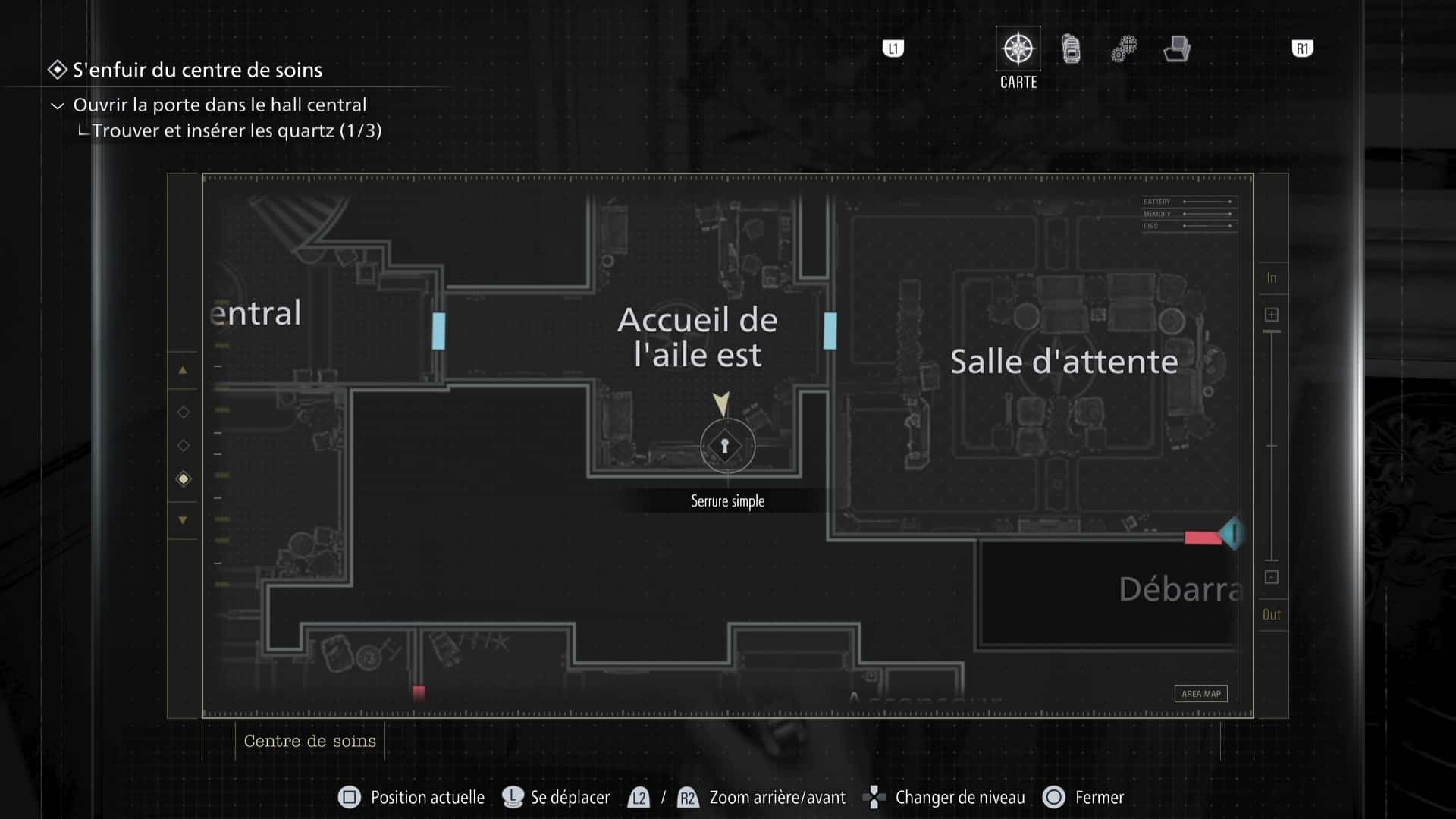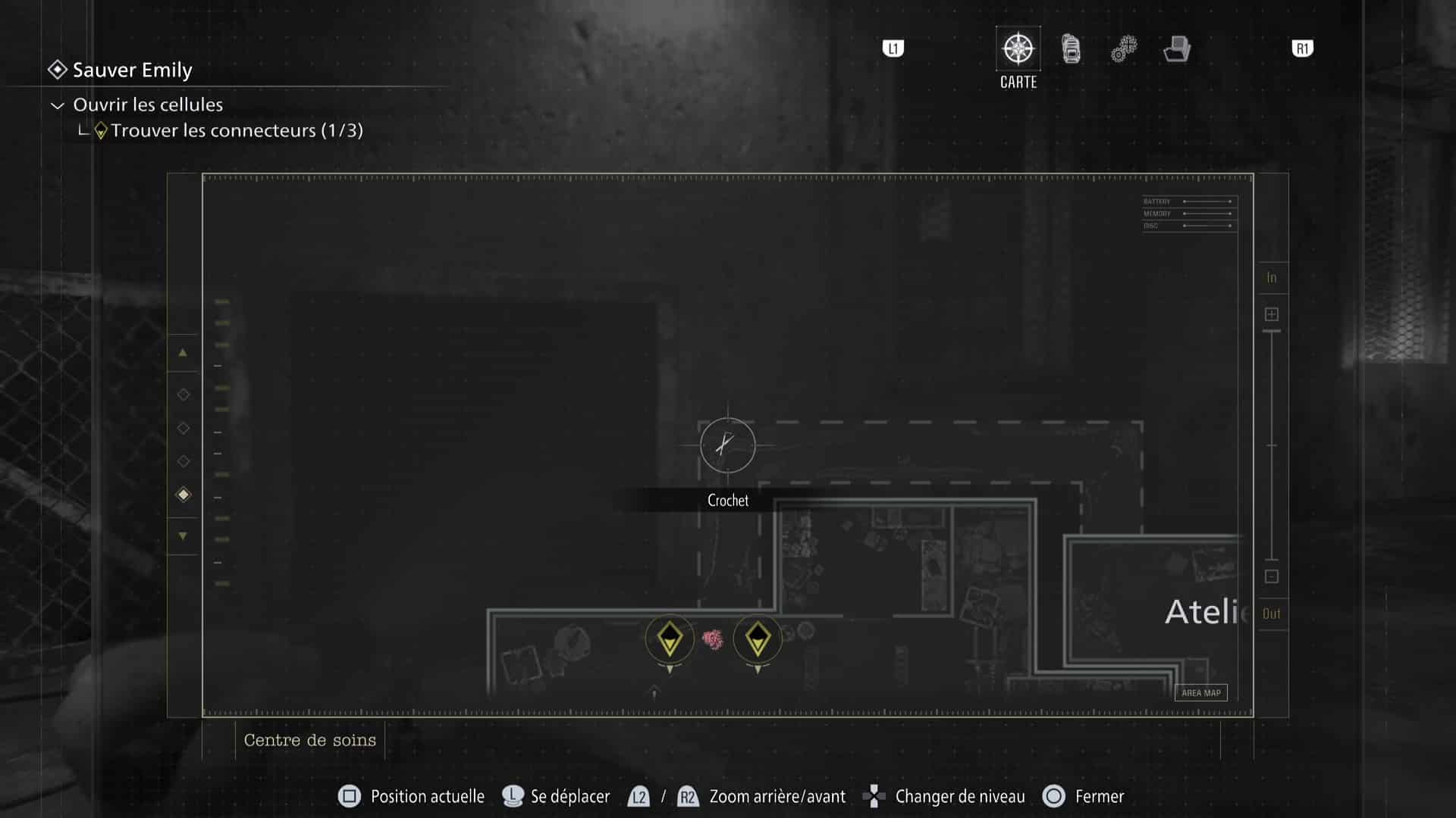 - Emplacement : Le deuxième crochet que vous pouvez obtenir vous attend dans le Bureau du concierge, dans l’aile ouest de Rhodes Hill. Il faut avoir déverrouillé l’accès à la deuxième partie de l’aile grâce au bracelet d’identification Nv.1. Une fois dans la salle de sauvegarde, fouillez les casiers. Dans l’un d’entre eux, vous trouverez un crochet.