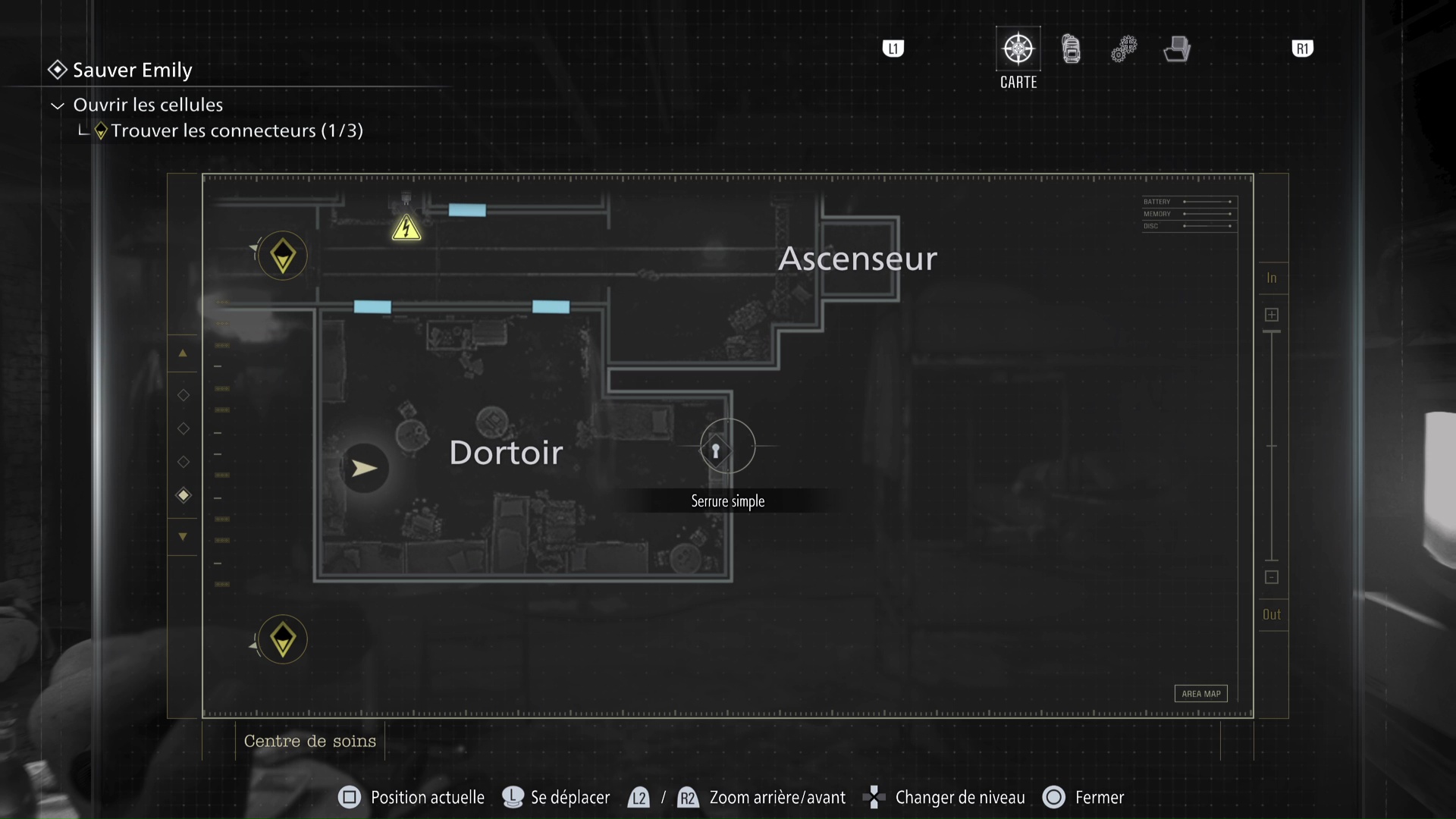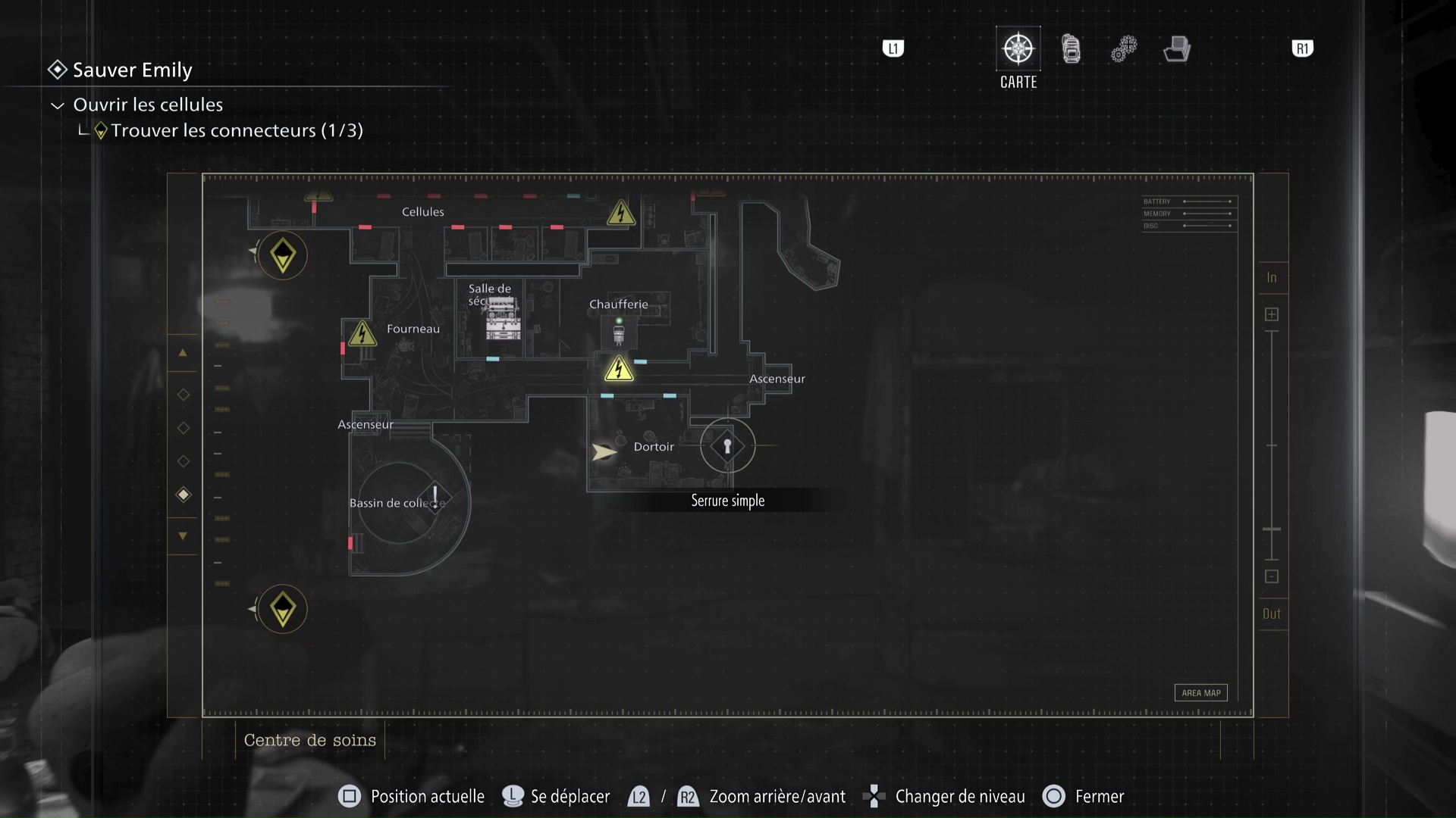 - Emplacement : Deux casiers verrouillés sont dans le sous-sol du centre de soins de Rhodes Hill. Le premier est au fond à gauche du Dortoir, en entrant. Nécessite évidemment l’usage d’un connecteur pour ouvrir la salle.
