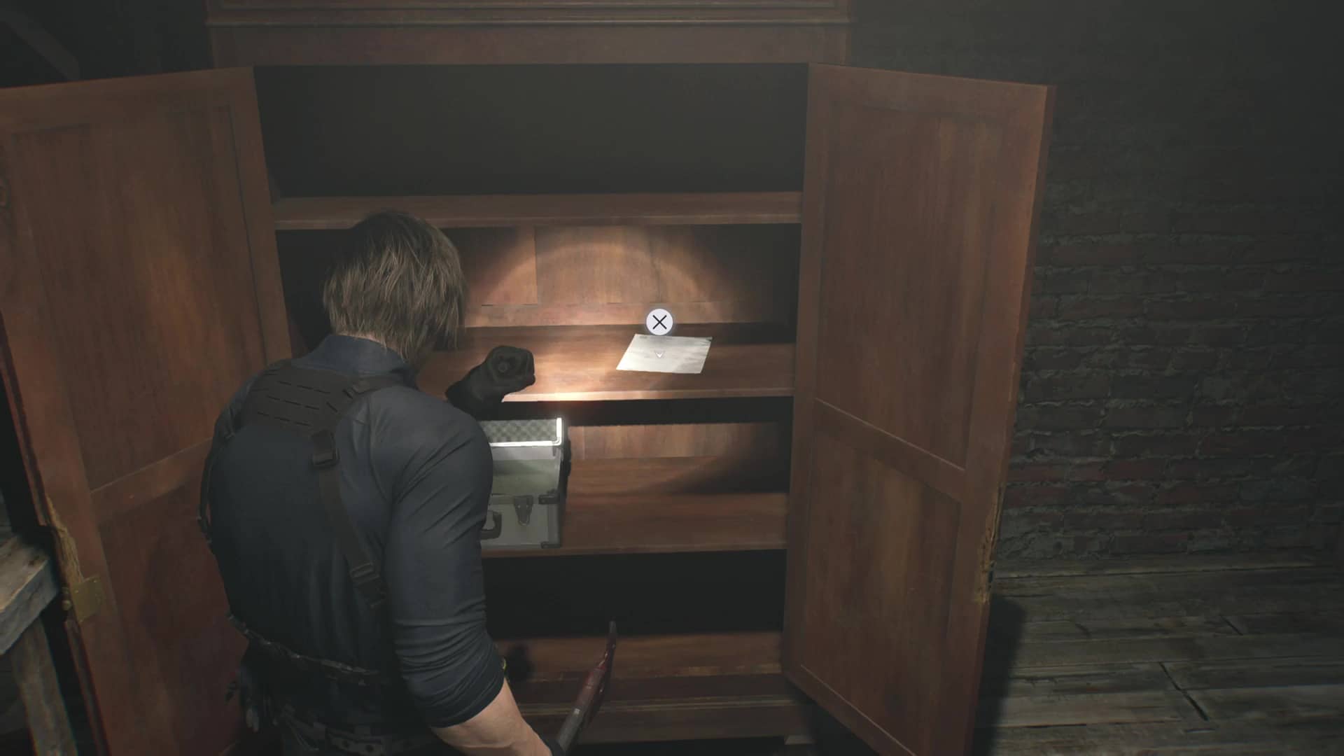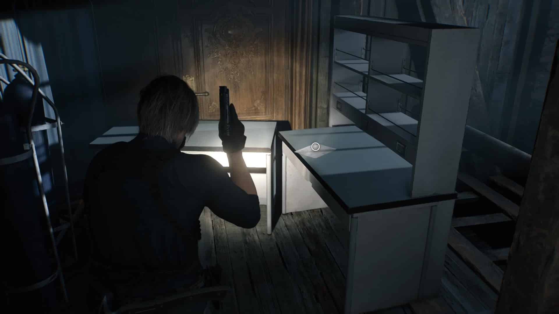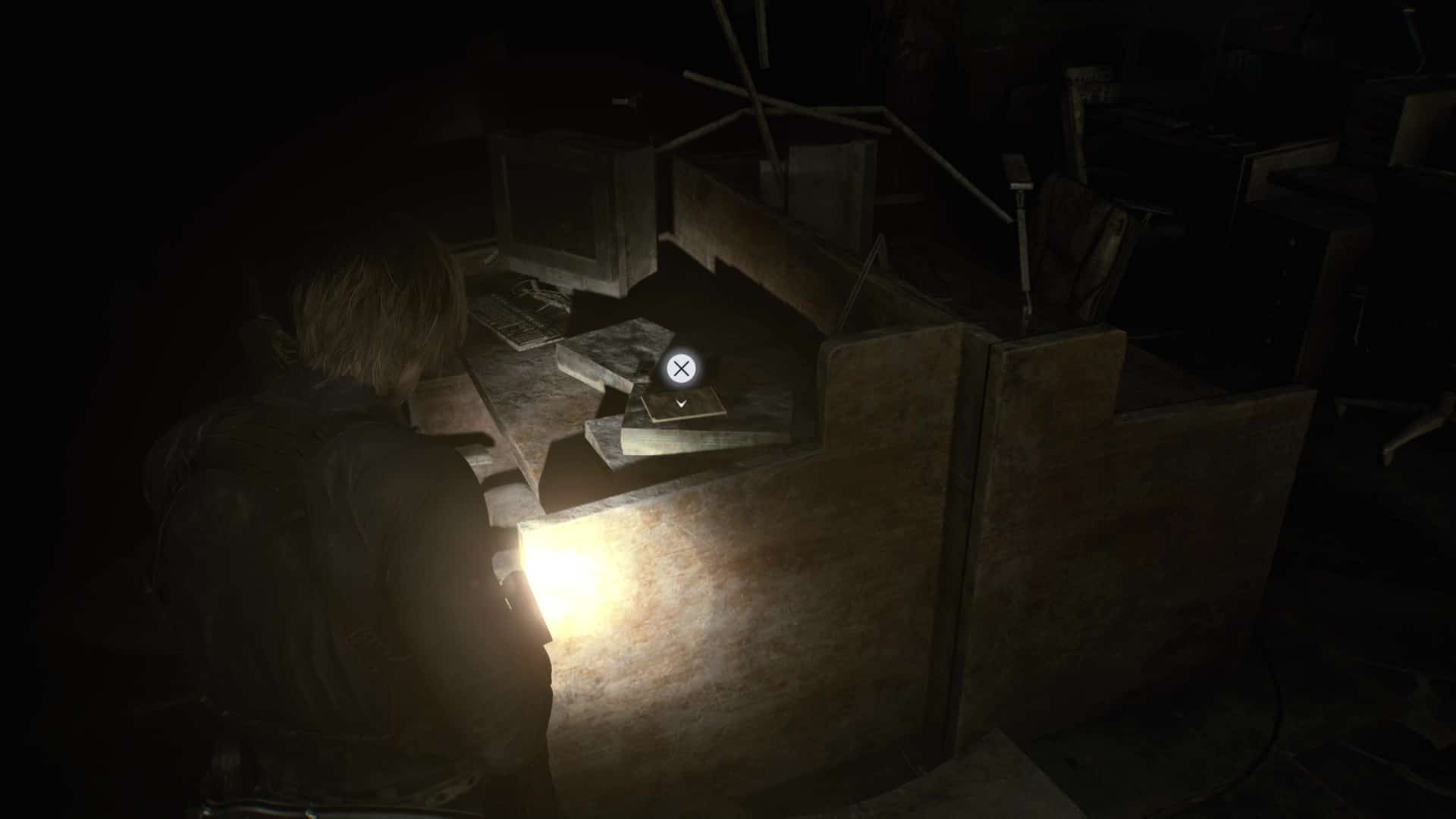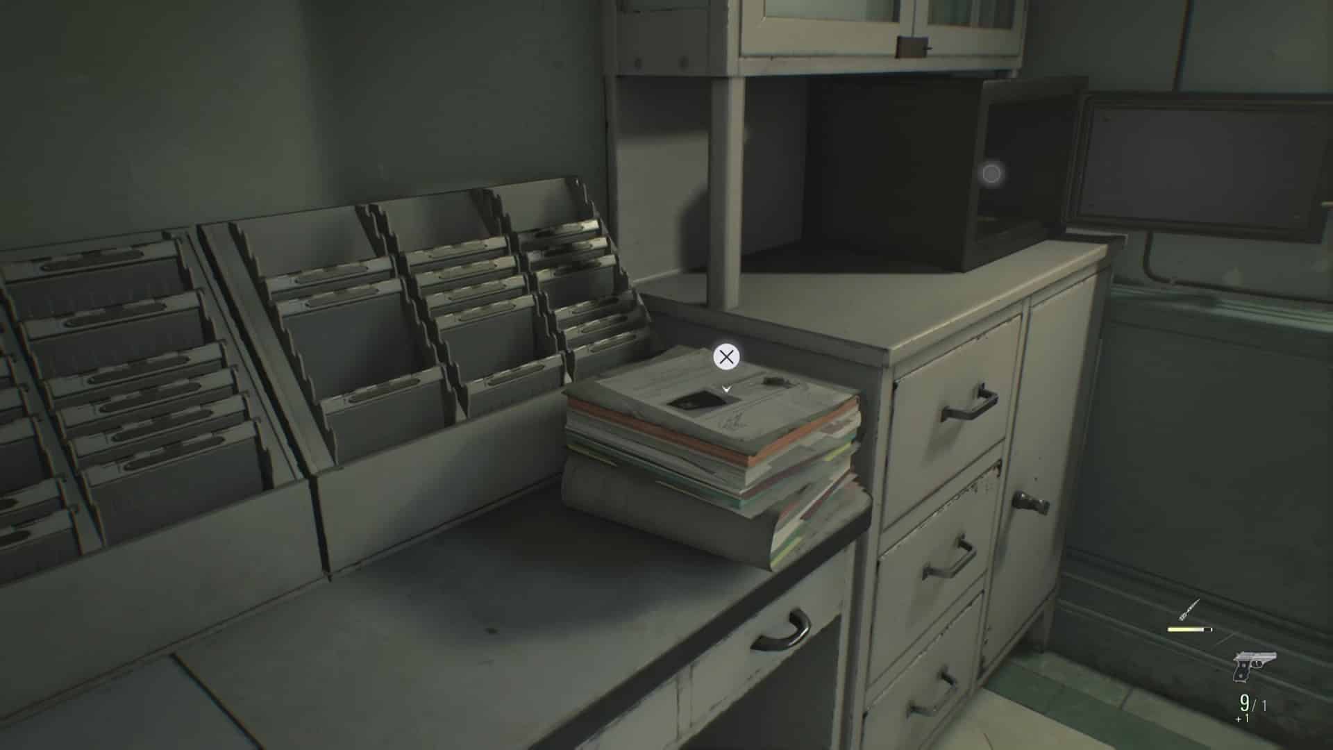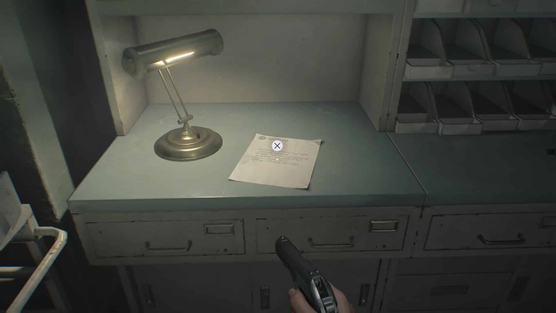 - Emplacement : Peu de temps après avoir repris le contrôle de Leon et AVANT de soulever un meuble pour vous faufiler dans le Grenier, tournez la tête vers la gauche pour trouver le document sur un bureau.