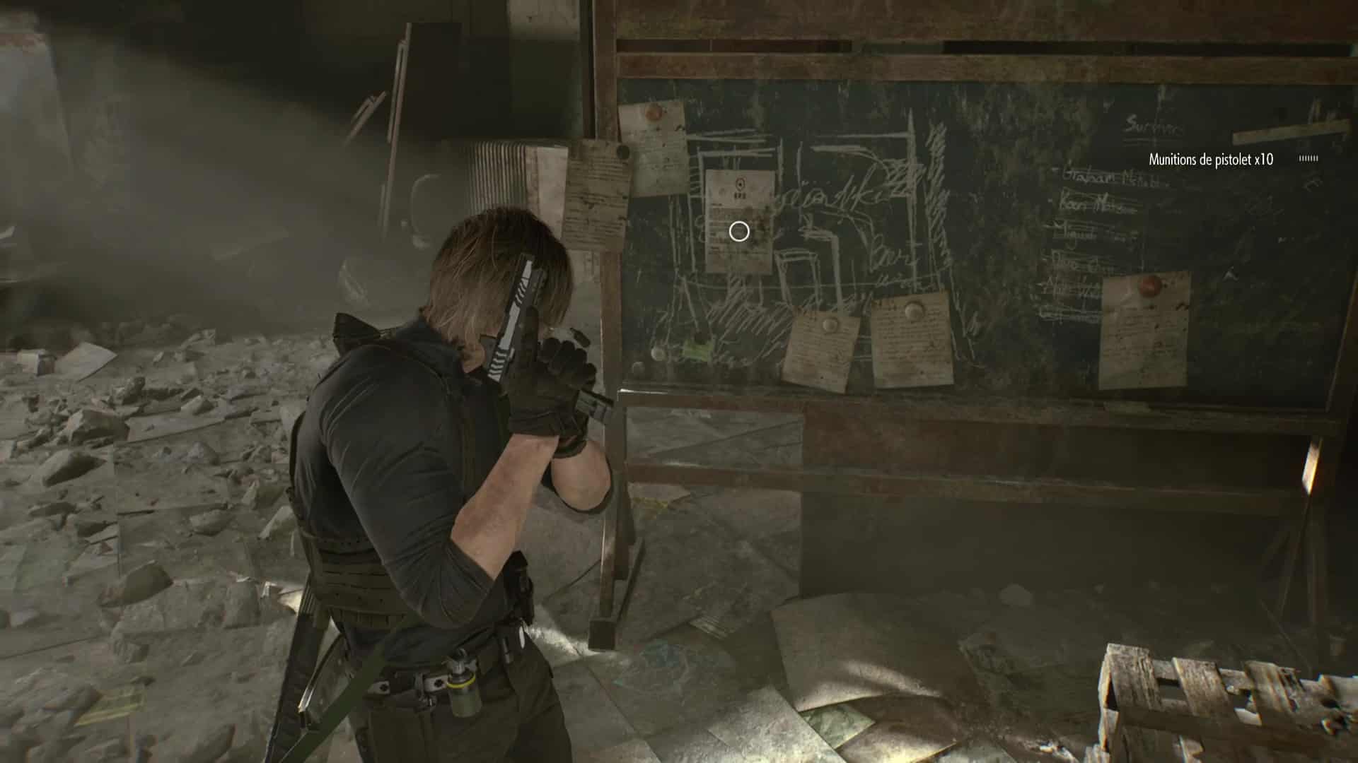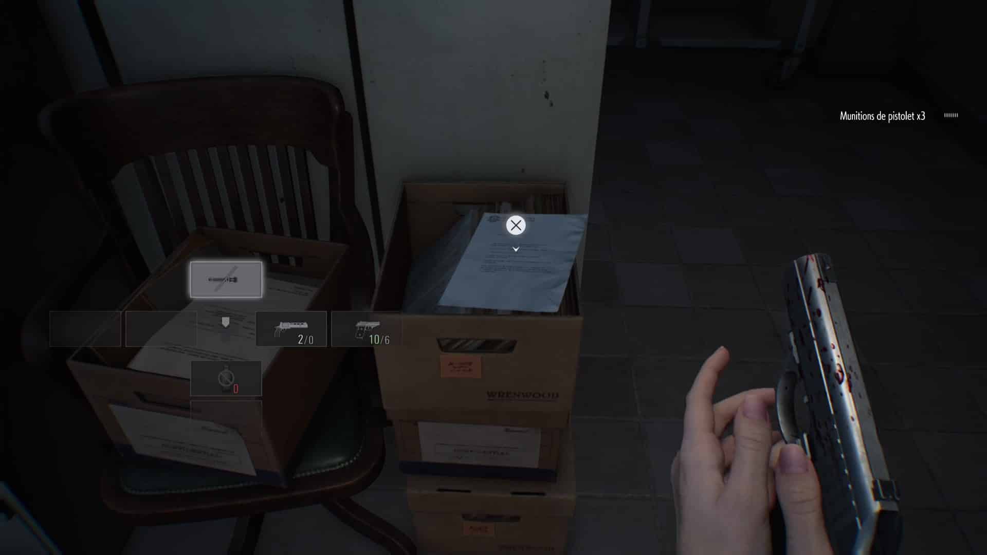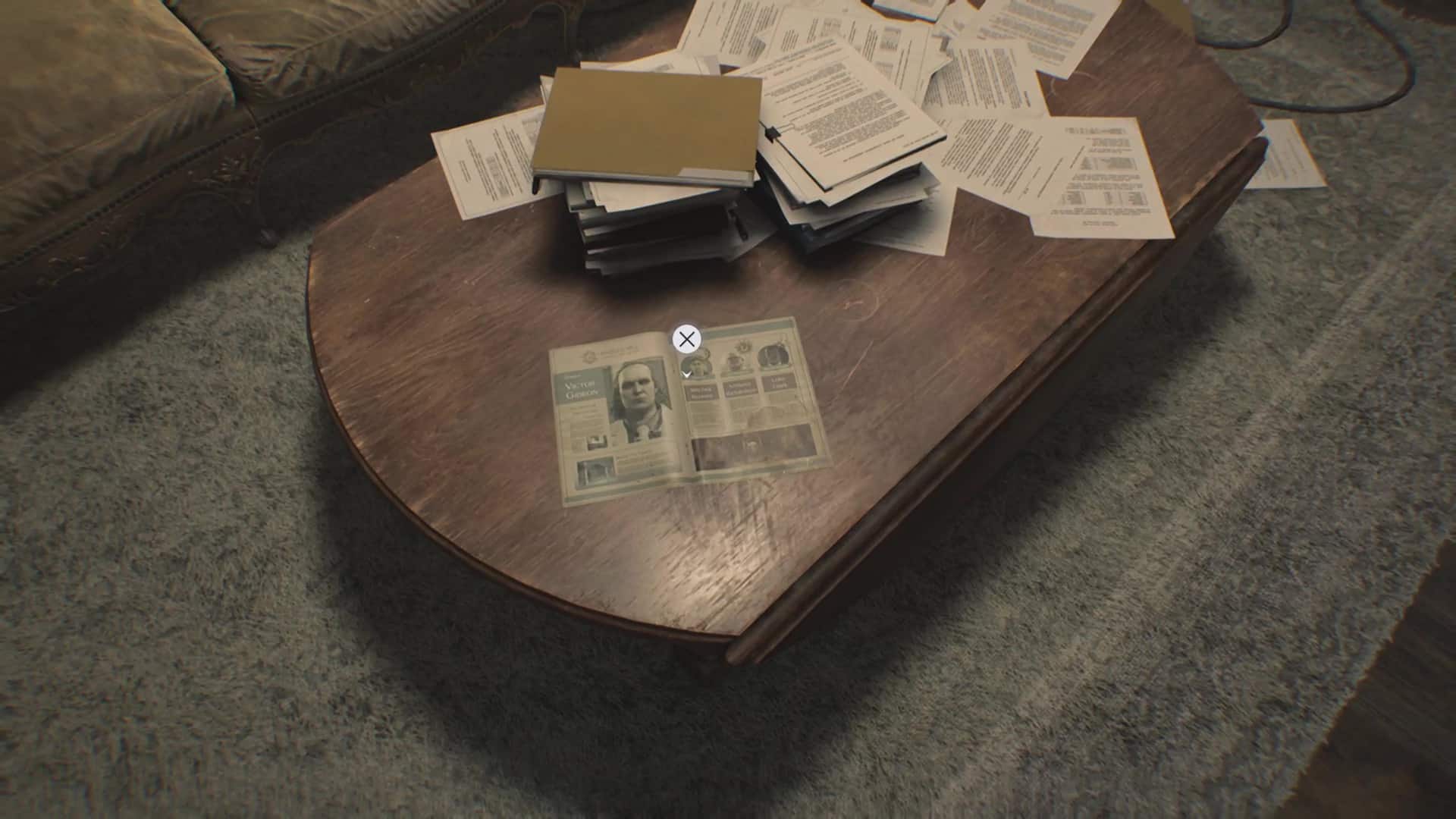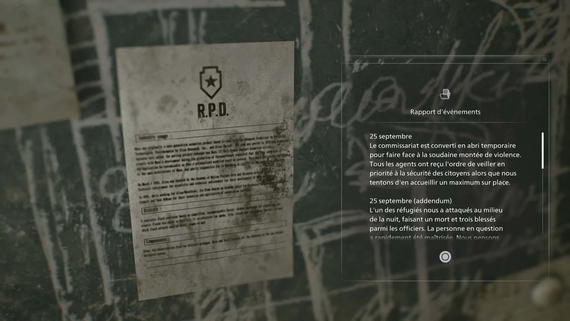- Emplacement : Peu de temps après avoir repris le contrôle de Leon et AVANT de soulever un meuble pour vous faufiler dans le Grenier, tournez la tête vers la gauche pour trouver le document sur un bureau.