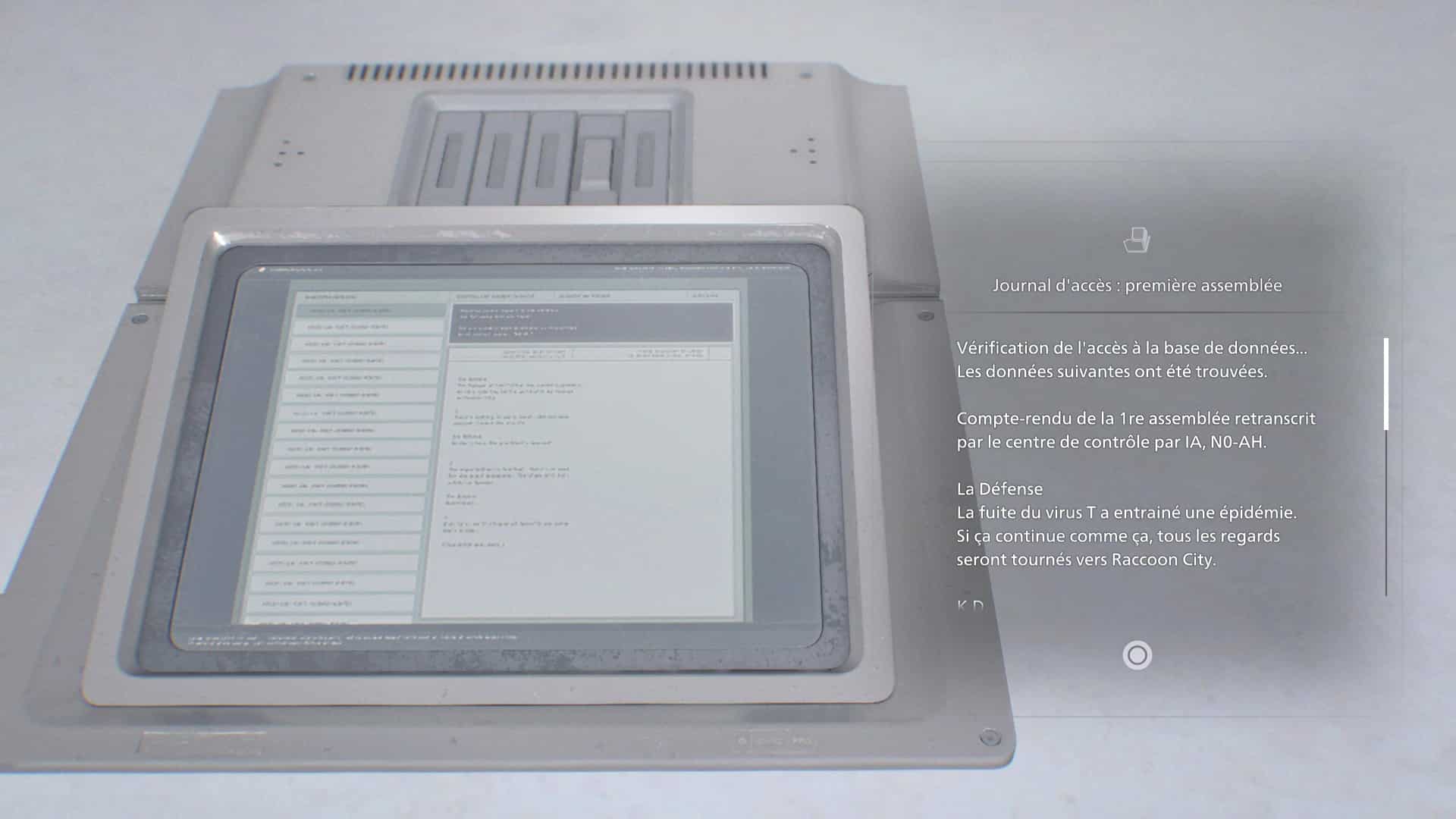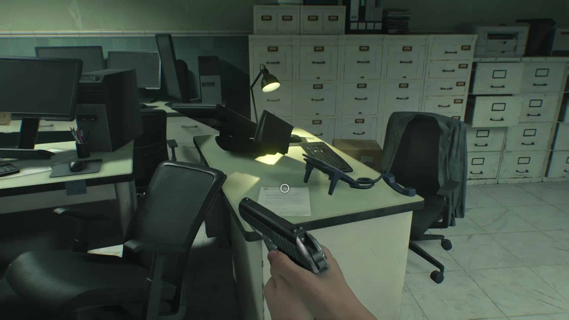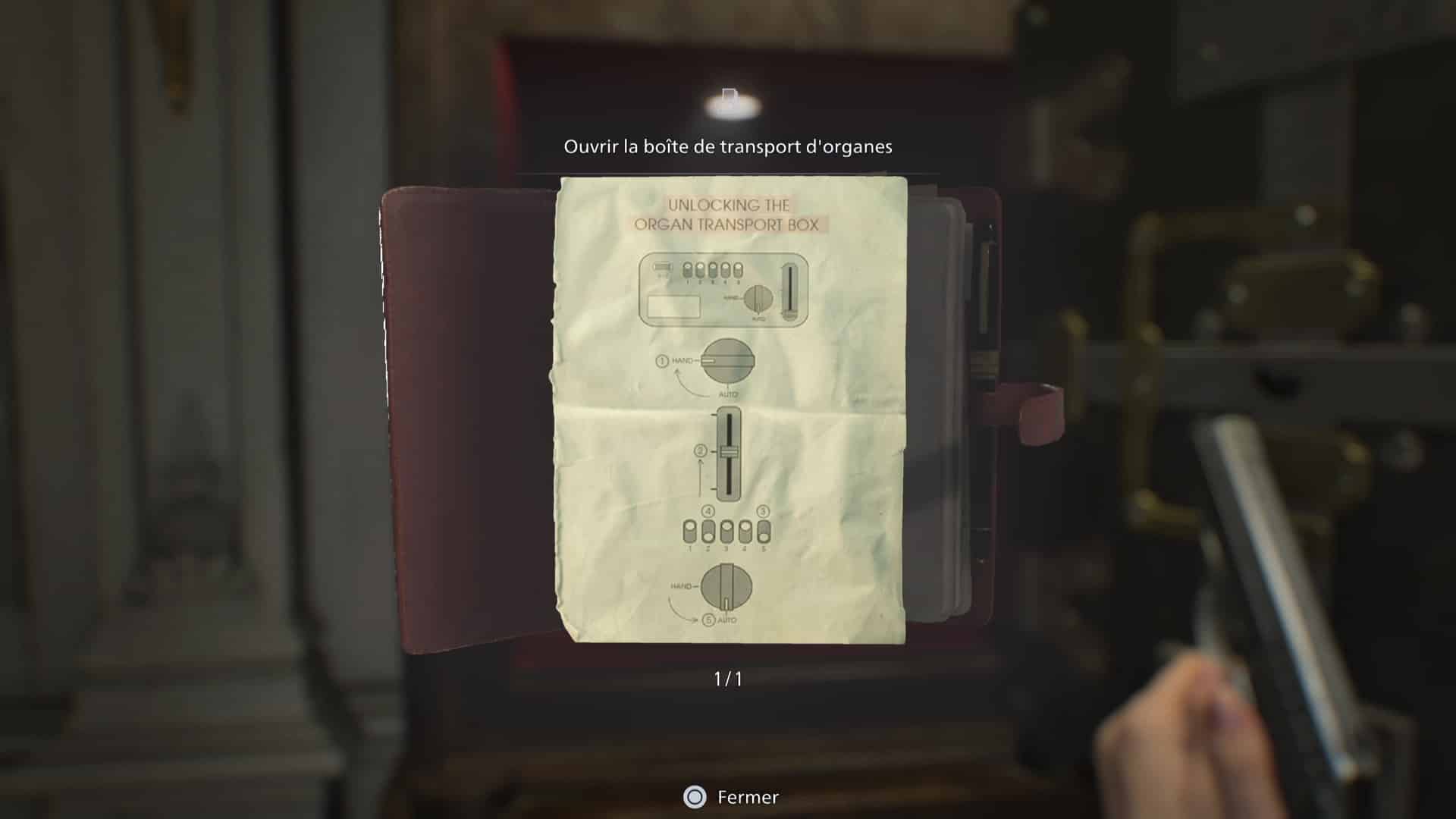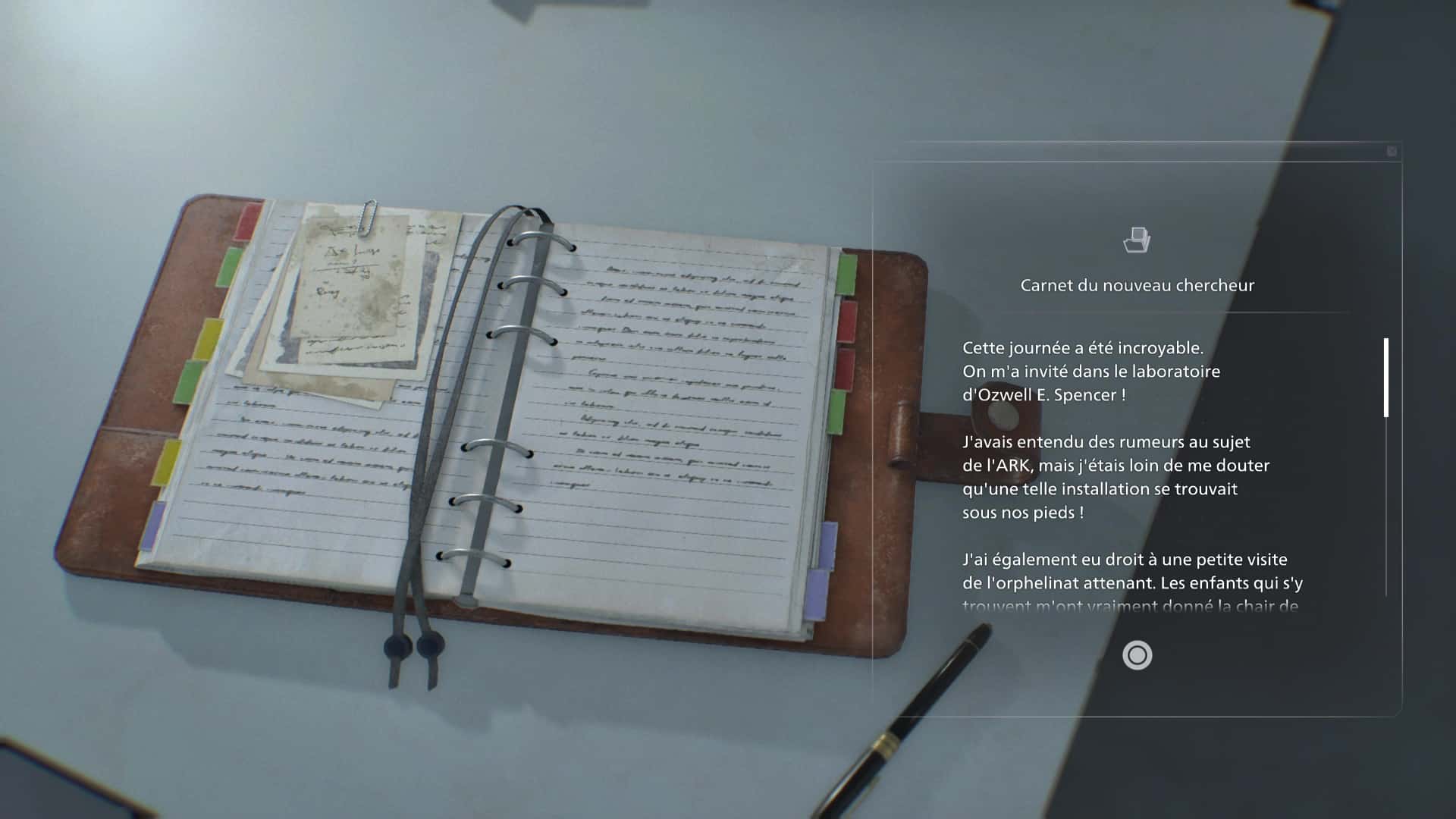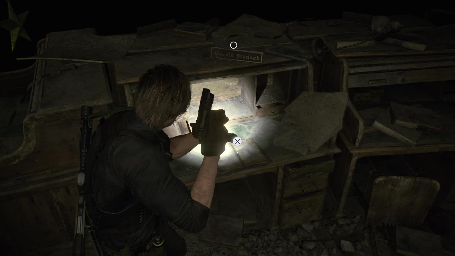 - Emplacement : Peu de temps après avoir repris le contrôle de Leon et AVANT de soulever un meuble pour vous faufiler dans le Grenier, tournez la tête vers la gauche pour trouver le document sur un bureau.