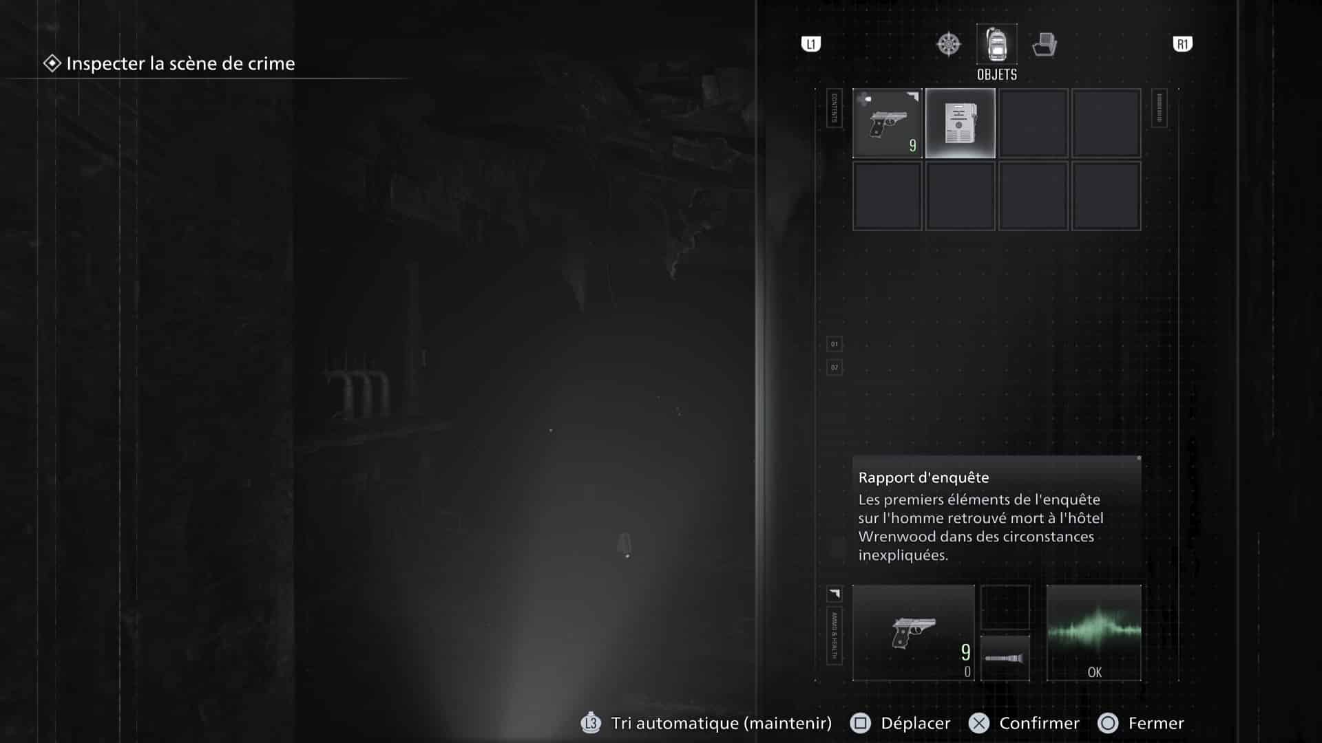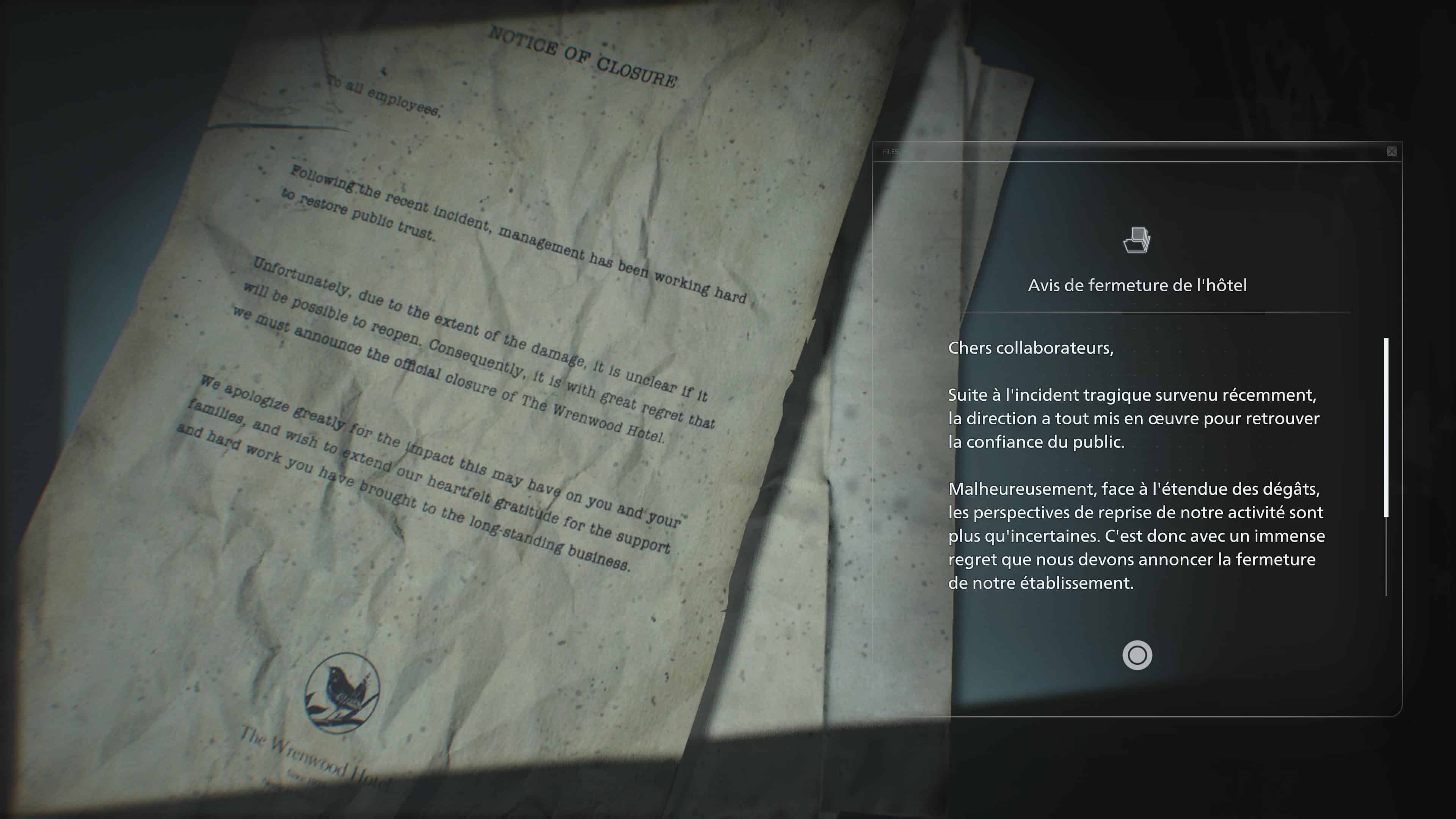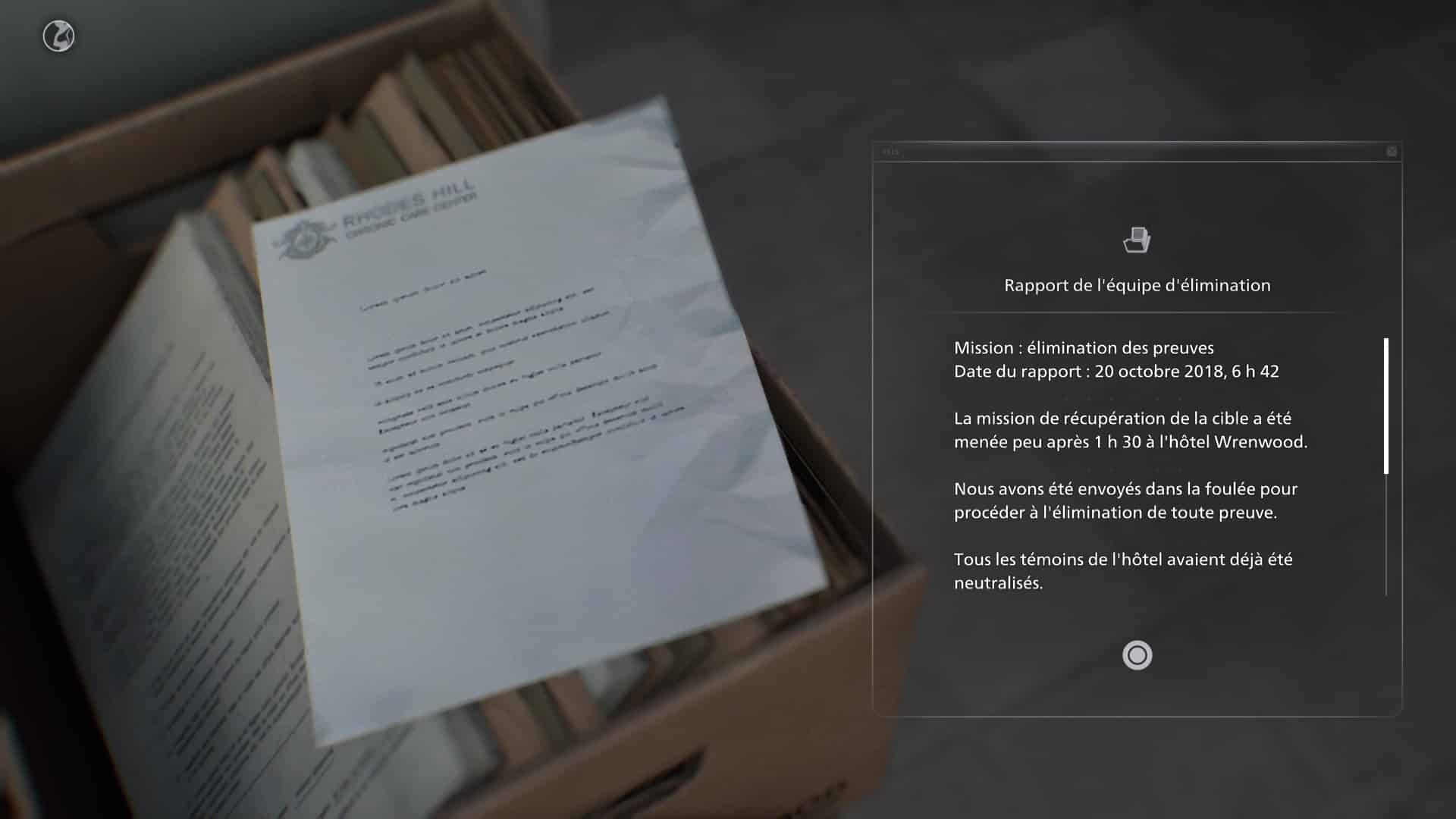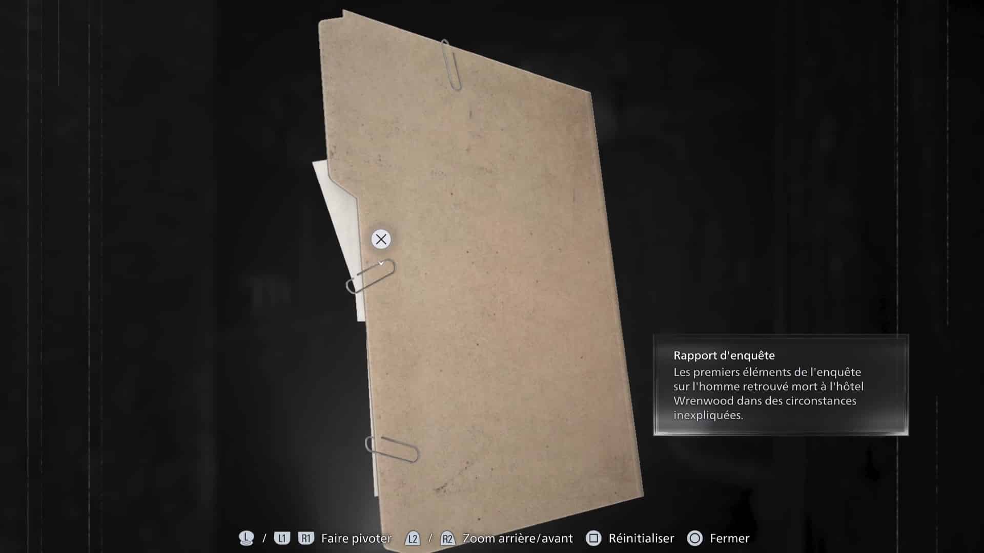 - Emplacement : Une fois pénétré dans l’hôtel par la Cuisine, avancez jusqu’à la porte. Une fois la cinématique passée, examinez le rapport d’enquête, puis faites-le pivoter de sorte à pouvoir l’ouvrir. Lisez-le ensuite.