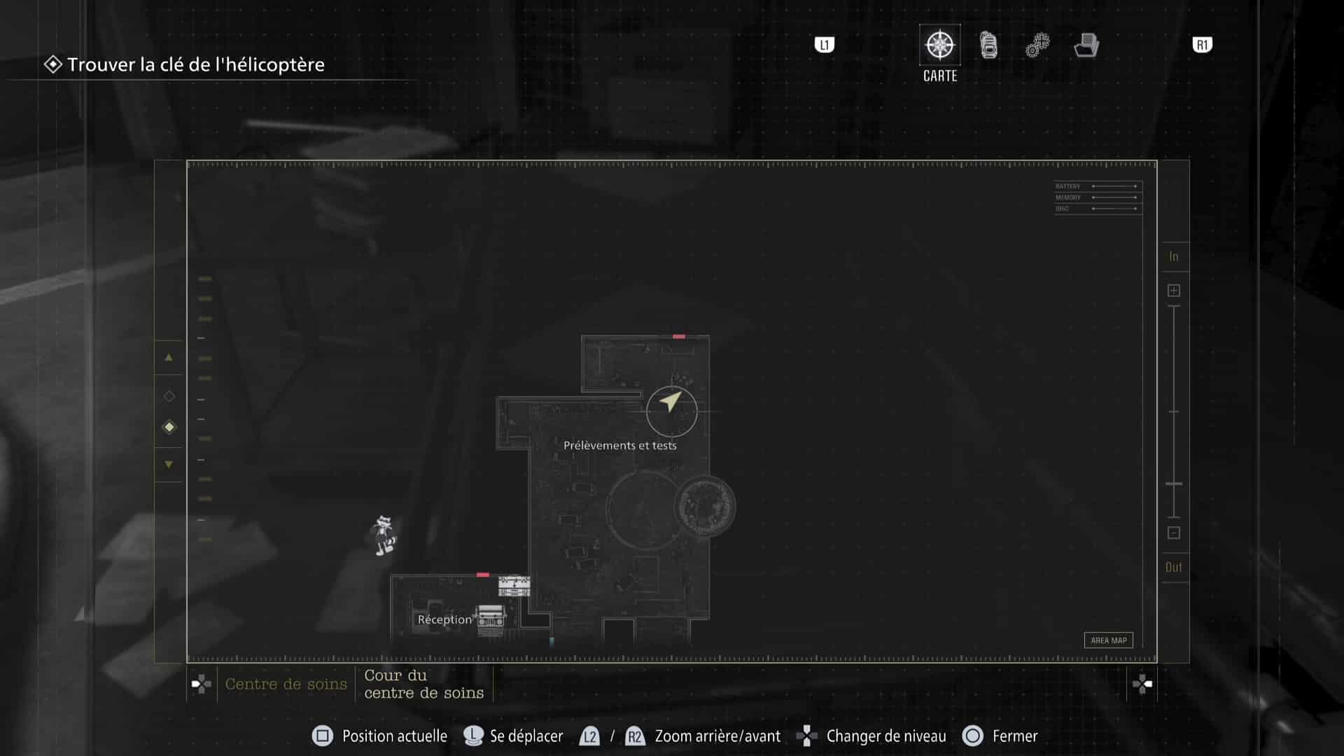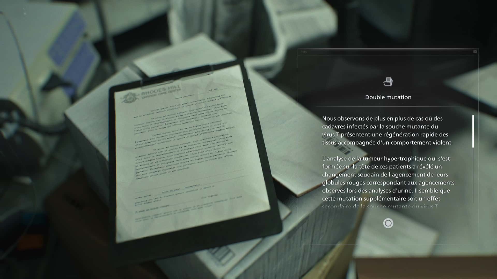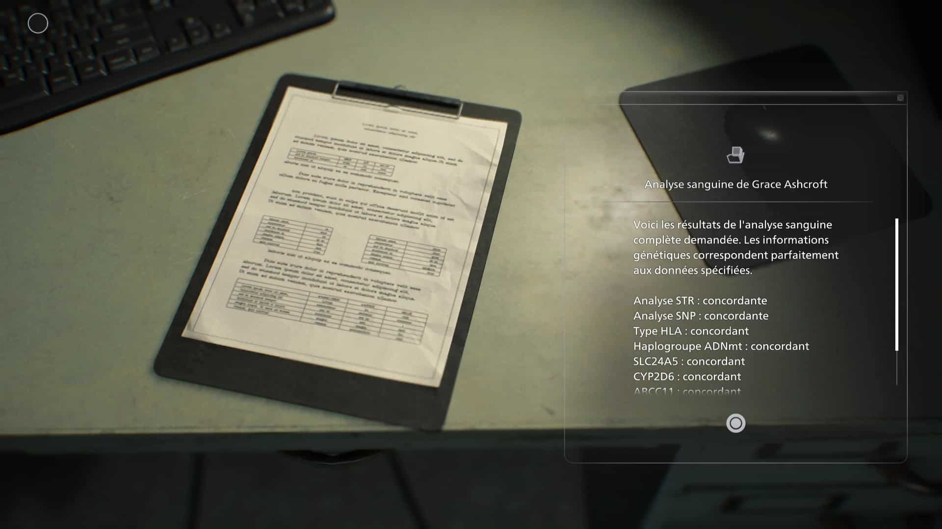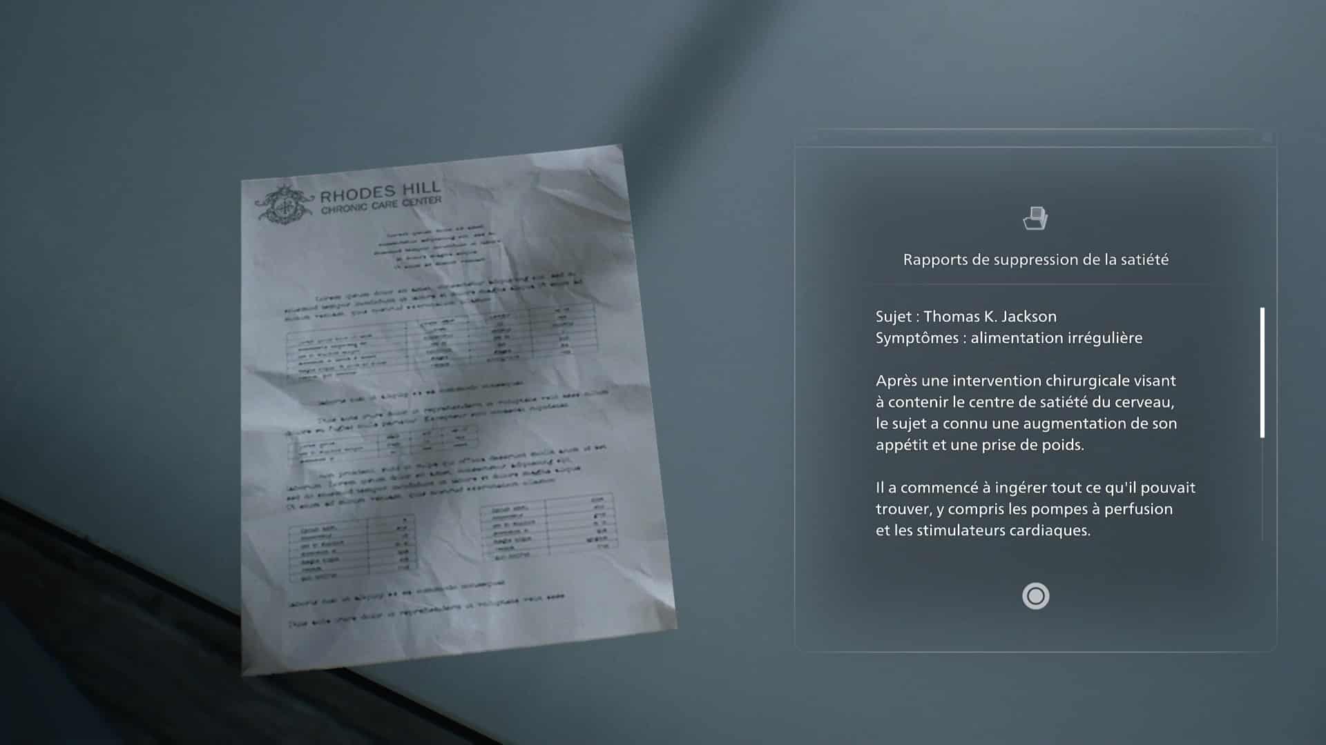 - Emplacement : Nécessite de posséder le bracelet d’identification (Nv.1). Allez dans le Laboratoire d’analyses sanguines au rez-de-chaussée et déverrouillez le point de sécurité Nv.1. Entrez dans la pièce désormais accessible et approchez du bureau. Le document vous attend dessus.