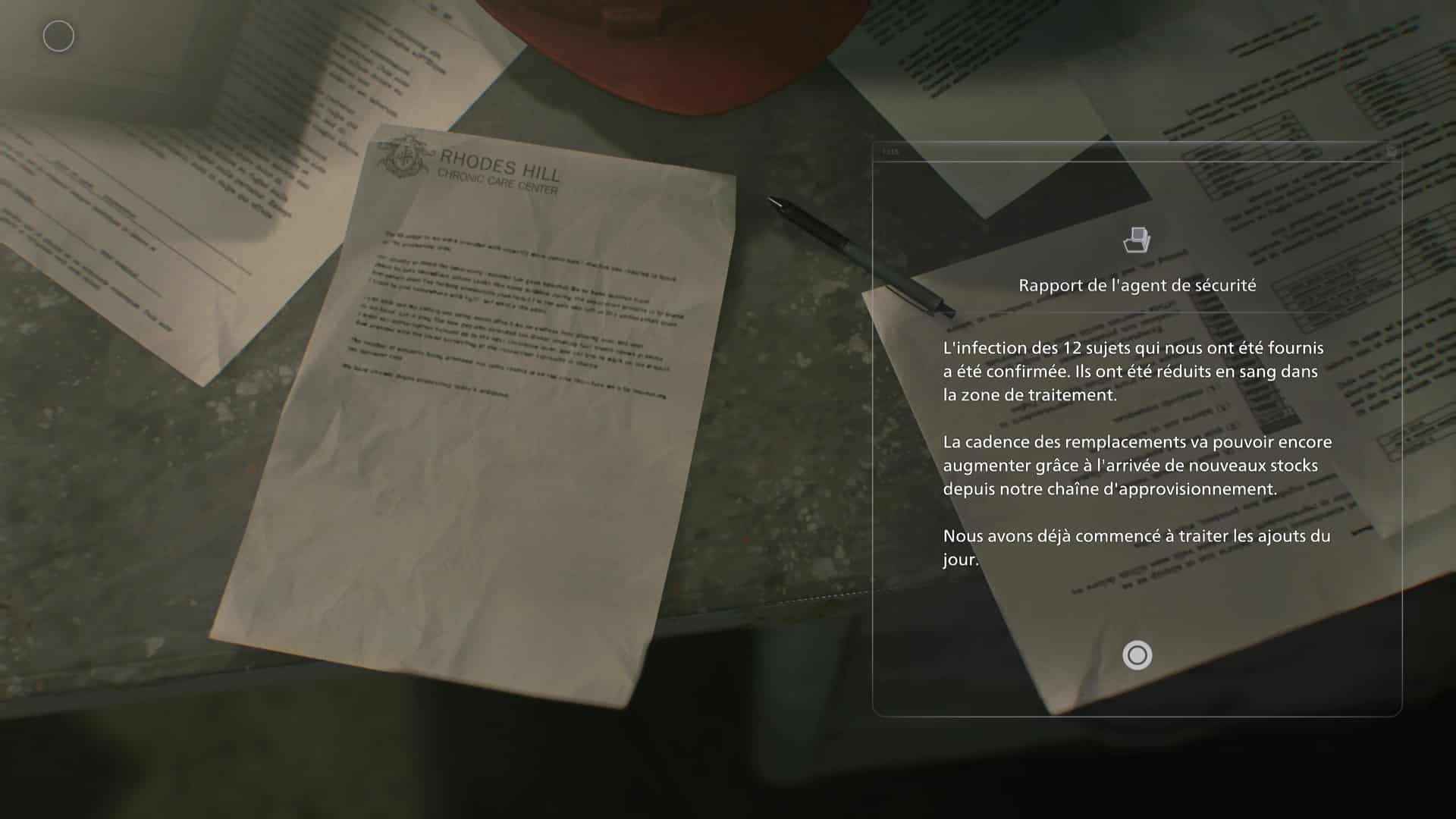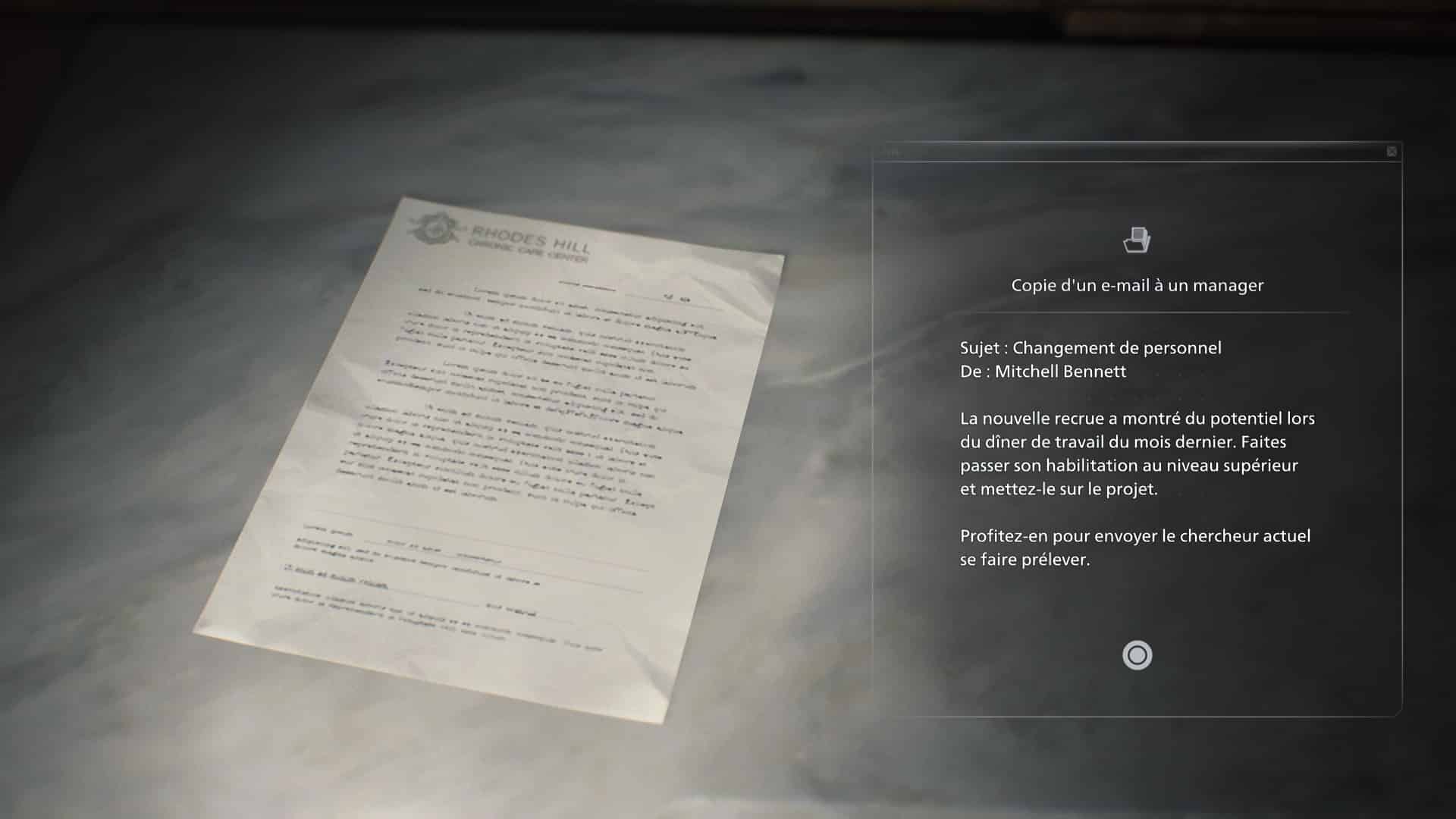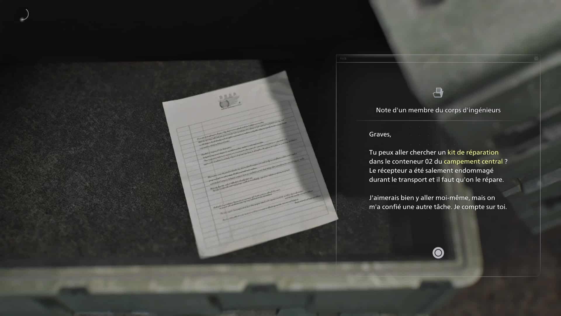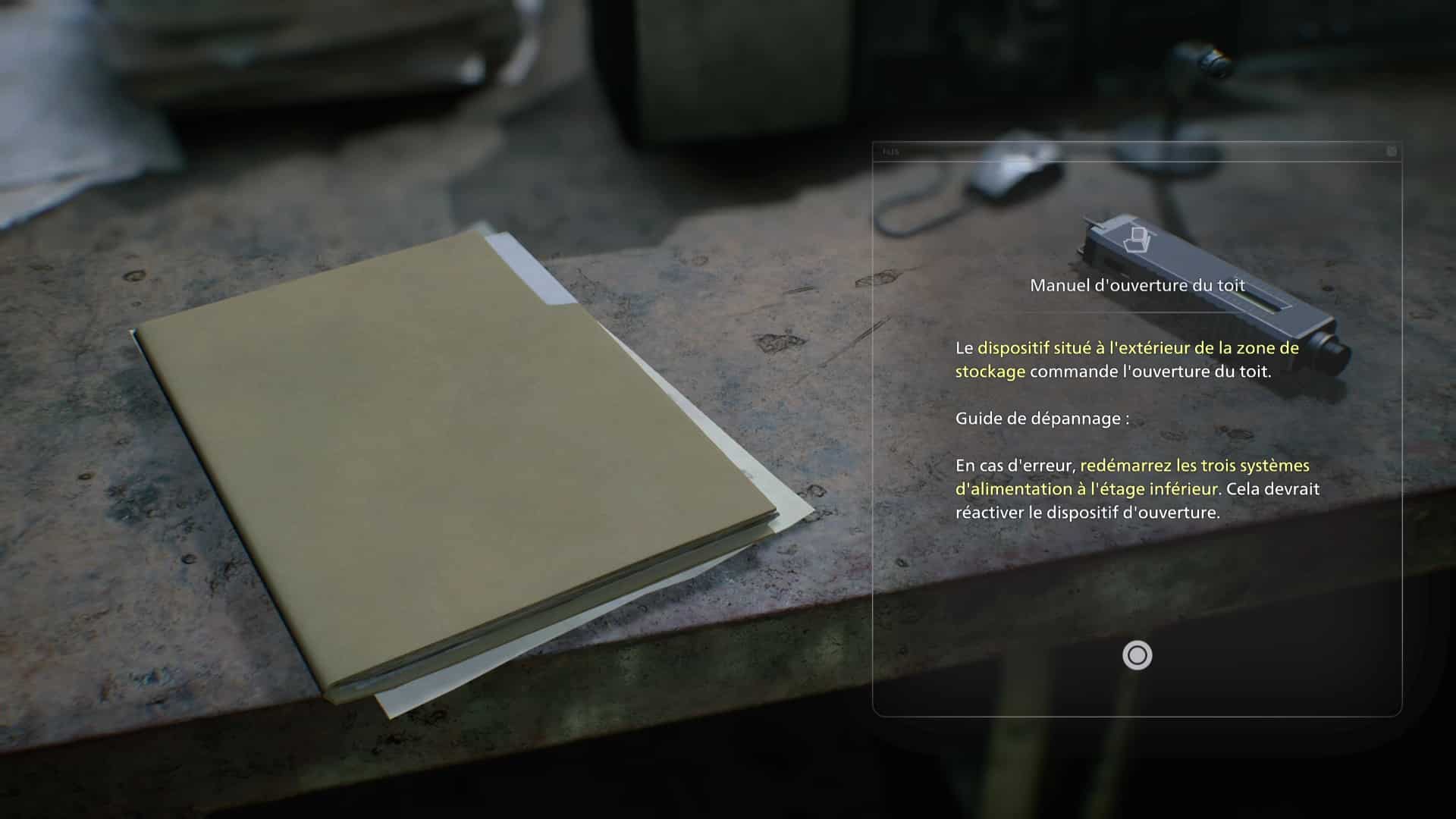 - Emplacement : Le document vous attend sur un bureau dans la Salle de sécurité, là où se trouve le point de sauvegarde de la zone.