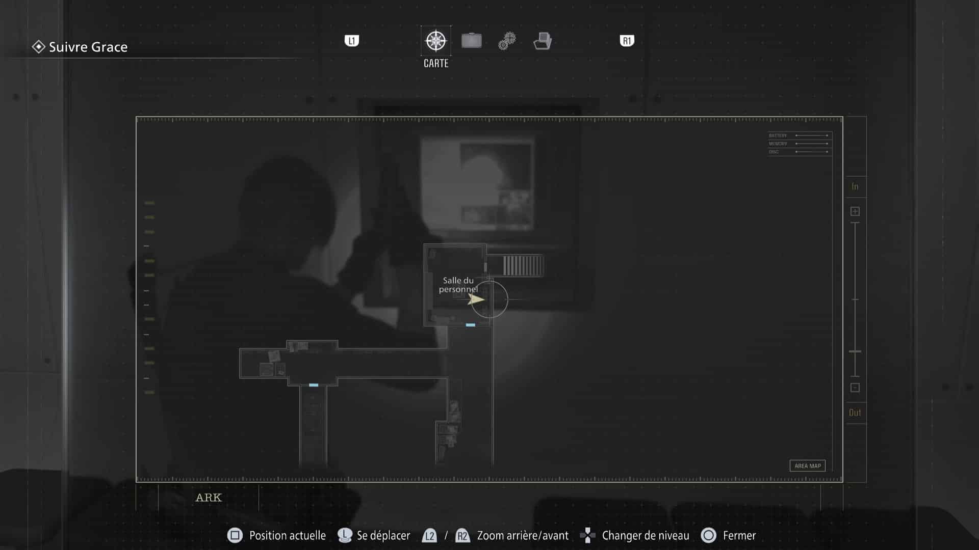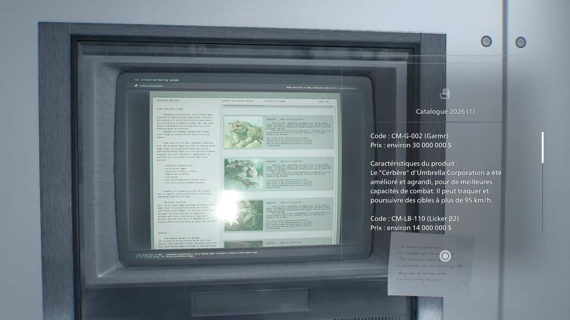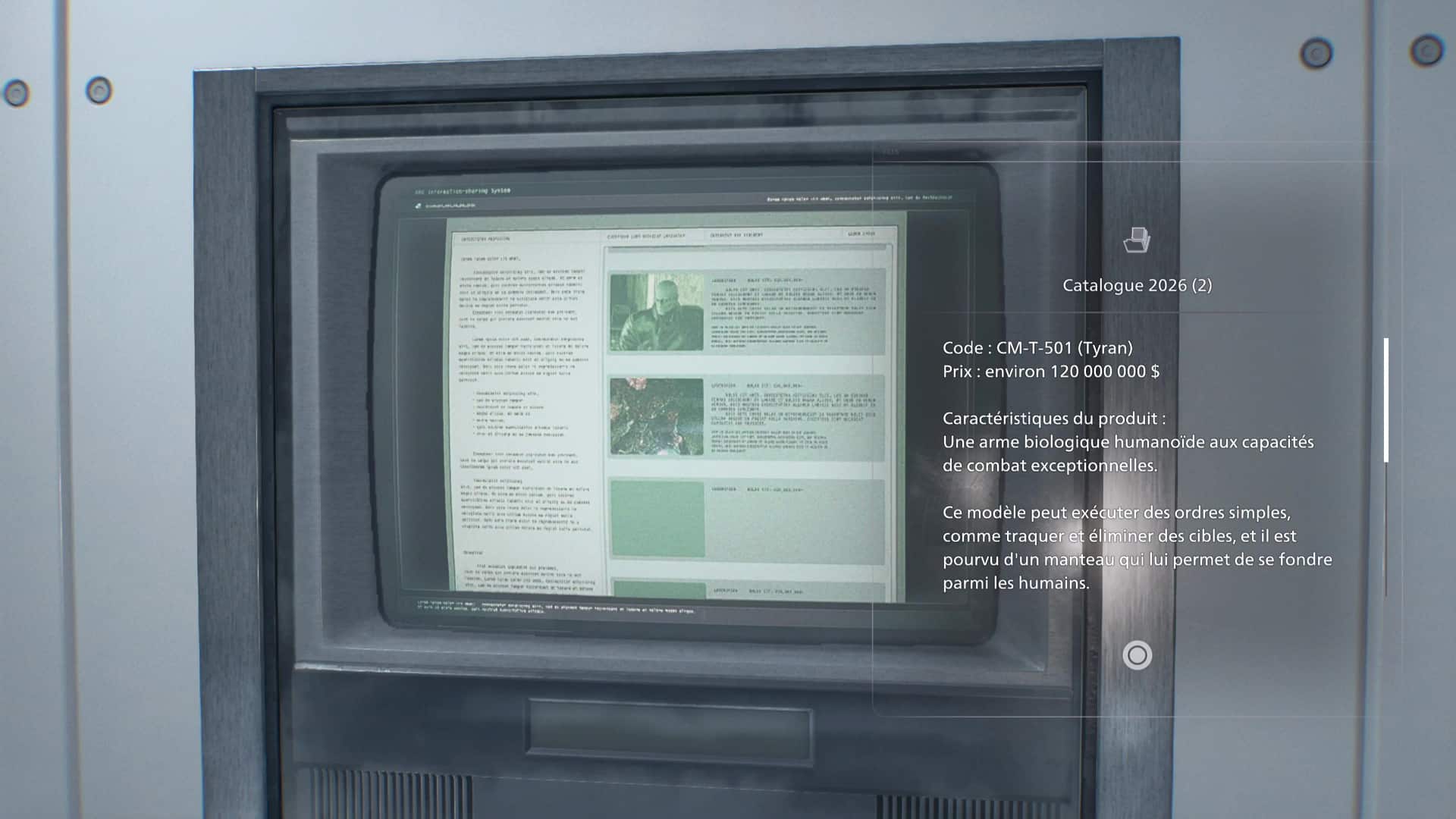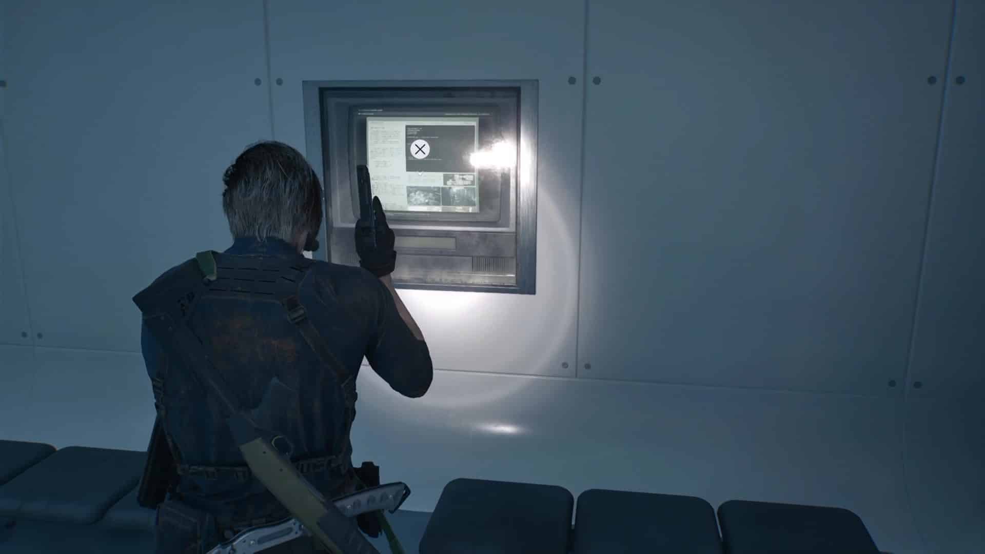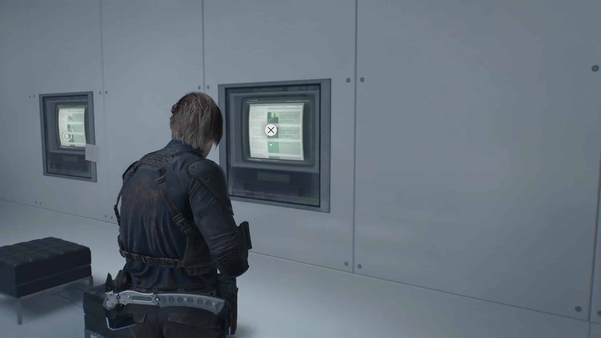 - Emplacement : En entrant dans la Salle du personnel, où se trouve le premier point de sauvegarde de la zone, il s’agit de l’écran sur le mur de droite.