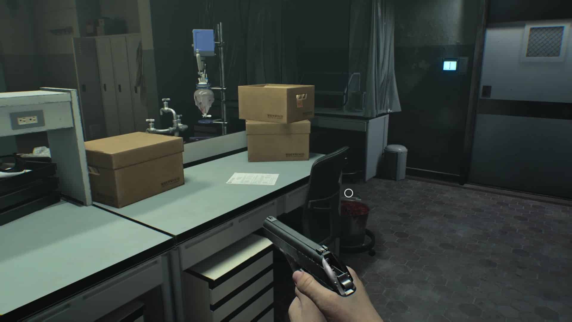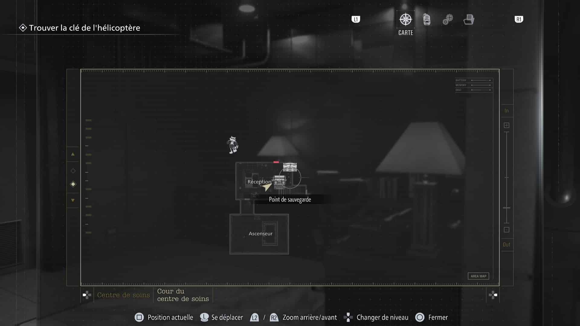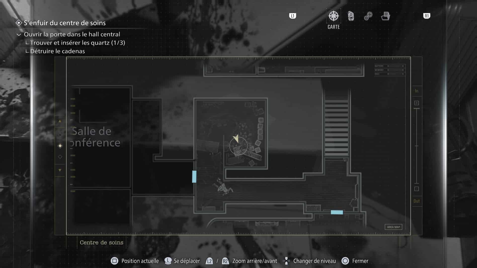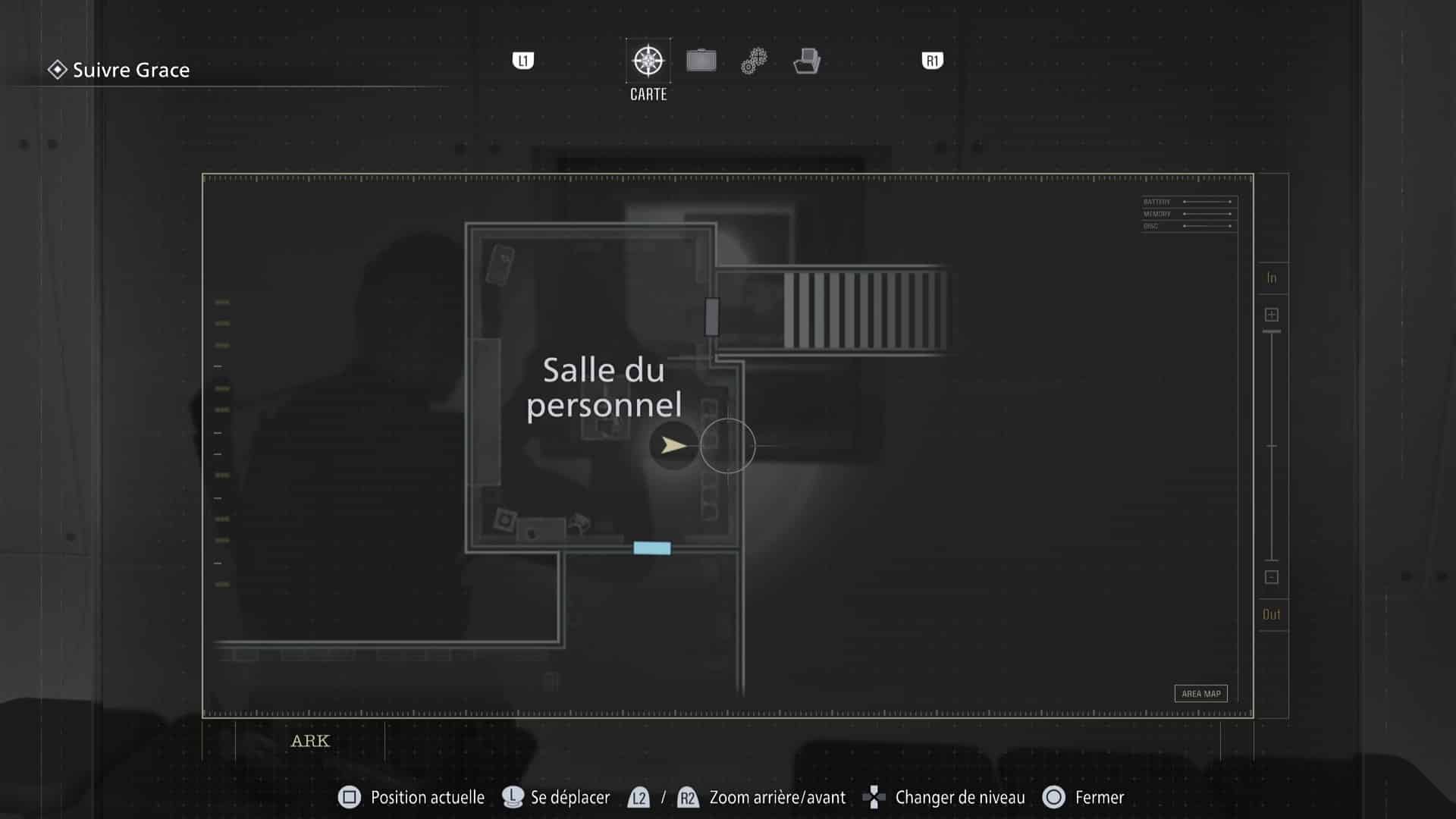 - Emplacement : En entrant dans la Salle du personnel, où se trouve le premier point de sauvegarde de la zone, il s’agit de l’écran sur le mur de droite.