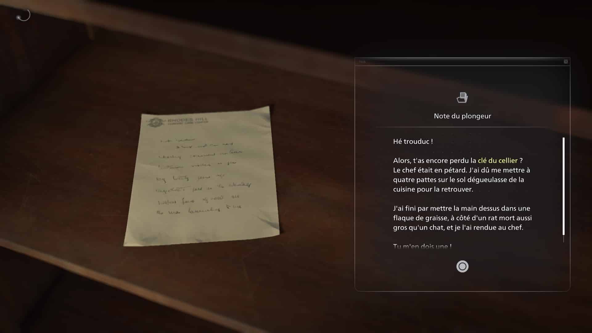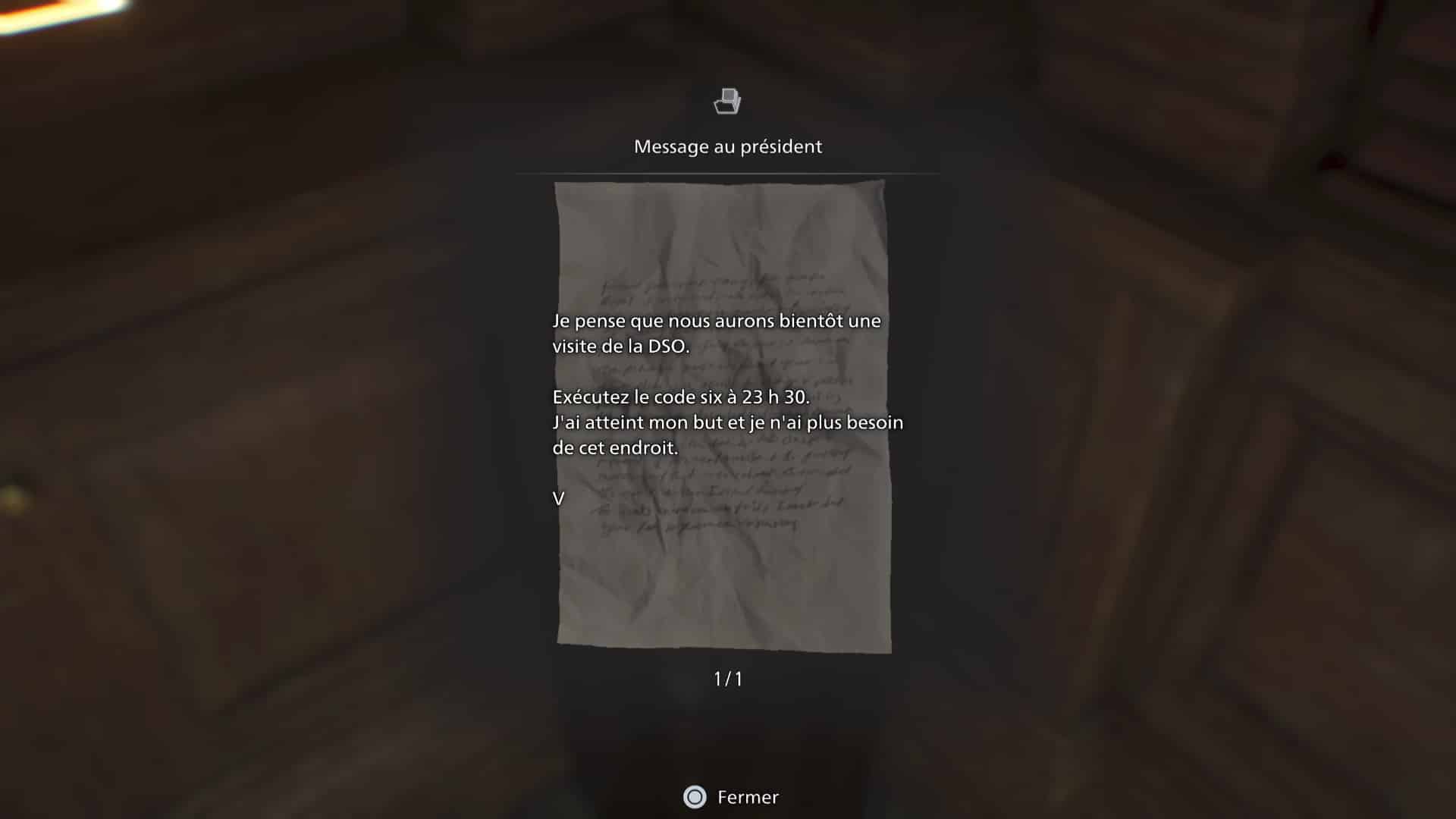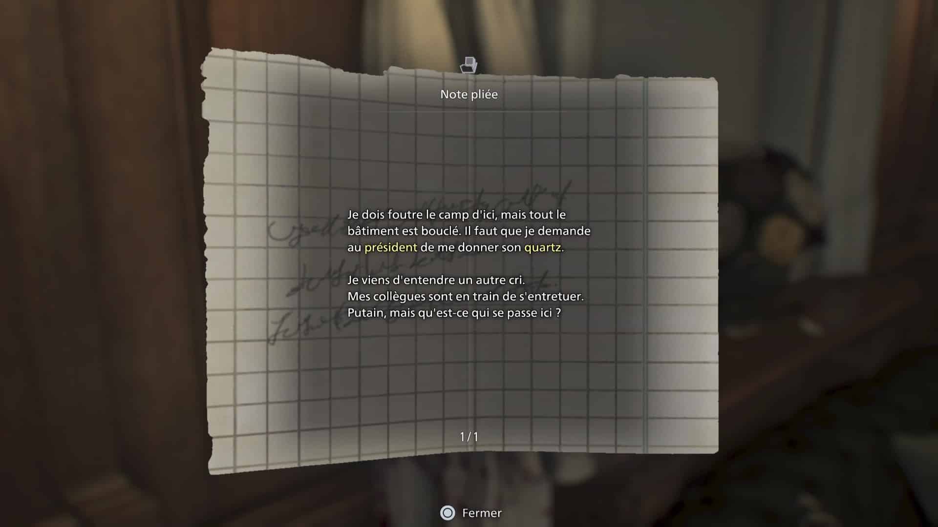 - Emplacement : Au 1ᵉʳ étage, dans le Bureau du président, fouillez la poubelle dans le coin de la pièce, à droite en entrant. Vous trouverez le message chiffonné dedans.