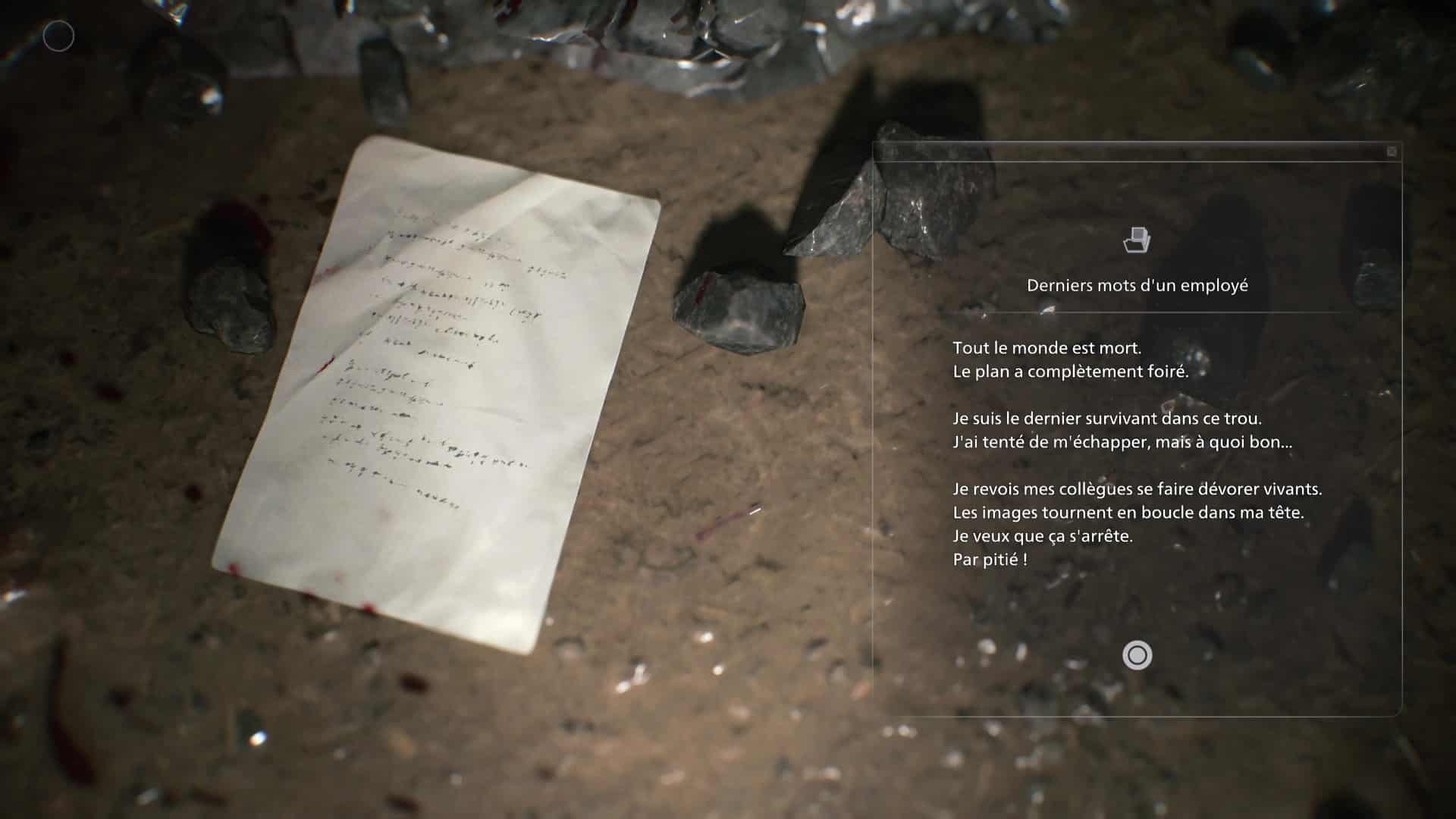 - Emplacement : Dès votre arrivée dans le sous-sol, faites quelques pas pour trouver la note à côté d’un cadavre.