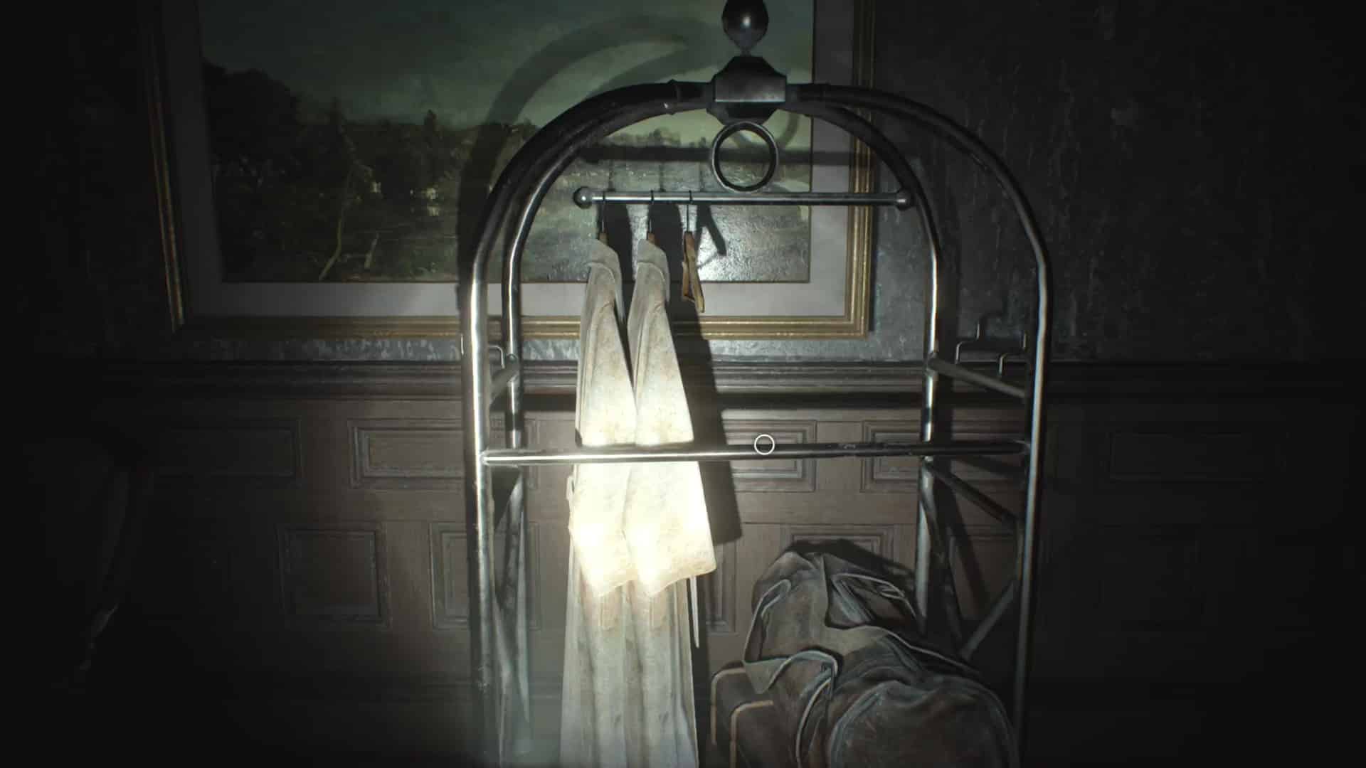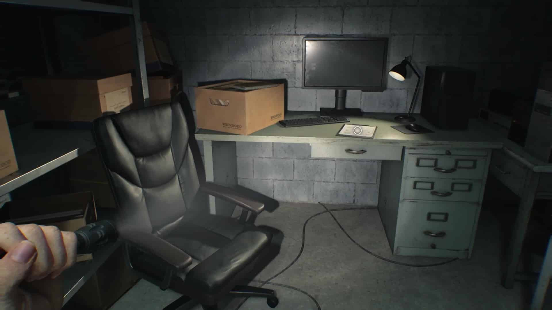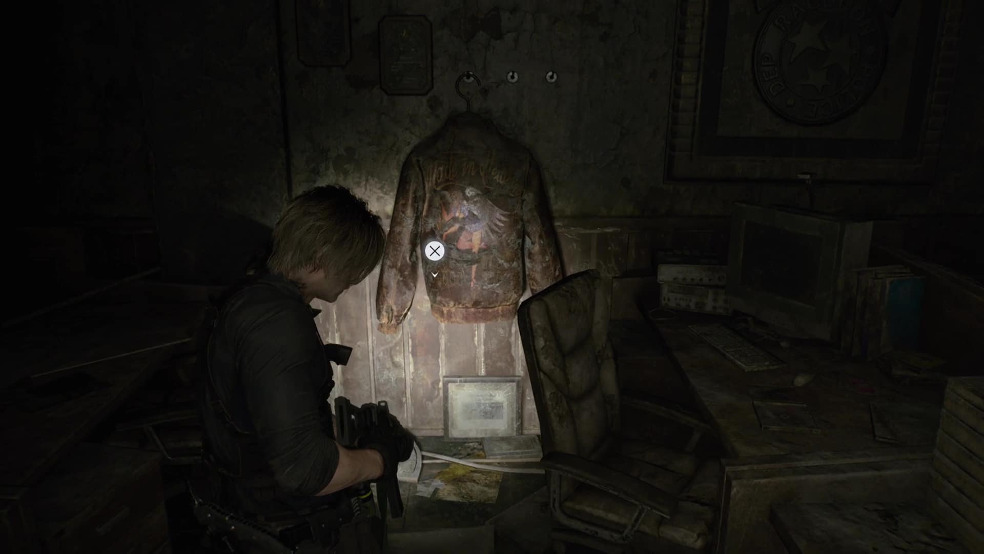 - Emplacement : Toujours dans le Bureau des S.T.A.R.S., au 1ᵉʳ étage, le premier indice d’une chasse au trésor se trouve dans un blouson accroché sur le mur opposé, entre deux rangées de bureau.