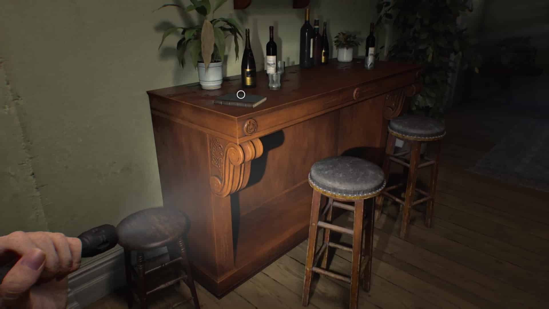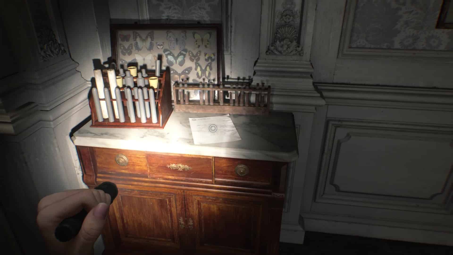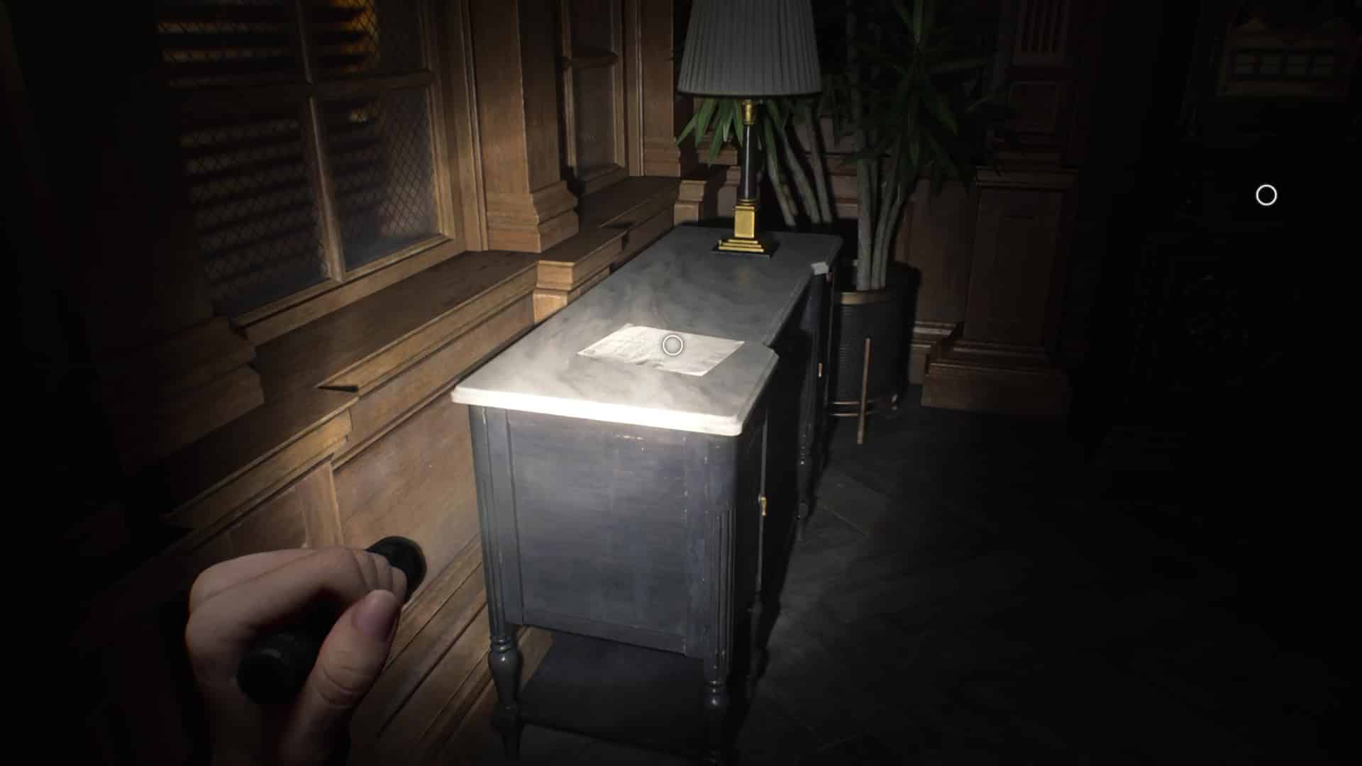 - Emplacement : Au 1ᵉʳ étage, dans la zone du Bar lounge et devant la porte du Bureau du président, il y a une petite zone dans laquelle se trouve des munitions et une herbe verte. Vous y trouverez aussi une bouse blanche ensanglantée, accrochée au mur. Examinez-la pour y récupérer la « Note pliée ».