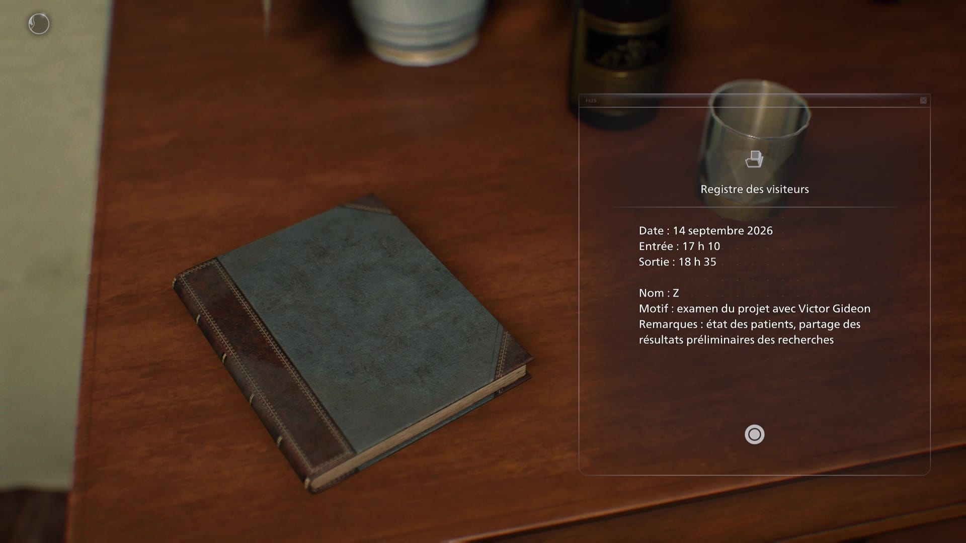 - Emplacement : Au 1ᵉʳ étage de l’aile est, dans le Bureau du chercheur en chef, le document se trouve dans le Carnet relié en cuir, obtenu en résolvant l’énigme du meuble à combinaison.
