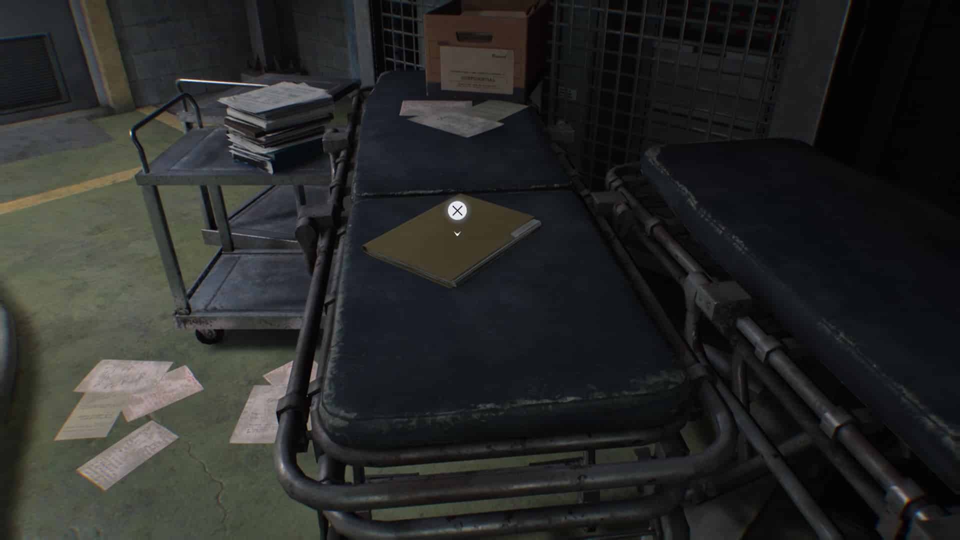 - Emplacement : Au sous-sol du Salon VIP, entrez dans la grande salle Prélèvements et tests contenant plein de zombies dans des caissons. Traversez la pièce pour apercevoir, au bout et sur votre droite, un dossier posé sur un brancard.