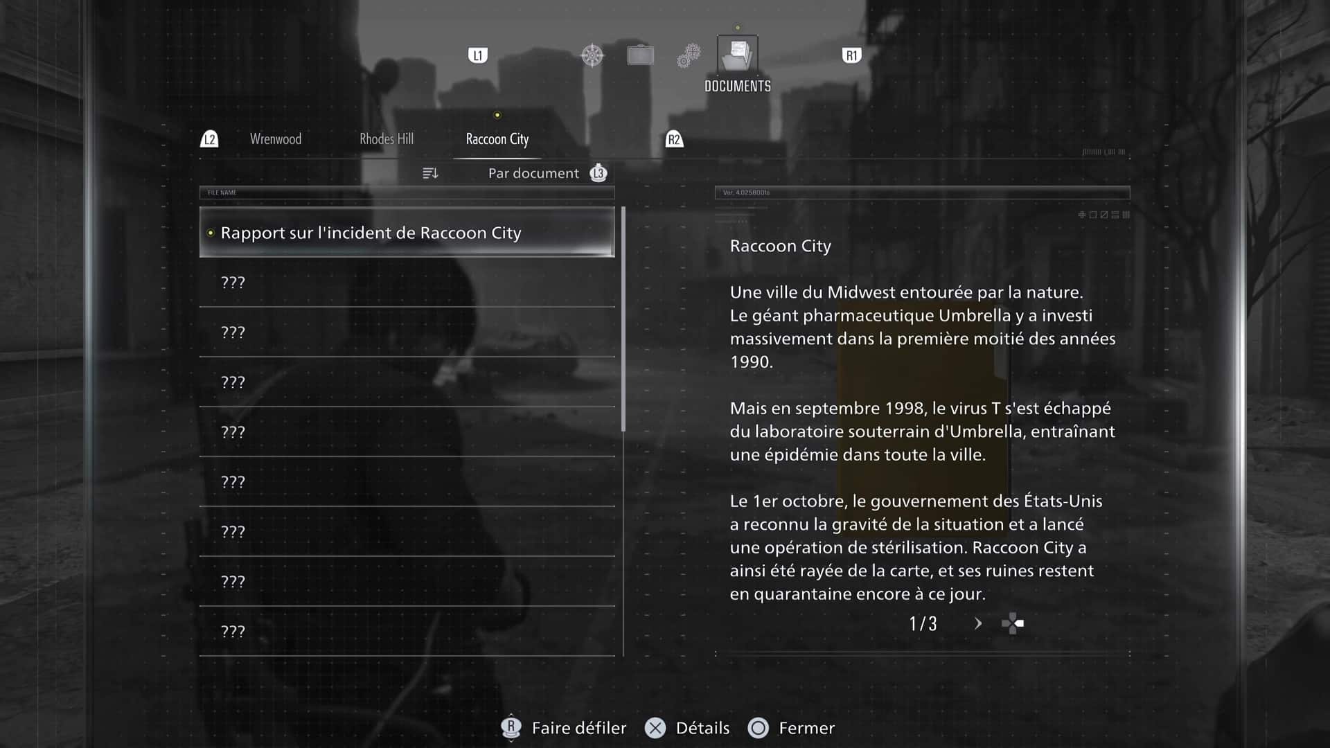 18 documents sont à récupérer dans la zone de Raccoon City, dont 1 obtenu automatiquement. Gardez à l’esprit que résoudre l’objectif principal de Raccoon City Est vous fait rejoindre le Centre de Raccoon City, sans possibilité de revenir en arrière. Faites donc tout ce que vous avez à faire avant de partir.