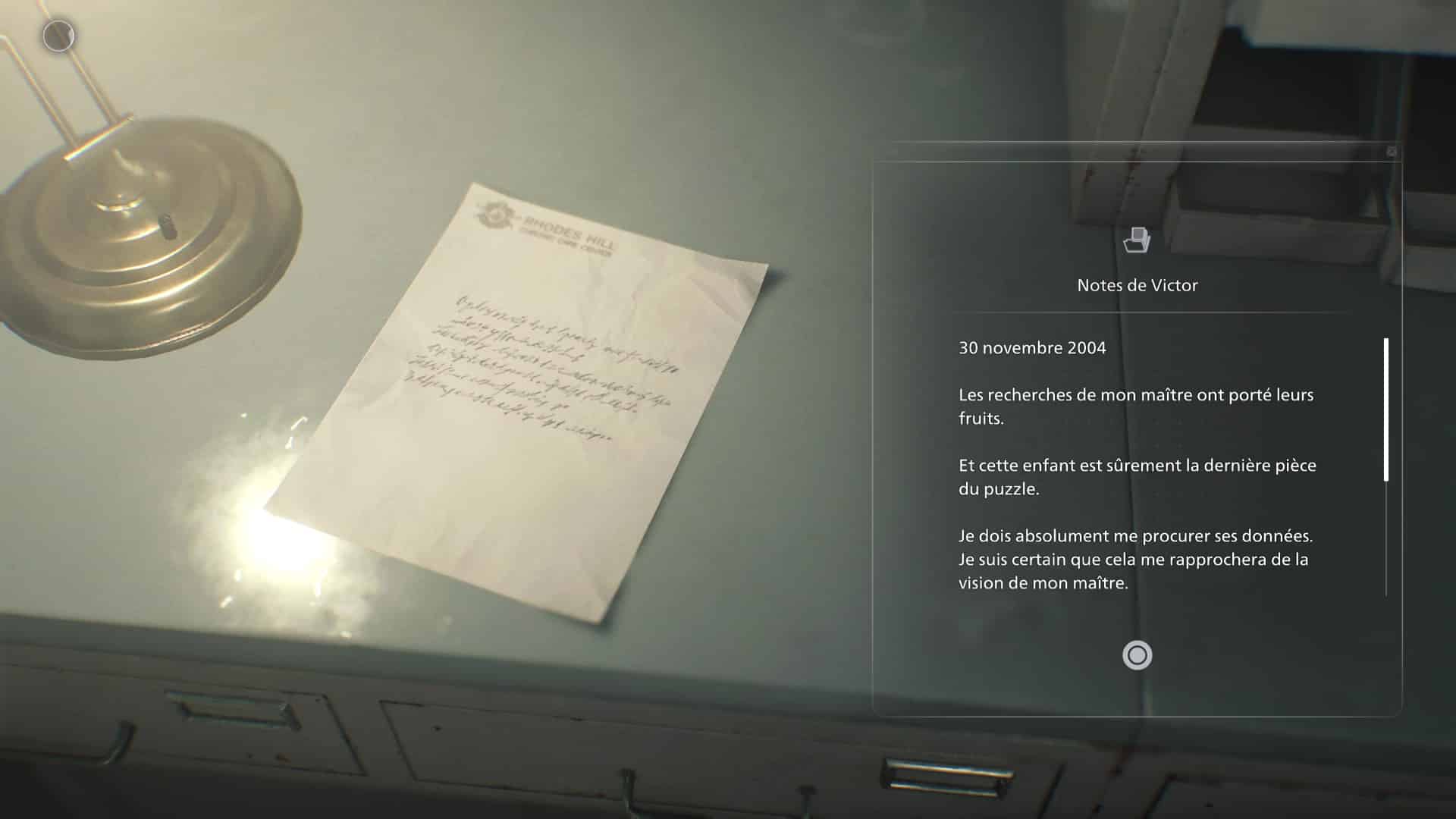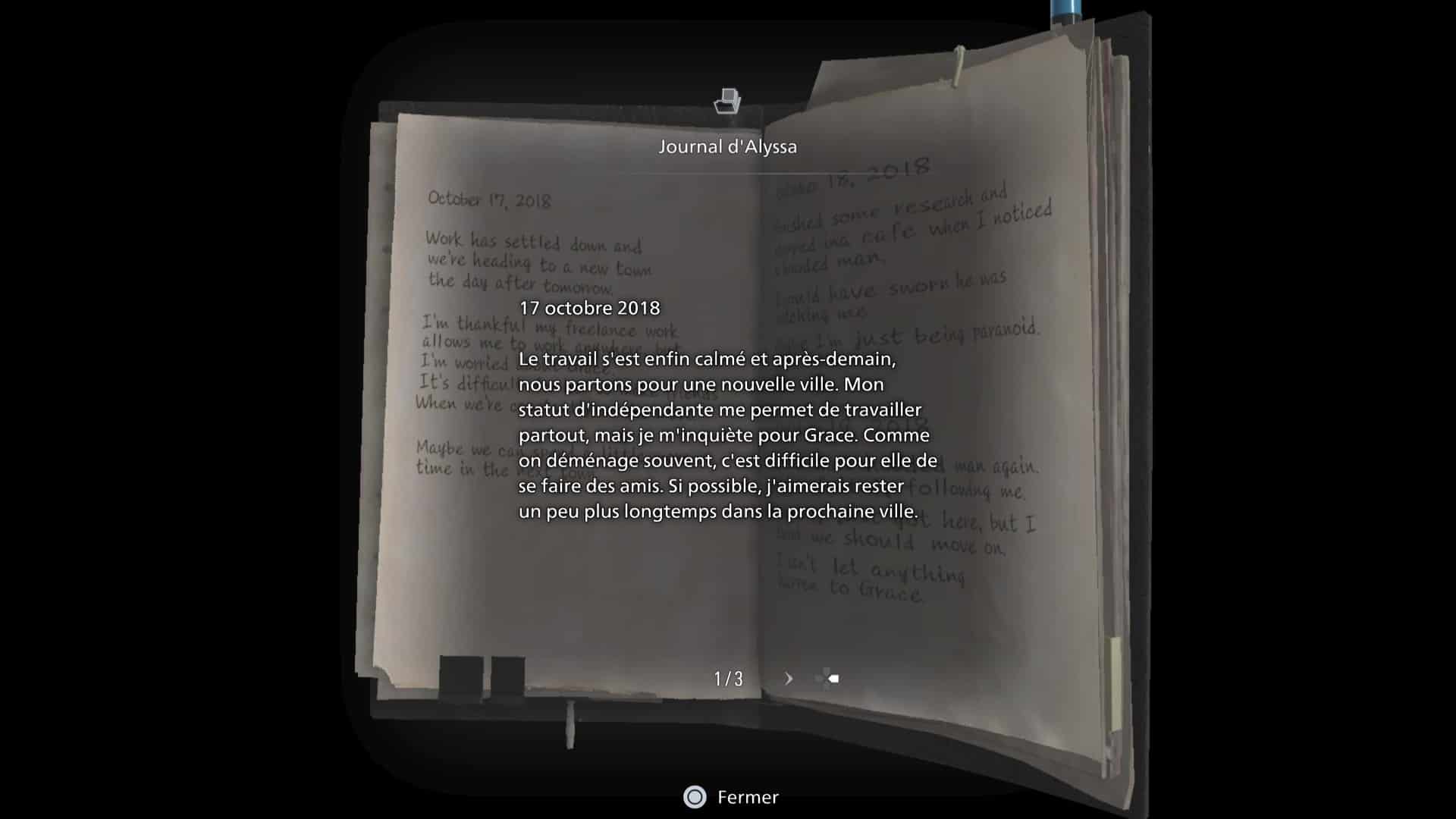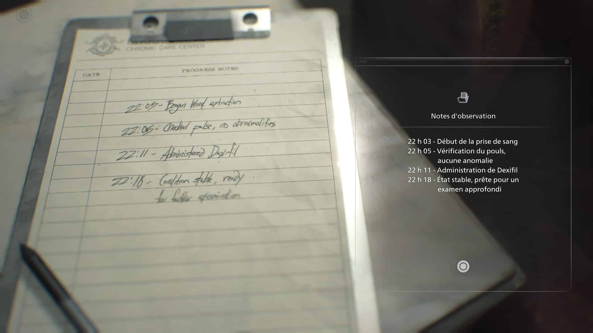 - Emplacement : Dès que vous prenez les commandes de Grace, au sein de la Chambre 203, examinez la petite table de chevet devant vous, les notes sont dessus.
